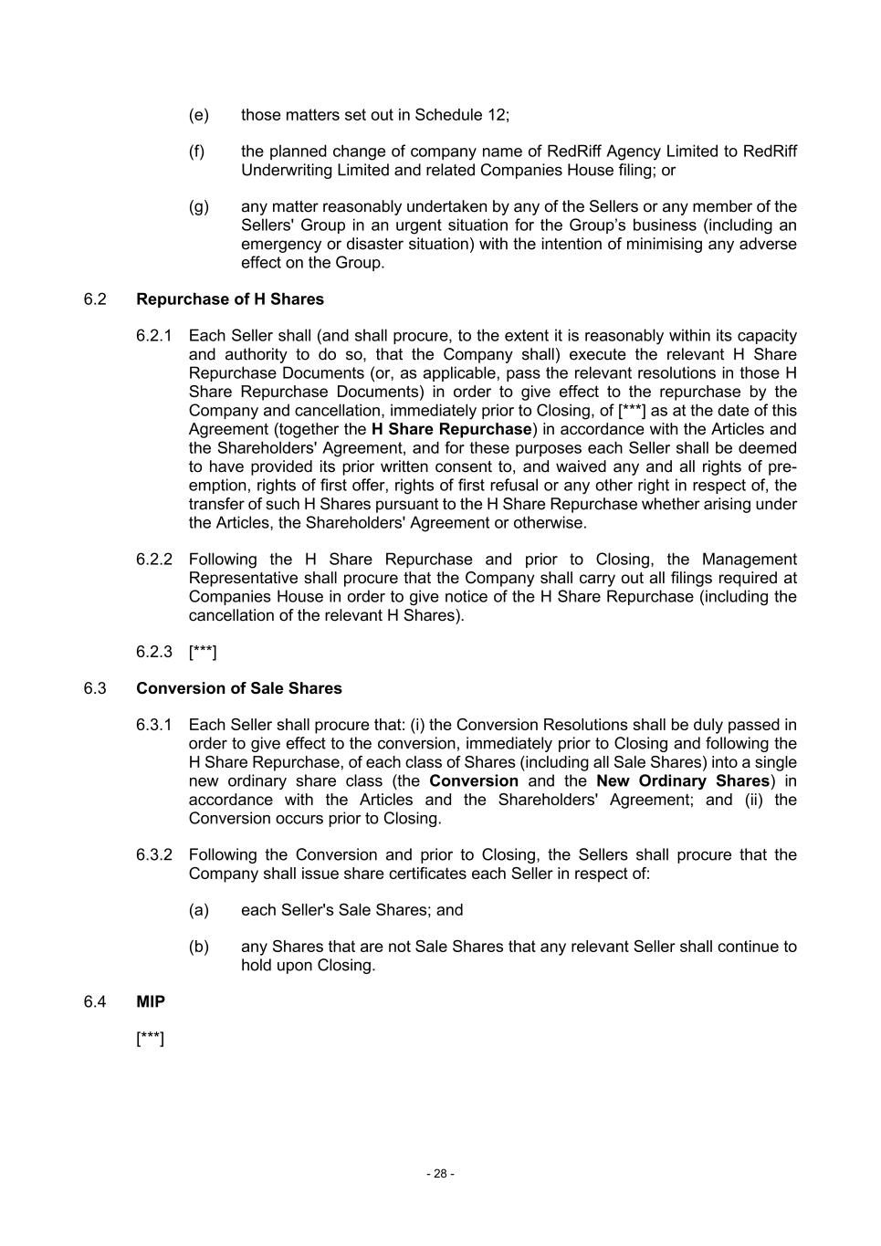 - 28 - (e) those matters set out in Schedule 12; (f) the planned change of company name of RedRiff Agency Limited to RedRiff Underwriting Limited and related Companies House filing; or (g) any matter reasonably undertaken by any of the Sellers or any member of the Sellers' Group in an urgent situation for the Group’s business (including an emergency or disaster situation) with the intention of minimising any adverse effect on the Group. 6.2 Repurchase of H Shares 6.2.1 Each Seller shall (and shall procure, to the extent it is reasonably within its capacity and authority to do so, that the Company shall) execute the relevant H Share Repurchase Documents (or, as applicable, pass the relevant resolutions in those H Share Repurchase Documents) in order to give effect to the repurchase by the Company and cancellation, immediately prior to Closing, of [***] as at the date of this Agreement (together the H Share Repurchase) in accordance with the Articles and the Shareholders' Agreement, and for these purposes each Seller shall be deemed to have provided its prior written consent to, and waived any and all rights of pre- emption, rights of first offer, rights of first refusal or any other right in respect of, the transfer of such H Shares pursuant to the H Share Repurchase whether arising under the Articles, the Shareholders' Agreement or otherwise. 6.2.2 Following the H Share Repurchase and prior to Closing, the Management Representative shall procure that the Company shall carry out all filings required at Companies House in order to give notice of the H Share Repurchase (including the cancellation of the relevant H Shares). 6.2.3 [***] 6.3 Conversion of Sale Shares 6.3.1 Each Seller shall procure that: (i) the Conversion Resolutions shall be duly passed in order to give effect to the conversion, immediately prior to Closing and following the H Share Repurchase, of each class of Shares (including all Sale Shares) into a single new ordinary share class (the Conversion and the New Ordinary Shares) in accordance with the Articles and the Shareholders' Agreement; and (ii) the Conversion occurs prior to Closing. 6.3.2 Following the Conversion and prior to Closing, the Sellers shall procure that the Company shall issue share certificates each Seller in respect of: (a) each Seller's Sale Shares; and (b) any Shares that are not Sale Shares that any relevant Seller shall continue to hold upon Closing. 6.4 MIP [***]