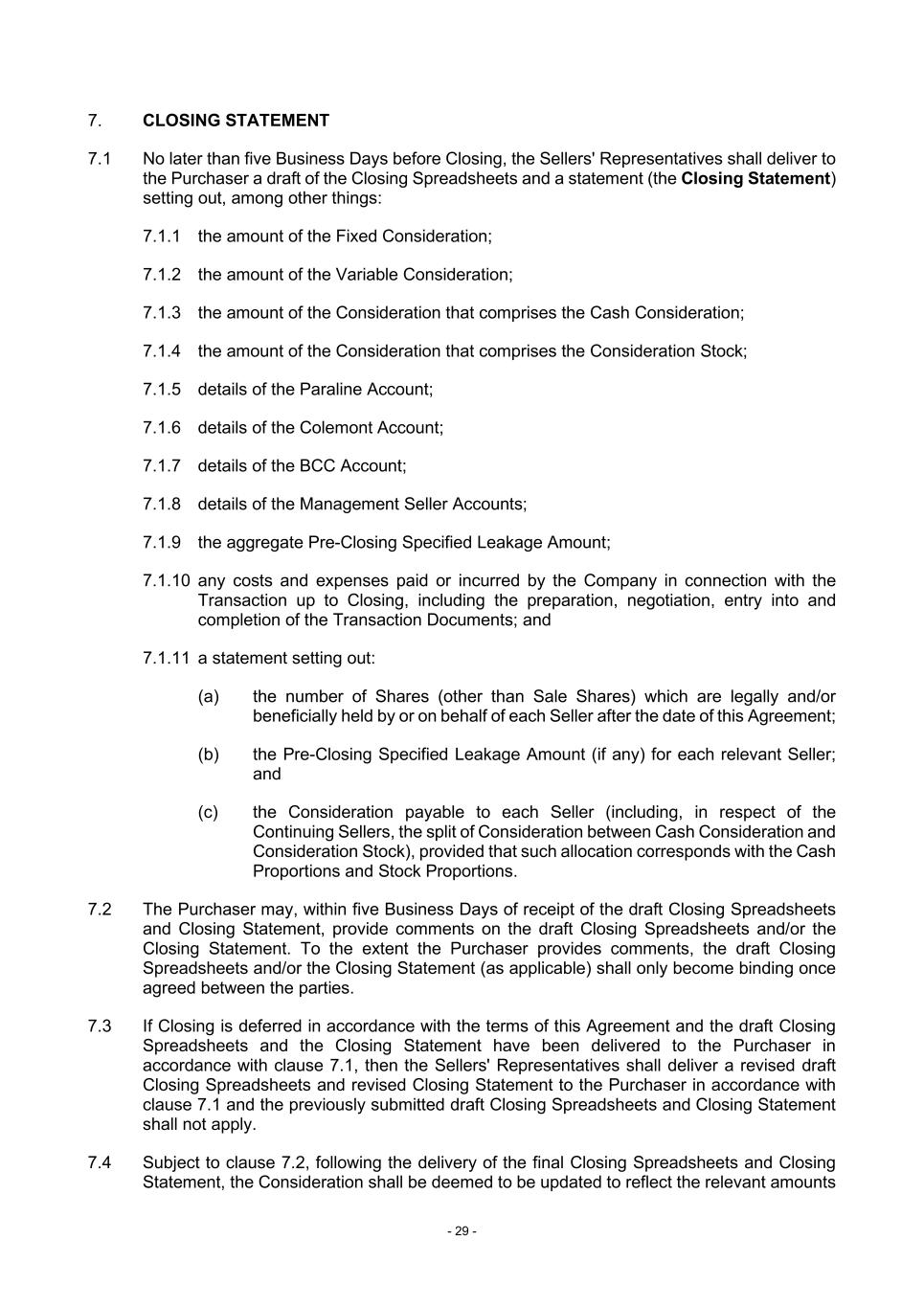 - 29 - 7. CLOSING STATEMENT 7.1 No later than five Business Days before Closing, the Sellers' Representatives shall deliver to the Purchaser a draft of the Closing Spreadsheets and a statement (the Closing Statement) setting out, among other things: 7.1.1 the amount of the Fixed Consideration; 7.1.2 the amount of the Variable Consideration; 7.1.3 the amount of the Consideration that comprises the Cash Consideration; 7.1.4 the amount of the Consideration that comprises the Consideration Stock; 7.1.5 details of the Paraline Account; 7.1.6 details of the Colemont Account; 7.1.7 details of the BCC Account; 7.1.8 details of the Management Seller Accounts; 7.1.9 the aggregate Pre-Closing Specified Leakage Amount; 7.1.10 any costs and expenses paid or incurred by the Company in connection with the Transaction up to Closing, including the preparation, negotiation, entry into and completion of the Transaction Documents; and 7.1.11 a statement setting out: (a) the number of Shares (other than Sale Shares) which are legally and/or beneficially held by or on behalf of each Seller after the date of this Agreement; (b) the Pre-Closing Specified Leakage Amount (if any) for each relevant Seller; and (c) the Consideration payable to each Seller (including, in respect of the Continuing Sellers, the split of Consideration between Cash Consideration and Consideration Stock), provided that such allocation corresponds with the Cash Proportions and Stock Proportions. 7.2 The Purchaser may, within five Business Days of receipt of the draft Closing Spreadsheets and Closing Statement, provide comments on the draft Closing Spreadsheets and/or the Closing Statement. To the extent the Purchaser provides comments, the draft Closing Spreadsheets and/or the Closing Statement (as applicable) shall only become binding once agreed between the parties. 7.3 If Closing is deferred in accordance with the terms of this Agreement and the draft Closing Spreadsheets and the Closing Statement have been delivered to the Purchaser in accordance with clause 7.1, then the Sellers' Representatives shall deliver a revised draft Closing Spreadsheets and revised Closing Statement to the Purchaser in accordance with clause 7.1 and the previously submitted draft Closing Spreadsheets and Closing Statement shall not apply. 7.4 Subject to clause 7.2, following the delivery of the final Closing Spreadsheets and Closing Statement, the Consideration shall be deemed to be updated to reflect the relevant amounts