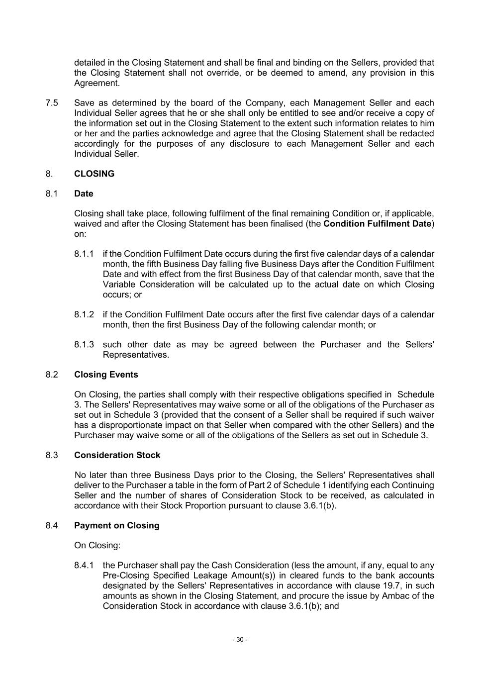 - 30 - detailed in the Closing Statement and shall be final and binding on the Sellers, provided that the Closing Statement shall not override, or be deemed to amend, any provision in this Agreement. 7.5 Save as determined by the board of the Company, each Management Seller and each Individual Seller agrees that he or she shall only be entitled to see and/or receive a copy of the information set out in the Closing Statement to the extent such information relates to him or her and the parties acknowledge and agree that the Closing Statement shall be redacted accordingly for the purposes of any disclosure to each Management Seller and each Individual Seller. 8. CLOSING 8.1 Date Closing shall take place, following fulfilment of the final remaining Condition or, if applicable, waived and after the Closing Statement has been finalised (the Condition Fulfilment Date) on: 8.1.1 if the Condition Fulfilment Date occurs during the first five calendar days of a calendar month, the fifth Business Day falling five Business Days after the Condition Fulfilment Date and with effect from the first Business Day of that calendar month, save that the Variable Consideration will be calculated up to the actual date on which Closing occurs; or 8.1.2 if the Condition Fulfilment Date occurs after the first five calendar days of a calendar month, then the first Business Day of the following calendar month; or 8.1.3 such other date as may be agreed between the Purchaser and the Sellers' Representatives. 8.2 Closing Events On Closing, the parties shall comply with their respective obligations specified in Schedule 3. The Sellers' Representatives may waive some or all of the obligations of the Purchaser as set out in Schedule 3 (provided that the consent of a Seller shall be required if such waiver has a disproportionate impact on that Seller when compared with the other Sellers) and the Purchaser may waive some or all of the obligations of the Sellers as set out in Schedule 3. 8.3 Consideration Stock No later than three Business Days prior to the Closing, the Sellers' Representatives shall deliver to the Purchaser a table in the form of Part 2 of Schedule 1 identifying each Continuing Seller and the number of shares of Consideration Stock to be received, as calculated in accordance with their Stock Proportion pursuant to clause 3.6.1(b). 8.4 Payment on Closing On Closing: 8.4.1 the Purchaser shall pay the Cash Consideration (less the amount, if any, equal to any Pre-Closing Specified Leakage Amount(s)) in cleared funds to the bank accounts designated by the Sellers' Representatives in accordance with clause 19.7, in such amounts as shown in the Closing Statement, and procure the issue by Ambac of the Consideration Stock in accordance with clause 3.6.1(b); and