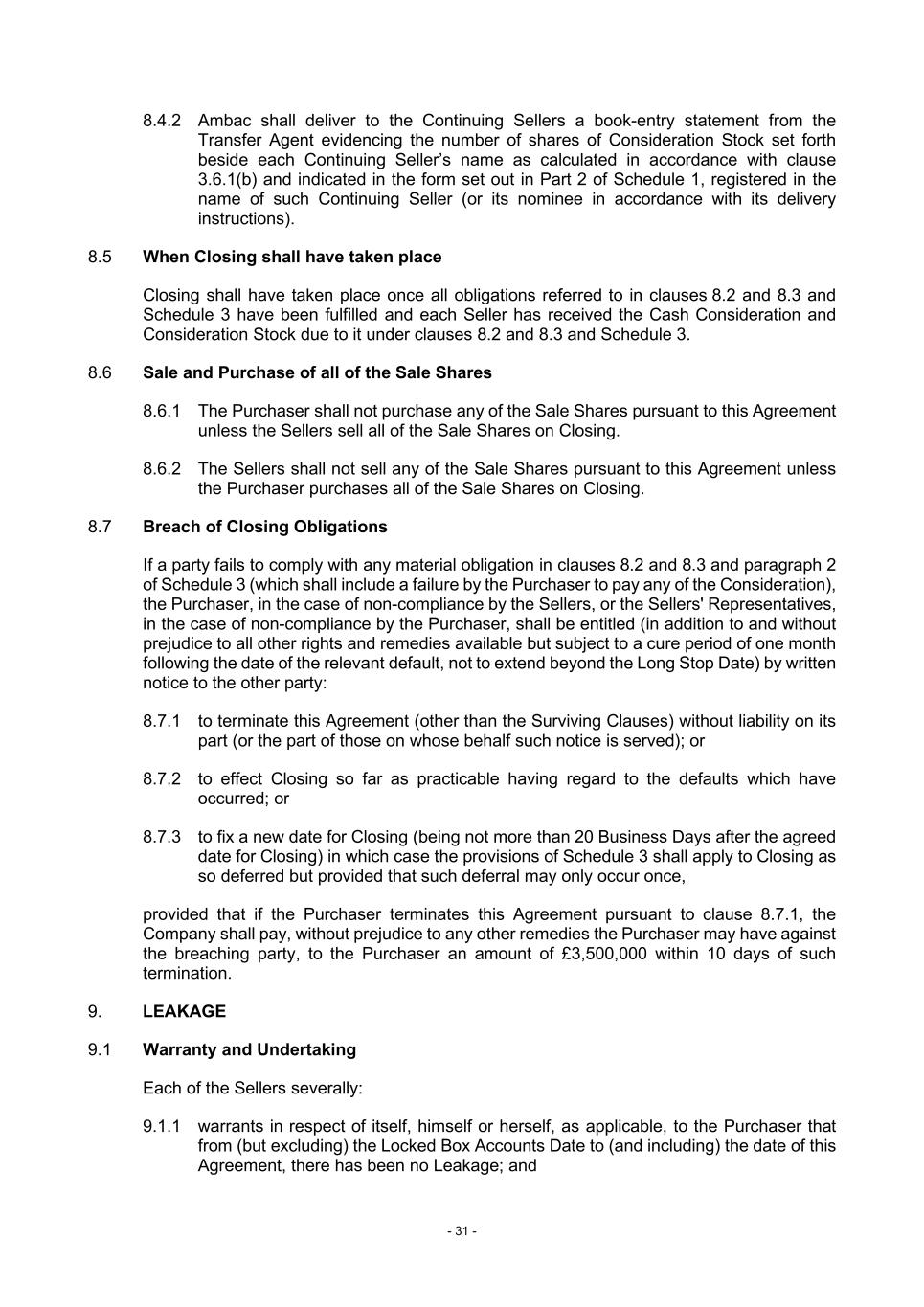 - 31 - 8.4.2 Ambac shall deliver to the Continuing Sellers a book-entry statement from the Transfer Agent evidencing the number of shares of Consideration Stock set forth beside each Continuing Seller’s name as calculated in accordance with clause 3.6.1(b) and indicated in the form set out in Part 2 of Schedule 1, registered in the name of such Continuing Seller (or its nominee in accordance with its delivery instructions). 8.5 When Closing shall have taken place Closing shall have taken place once all obligations referred to in clauses 8.2 and 8.3 and Schedule 3 have been fulfilled and each Seller has received the Cash Consideration and Consideration Stock due to it under clauses 8.2 and 8.3 and Schedule 3. 8.6 Sale and Purchase of all of the Sale Shares 8.6.1 The Purchaser shall not purchase any of the Sale Shares pursuant to this Agreement unless the Sellers sell all of the Sale Shares on Closing. 8.6.2 The Sellers shall not sell any of the Sale Shares pursuant to this Agreement unless the Purchaser purchases all of the Sale Shares on Closing. 8.7 Breach of Closing Obligations If a party fails to comply with any material obligation in clauses 8.2 and 8.3 and paragraph 2 of Schedule 3 (which shall include a failure by the Purchaser to pay any of the Consideration), the Purchaser, in the case of non-compliance by the Sellers, or the Sellers' Representatives, in the case of non-compliance by the Purchaser, shall be entitled (in addition to and without prejudice to all other rights and remedies available but subject to a cure period of one month following the date of the relevant default, not to extend beyond the Long Stop Date) by written notice to the other party: 8.7.1 to terminate this Agreement (other than the Surviving Clauses) without liability on its part (or the part of those on whose behalf such notice is served); or 8.7.2 to effect Closing so far as practicable having regard to the defaults which have occurred; or 8.7.3 to fix a new date for Closing (being not more than 20 Business Days after the agreed date for Closing) in which case the provisions of Schedule 3 shall apply to Closing as so deferred but provided that such deferral may only occur once, provided that if the Purchaser terminates this Agreement pursuant to clause 8.7.1, the Company shall pay, without prejudice to any other remedies the Purchaser may have against the breaching party, to the Purchaser an amount of £3,500,000 within 10 days of such termination. 9. LEAKAGE 9.1 Warranty and Undertaking Each of the Sellers severally: 9.1.1 warrants in respect of itself, himself or herself, as applicable, to the Purchaser that from (but excluding) the Locked Box Accounts Date to (and including) the date of this Agreement, there has been no Leakage; and