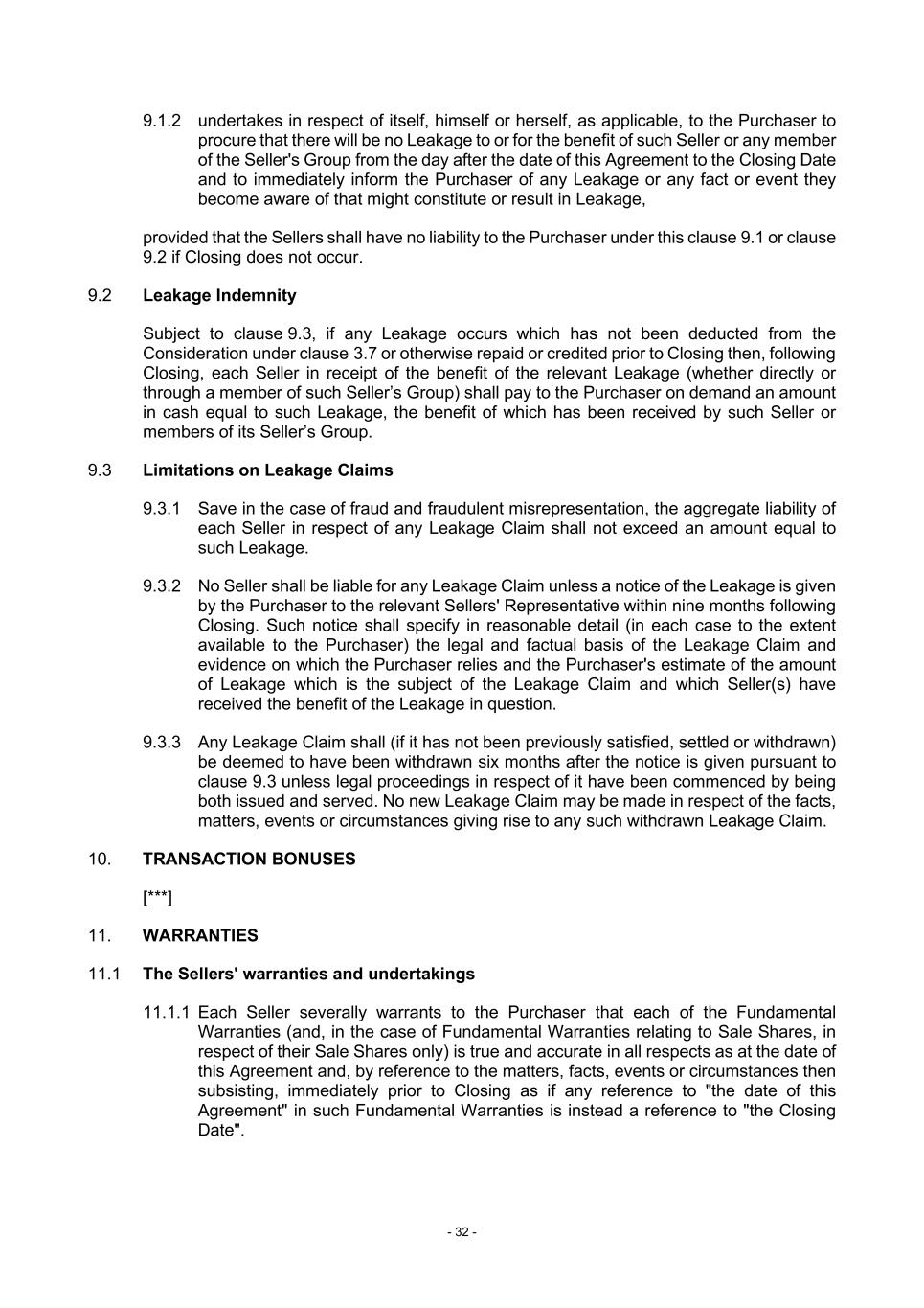 - 32 - 9.1.2 undertakes in respect of itself, himself or herself, as applicable, to the Purchaser to procure that there will be no Leakage to or for the benefit of such Seller or any member of the Seller's Group from the day after the date of this Agreement to the Closing Date and to immediately inform the Purchaser of any Leakage or any fact or event they become aware of that might constitute or result in Leakage, provided that the Sellers shall have no liability to the Purchaser under this clause 9.1 or clause 9.2 if Closing does not occur. 9.2 Leakage Indemnity Subject to clause 9.3, if any Leakage occurs which has not been deducted from the Consideration under clause 3.7 or otherwise repaid or credited prior to Closing then, following Closing, each Seller in receipt of the benefit of the relevant Leakage (whether directly or through a member of such Seller’s Group) shall pay to the Purchaser on demand an amount in cash equal to such Leakage, the benefit of which has been received by such Seller or members of its Seller’s Group. 9.3 Limitations on Leakage Claims 9.3.1 Save in the case of fraud and fraudulent misrepresentation, the aggregate liability of each Seller in respect of any Leakage Claim shall not exceed an amount equal to such Leakage. 9.3.2 No Seller shall be liable for any Leakage Claim unless a notice of the Leakage is given by the Purchaser to the relevant Sellers' Representative within nine months following Closing. Such notice shall specify in reasonable detail (in each case to the extent available to the Purchaser) the legal and factual basis of the Leakage Claim and evidence on which the Purchaser relies and the Purchaser's estimate of the amount of Leakage which is the subject of the Leakage Claim and which Seller(s) have received the benefit of the Leakage in question. 9.3.3 Any Leakage Claim shall (if it has not been previously satisfied, settled or withdrawn) be deemed to have been withdrawn six months after the notice is given pursuant to clause 9.3 unless legal proceedings in respect of it have been commenced by being both issued and served. No new Leakage Claim may be made in respect of the facts, matters, events or circumstances giving rise to any such withdrawn Leakage Claim. 10. TRANSACTION BONUSES [***] 11. WARRANTIES 11.1 The Sellers' warranties and undertakings 11.1.1 Each Seller severally warrants to the Purchaser that each of the Fundamental Warranties (and, in the case of Fundamental Warranties relating to Sale Shares, in respect of their Sale Shares only) is true and accurate in all respects as at the date of this Agreement and, by reference to the matters, facts, events or circumstances then subsisting, immediately prior to Closing as if any reference to "the date of this Agreement" in such Fundamental Warranties is instead a reference to "the Closing Date".