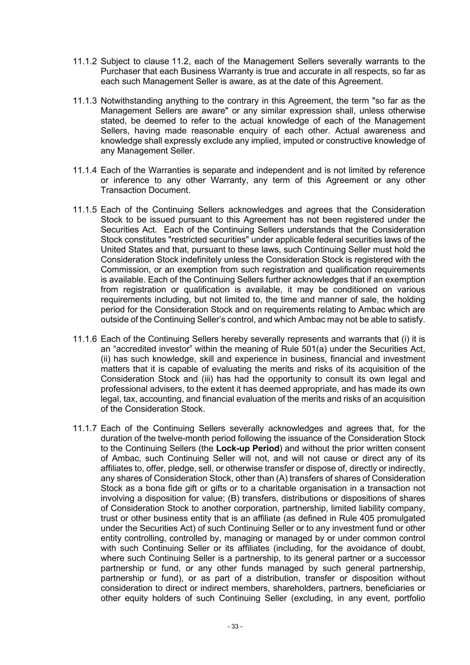 - 33 - 11.1.2 Subject to clause 11.2, each of the Management Sellers severally warrants to the Purchaser that each Business Warranty is true and accurate in all respects, so far as each such Management Seller is aware, as at the date of this Agreement. 11.1.3 Notwithstanding anything to the contrary in this Agreement, the term "so far as the Management Sellers are aware" or any similar expression shall, unless otherwise stated, be deemed to refer to the actual knowledge of each of the Management Sellers, having made reasonable enquiry of each other. Actual awareness and knowledge shall expressly exclude any implied, imputed or constructive knowledge of any Management Seller. 11.1.4 Each of the Warranties is separate and independent and is not limited by reference or inference to any other Warranty, any term of this Agreement or any other Transaction Document. 11.1.5 Each of the Continuing Sellers acknowledges and agrees that the Consideration Stock to be issued pursuant to this Agreement has not been registered under the Securities Act. Each of the Continuing Sellers understands that the Consideration Stock constitutes "restricted securities" under applicable federal securities laws of the United States and that, pursuant to these laws, such Continuing Seller must hold the Consideration Stock indefinitely unless the Consideration Stock is registered with the Commission, or an exemption from such registration and qualification requirements is available. Each of the Continuing Sellers further acknowledges that if an exemption from registration or qualification is available, it may be conditioned on various requirements including, but not limited to, the time and manner of sale, the holding period for the Consideration Stock and on requirements relating to Ambac which are outside of the Continuing Seller’s control, and which Ambac may not be able to satisfy. 11.1.6 Each of the Continuing Sellers hereby severally represents and warrants that (i) it is an “accredited investor” within the meaning of Rule 501(a) under the Securities Act, (ii) has such knowledge, skill and experience in business, financial and investment matters that it is capable of evaluating the merits and risks of its acquisition of the Consideration Stock and (iii) has had the opportunity to consult its own legal and professional advisers, to the extent it has deemed appropriate, and has made its own legal, tax, accounting, and financial evaluation of the merits and risks of an acquisition of the Consideration Stock. 11.1.7 Each of the Continuing Sellers severally acknowledges and agrees that, for the duration of the twelve-month period following the issuance of the Consideration Stock to the Continuing Sellers (the Lock-up Period) and without the prior written consent of Ambac, such Continuing Seller will not, and will not cause or direct any of its affiliates to, offer, pledge, sell, or otherwise transfer or dispose of, directly or indirectly, any shares of Consideration Stock, other than (A) transfers of shares of Consideration Stock as a bona fide gift or gifts or to a charitable organisation in a transaction not involving a disposition for value; (B) transfers, distributions or dispositions of shares of Consideration Stock to another corporation, partnership, limited liability company, trust or other business entity that is an affiliate (as defined in Rule 405 promulgated under the Securities Act) of such Continuing Seller or to any investment fund or other entity controlling, controlled by, managing or managed by or under common control with such Continuing Seller or its affiliates (including, for the avoidance of doubt, where such Continuing Seller is a partnership, to its general partner or a successor partnership or fund, or any other funds managed by such general partnership, partnership or fund), or as part of a distribution, transfer or disposition without consideration to direct or indirect members, shareholders, partners, beneficiaries or other equity holders of such Continuing Seller (excluding, in any event, portfolio
