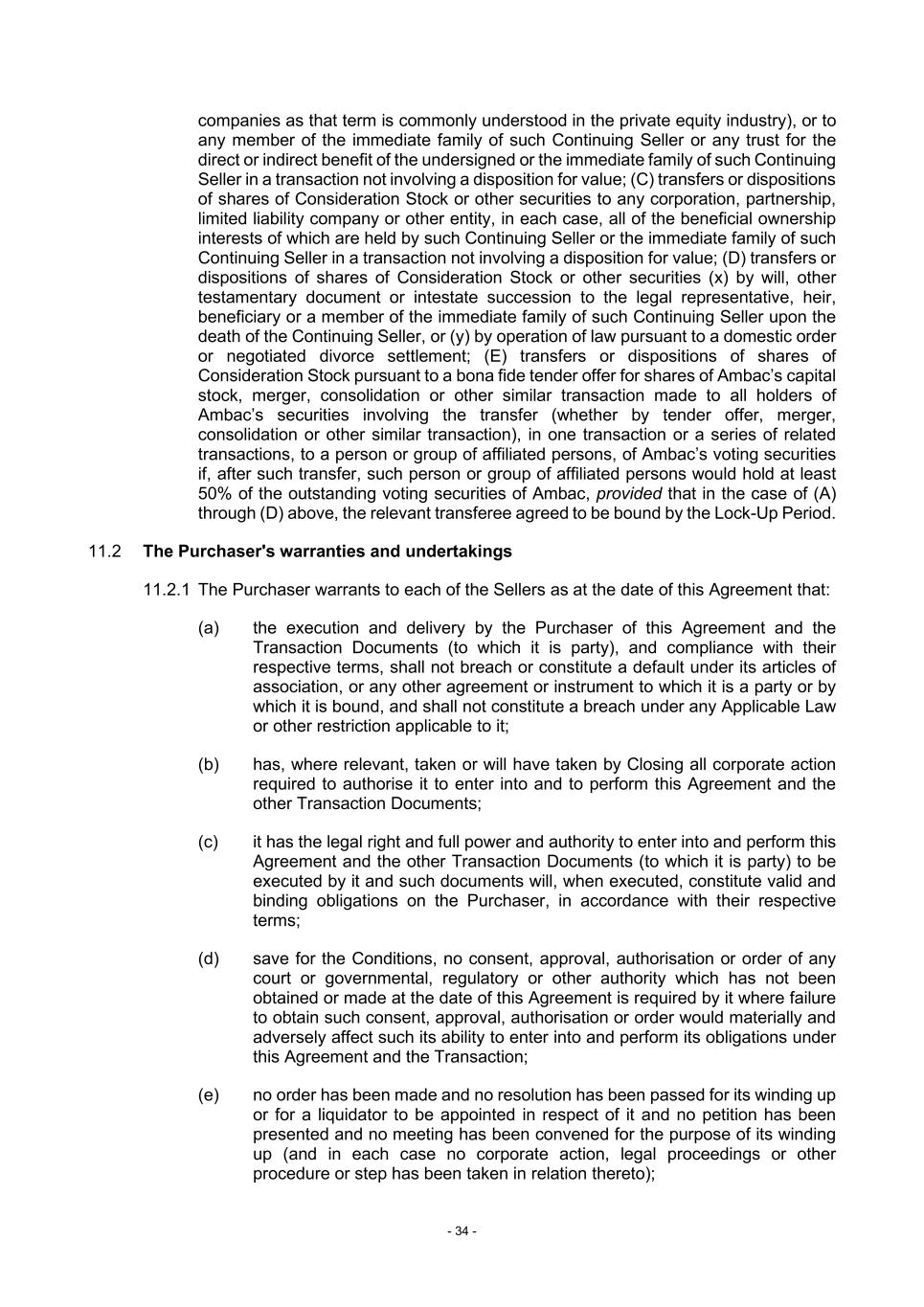 - 34 - companies as that term is commonly understood in the private equity industry), or to any member of the immediate family of such Continuing Seller or any trust for the direct or indirect benefit of the undersigned or the immediate family of such Continuing Seller in a transaction not involving a disposition for value; (C) transfers or dispositions of shares of Consideration Stock or other securities to any corporation, partnership, limited liability company or other entity, in each case, all of the beneficial ownership interests of which are held by such Continuing Seller or the immediate family of such Continuing Seller in a transaction not involving a disposition for value; (D) transfers or dispositions of shares of Consideration Stock or other securities (x) by will, other testamentary document or intestate succession to the legal representative, heir, beneficiary or a member of the immediate family of such Continuing Seller upon the death of the Continuing Seller, or (y) by operation of law pursuant to a domestic order or negotiated divorce settlement; (E) transfers or dispositions of shares of Consideration Stock pursuant to a bona fide tender offer for shares of Ambac’s capital stock, merger, consolidation or other similar transaction made to all holders of Ambac’s securities involving the transfer (whether by tender offer, merger, consolidation or other similar transaction), in one transaction or a series of related transactions, to a person or group of affiliated persons, of Ambac’s voting securities if, after such transfer, such person or group of affiliated persons would hold at least 50% of the outstanding voting securities of Ambac, provided that in the case of (A) through (D) above, the relevant transferee agreed to be bound by the Lock-Up Period. 11.2 The Purchaser's warranties and undertakings 11.2.1 The Purchaser warrants to each of the Sellers as at the date of this Agreement that: (a) the execution and delivery by the Purchaser of this Agreement and the Transaction Documents (to which it is party), and compliance with their respective terms, shall not breach or constitute a default under its articles of association, or any other agreement or instrument to which it is a party or by which it is bound, and shall not constitute a breach under any Applicable Law or other restriction applicable to it; (b) has, where relevant, taken or will have taken by Closing all corporate action required to authorise it to enter into and to perform this Agreement and the other Transaction Documents; (c) it has the legal right and full power and authority to enter into and perform this Agreement and the other Transaction Documents (to which it is party) to be executed by it and such documents will, when executed, constitute valid and binding obligations on the Purchaser, in accordance with their respective terms; (d) save for the Conditions, no consent, approval, authorisation or order of any court or governmental, regulatory or other authority which has not been obtained or made at the date of this Agreement is required by it where failure to obtain such consent, approval, authorisation or order would materially and adversely affect such its ability to enter into and perform its obligations under this Agreement and the Transaction; (e) no order has been made and no resolution has been passed for its winding up or for a liquidator to be appointed in respect of it and no petition has been presented and no meeting has been convened for the purpose of its winding up (and in each case no corporate action, legal proceedings or other procedure or step has been taken in relation thereto);