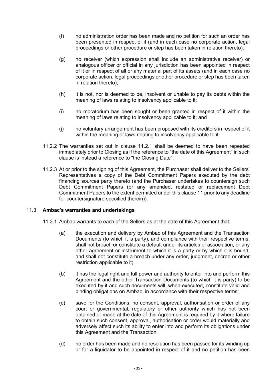 - 35 - (f) no administration order has been made and no petition for such an order has been presented in respect of it (and in each case no corporate action, legal proceedings or other procedure or step has been taken in relation thereto); (g) no receiver (which expression shall include an administrative receiver) or analogous officer or official in any jurisdiction has been appointed in respect of it or in respect of all or any material part of its assets (and in each case no corporate action, legal proceedings or other procedure or step has been taken in relation thereto); (h) it is not, nor is deemed to be, insolvent or unable to pay its debts within the meaning of laws relating to insolvency applicable to it; (i) no moratorium has been sought or been granted in respect of it within the meaning of laws relating to insolvency applicable to it; and (j) no voluntary arrangement has been proposed with its creditors in respect of it within the meaning of laws relating to insolvency applicable to it. 11.2.2 The warranties set out in clause 11.2.1 shall be deemed to have been repeated immediately prior to Closing as if the reference to "the date of this Agreement" in such clause is instead a reference to "the Closing Date". 11.2.3 At or prior to the signing of this Agreement, the Purchaser shall deliver to the Sellers’ Representatives a copy of the Debt Commitment Papers executed by the debt financing sources party thereto (and the Purchaser undertakes to countersign such Debt Commitment Papers (or any amended, restated or replacement Debt Commitment Papers to the extent permitted under this clause 11 prior to any deadline for countersignature specified therein)). 11.3 Ambac's warranties and undertakings 11.3.1 Ambac warrants to each of the Sellers as at the date of this Agreement that: (a) the execution and delivery by Ambac of this Agreement and the Transaction Documents (to which it is party), and compliance with their respective terms, shall not breach or constitute a default under its articles of association, or any other agreement or instrument to which it is a party or by which it is bound, and shall not constitute a breach under any order, judgment, decree or other restriction applicable to it; (b) it has the legal right and full power and authority to enter into and perform this Agreement and the other Transaction Documents (to which it is party) to be executed by it and such documents will, when executed, constitute valid and binding obligations on Ambac, in accordance with their respective terms; (c) save for the Conditions, no consent, approval, authorisation or order of any court or governmental, regulatory or other authority which has not been obtained or made at the date of this Agreement is required by it where failure to obtain such consent, approval, authorisation or order would materially and adversely affect such its ability to enter into and perform its obligations under this Agreement and the Transaction; (d) no order has been made and no resolution has been passed for its winding up or for a liquidator to be appointed in respect of it and no petition has been