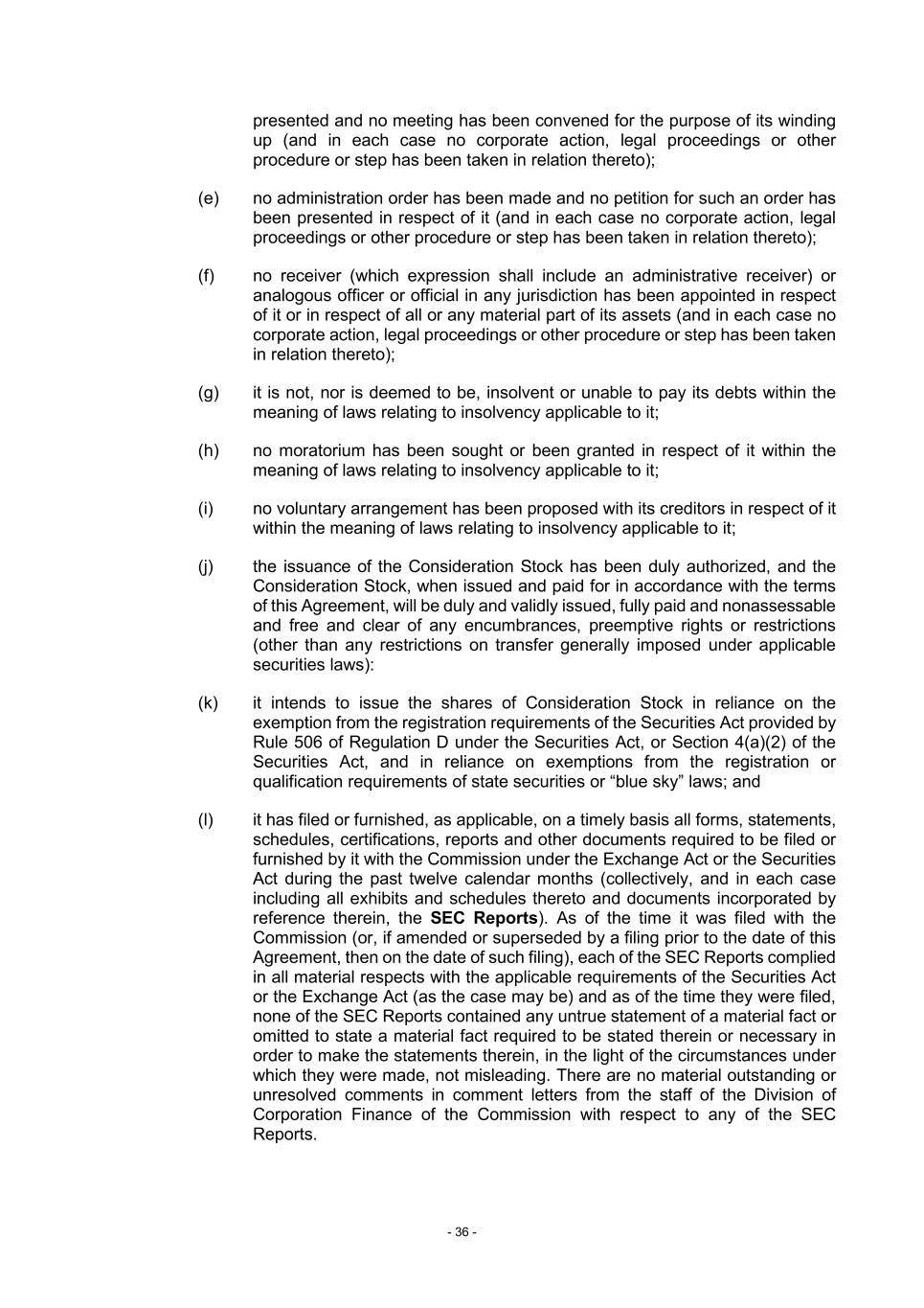 - 36 - presented and no meeting has been convened for the purpose of its winding up (and in each case no corporate action, legal proceedings or other procedure or step has been taken in relation thereto); (e) no administration order has been made and no petition for such an order has been presented in respect of it (and in each case no corporate action, legal proceedings or other procedure or step has been taken in relation thereto); (f) no receiver (which expression shall include an administrative receiver) or analogous officer or official in any jurisdiction has been appointed in respect of it or in respect of all or any material part of its assets (and in each case no corporate action, legal proceedings or other procedure or step has been taken in relation thereto); (g) it is not, nor is deemed to be, insolvent or unable to pay its debts within the meaning of laws relating to insolvency applicable to it; (h) no moratorium has been sought or been granted in respect of it within the meaning of laws relating to insolvency applicable to it; (i) no voluntary arrangement has been proposed with its creditors in respect of it within the meaning of laws relating to insolvency applicable to it; (j) the issuance of the Consideration Stock has been duly authorized, and the Consideration Stock, when issued and paid for in accordance with the terms of this Agreement, will be duly and validly issued, fully paid and nonassessable and free and clear of any encumbrances, preemptive rights or restrictions (other than any restrictions on transfer generally imposed under applicable securities laws): (k) it intends to issue the shares of Consideration Stock in reliance on the exemption from the registration requirements of the Securities Act provided by Rule 506 of Regulation D under the Securities Act, or Section 4(a)(2) of the Securities Act, and in reliance on exemptions from the registration or qualification requirements of state securities or “blue sky” laws; and (l) it has filed or furnished, as applicable, on a timely basis all forms, statements, schedules, certifications, reports and other documents required to be filed or furnished by it with the Commission under the Exchange Act or the Securities Act during the past twelve calendar months (collectively, and in each case including all exhibits and schedules thereto and documents incorporated by reference therein, the SEC Reports). As of the time it was filed with the Commission (or, if amended or superseded by a filing prior to the date of this Agreement, then on the date of such filing), each of the SEC Reports complied in all material respects with the applicable requirements of the Securities Act or the Exchange Act (as the case may be) and as of the time they were filed, none of the SEC Reports contained any untrue statement of a material fact or omitted to state a material fact required to be stated therein or necessary in order to make the statements therein, in the light of the circumstances under which they were made, not misleading. There are no material outstanding or unresolved comments in comment letters from the staff of the Division of Corporation Finance of the Commission with respect to any of the SEC Reports.