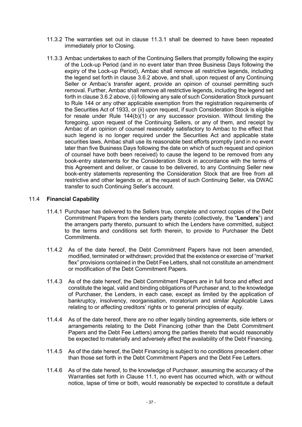 - 37 - 11.3.2 The warranties set out in clause 11.3.1 shall be deemed to have been repeated immediately prior to Closing. 11.3.3 Ambac undertakes to each of the Continuing Sellers that promptly following the expiry of the Lock-up Period (and in no event later than three Business Days following the expiry of the Lock-up Period), Ambac shall remove all restrictive legends, including the legend set forth in clause 3.6.2 above, and shall, upon request of any Continuing Seller or Ambac’s transfer agent, provide an opinion of counsel permitting such removal. Further, Ambac shall remove all restrictive legends, including the legend set forth in clause 3.6.2 above, (i) following any sale of such Consideration Stock pursuant to Rule 144 or any other applicable exemption from the registration requirements of the Securities Act of 1933, or (ii) upon request, if such Consideration Stock is eligible for resale under Rule 144(b)(1) or any successor provision. Without limiting the foregoing, upon request of the Continuing Sellers, or any of them, and receipt by Ambac of an opinion of counsel reasonably satisfactory to Ambac to the effect that such legend is no longer required under the Securities Act and applicable state securities laws, Ambac shall use its reasonable best efforts promptly (and in no event later than five Business Days following the date on which of such request and opinion of counsel have both been received) to cause the legend to be removed from any book-entry statements for the Consideration Stock in accordance with the terms of this Agreement and deliver, or cause to be delivered, to any Continuing Seller new book-entry statements representing the Consideration Stock that are free from all restrictive and other legends or, at the request of such Continuing Seller, via DWAC transfer to such Continuing Seller’s account. 11.4 Financial Capability 11.4.1 Purchaser has delivered to the Sellers true, complete and correct copies of the Debt Commitment Papers from the lenders party thereto (collectively, the “Lenders”) and the arrangers party thereto, pursuant to which the Lenders have committed, subject to the terms and conditions set forth therein, to provide to Purchaser the Debt Commitments. 11.4.2 As of the date hereof, the Debt Commitment Papers have not been amended, modified, terminated or withdrawn; provided that the existence or exercise of “market flex” provisions contained in the Debt Fee Letters, shall not constitute an amendment or modification of the Debt Commitment Papers. 11.4.3 As of the date hereof, the Debt Commitment Papers are in full force and effect and constitute the legal, valid and binding obligations of Purchaser and, to the knowledge of Purchaser, the Lenders, in each case, except as limited by the application of bankruptcy, insolvency, reorganisation, moratorium and similar Applicable Laws relating to or affecting creditors’ rights or to general principles of equity. 11.4.4 As of the date hereof, there are no other legally binding agreements, side letters or arrangements relating to the Debt Financing (other than the Debt Commitment Papers and the Debt Fee Letters) among the parties thereto that would reasonably be expected to materially and adversely affect the availability of the Debt Financing. 11.4.5 As of the date hereof, the Debt Financing is subject to no conditions precedent other than those set forth in the Debt Commitment Papers and the Debt Fee Letters. 11.4.6 As of the date hereof, to the knowledge of Purchaser, assuming the accuracy of the Warranties set forth in Clause 11.1, no event has occurred which, with or without notice, lapse of time or both, would reasonably be expected to constitute a default