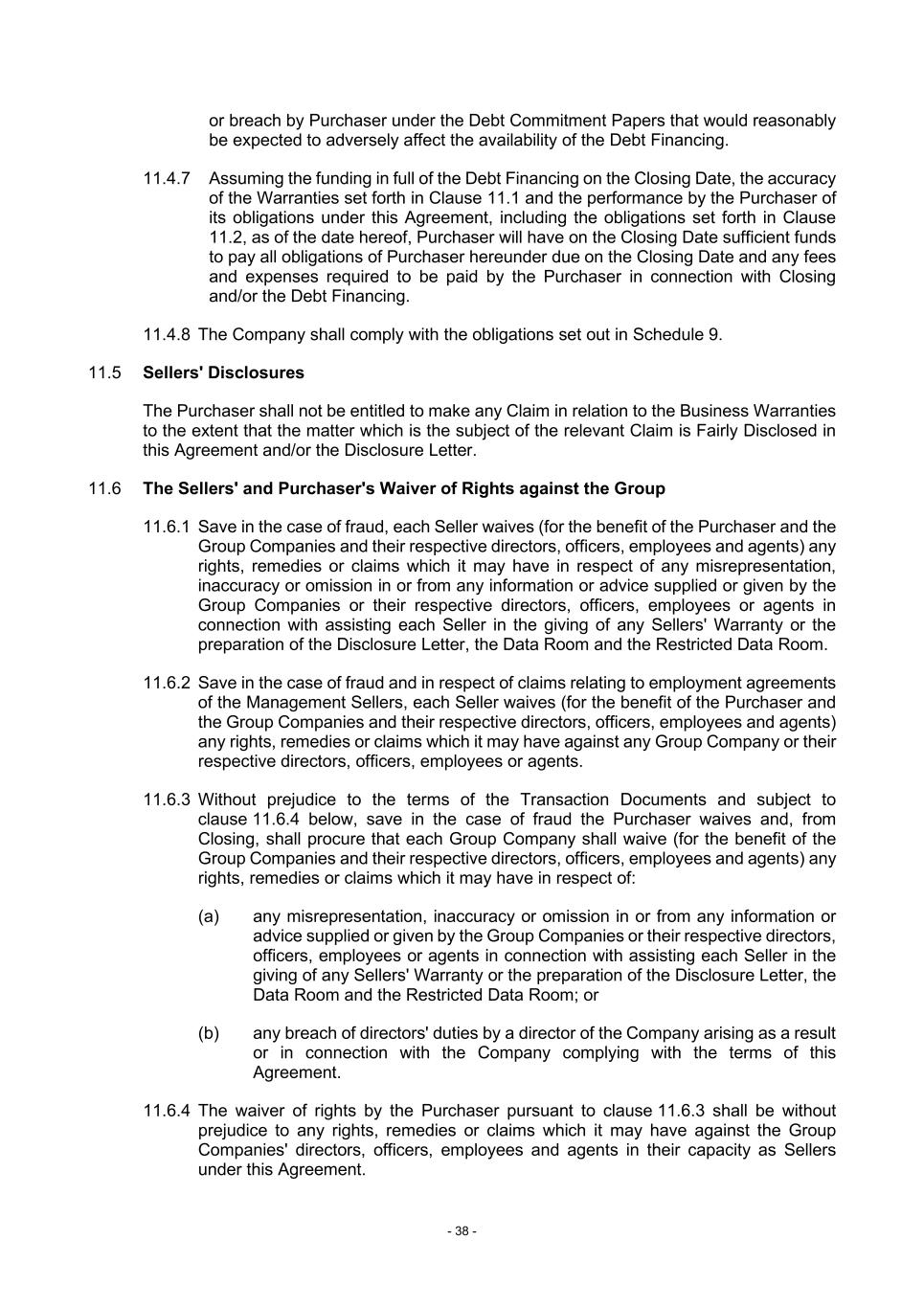 - 38 - or breach by Purchaser under the Debt Commitment Papers that would reasonably be expected to adversely affect the availability of the Debt Financing. 11.4.7 Assuming the funding in full of the Debt Financing on the Closing Date, the accuracy of the Warranties set forth in Clause 11.1 and the performance by the Purchaser of its obligations under this Agreement, including the obligations set forth in Clause 11.2, as of the date hereof, Purchaser will have on the Closing Date sufficient funds to pay all obligations of Purchaser hereunder due on the Closing Date and any fees and expenses required to be paid by the Purchaser in connection with Closing and/or the Debt Financing. 11.4.8 The Company shall comply with the obligations set out in Schedule 9. 11.5 Sellers' Disclosures The Purchaser shall not be entitled to make any Claim in relation to the Business Warranties to the extent that the matter which is the subject of the relevant Claim is Fairly Disclosed in this Agreement and/or the Disclosure Letter. 11.6 The Sellers' and Purchaser's Waiver of Rights against the Group 11.6.1 Save in the case of fraud, each Seller waives (for the benefit of the Purchaser and the Group Companies and their respective directors, officers, employees and agents) any rights, remedies or claims which it may have in respect of any misrepresentation, inaccuracy or omission in or from any information or advice supplied or given by the Group Companies or their respective directors, officers, employees or agents in connection with assisting each Seller in the giving of any Sellers' Warranty or the preparation of the Disclosure Letter, the Data Room and the Restricted Data Room. 11.6.2 Save in the case of fraud and in respect of claims relating to employment agreements of the Management Sellers, each Seller waives (for the benefit of the Purchaser and the Group Companies and their respective directors, officers, employees and agents) any rights, remedies or claims which it may have against any Group Company or their respective directors, officers, employees or agents. 11.6.3 Without prejudice to the terms of the Transaction Documents and subject to clause 11.6.4 below, save in the case of fraud the Purchaser waives and, from Closing, shall procure that each Group Company shall waive (for the benefit of the Group Companies and their respective directors, officers, employees and agents) any rights, remedies or claims which it may have in respect of: (a) any misrepresentation, inaccuracy or omission in or from any information or advice supplied or given by the Group Companies or their respective directors, officers, employees or agents in connection with assisting each Seller in the giving of any Sellers' Warranty or the preparation of the Disclosure Letter, the Data Room and the Restricted Data Room; or (b) any breach of directors' duties by a director of the Company arising as a result or in connection with the Company complying with the terms of this Agreement. 11.6.4 The waiver of rights by the Purchaser pursuant to clause 11.6.3 shall be without prejudice to any rights, remedies or claims which it may have against the Group Companies' directors, officers, employees and agents in their capacity as Sellers under this Agreement.