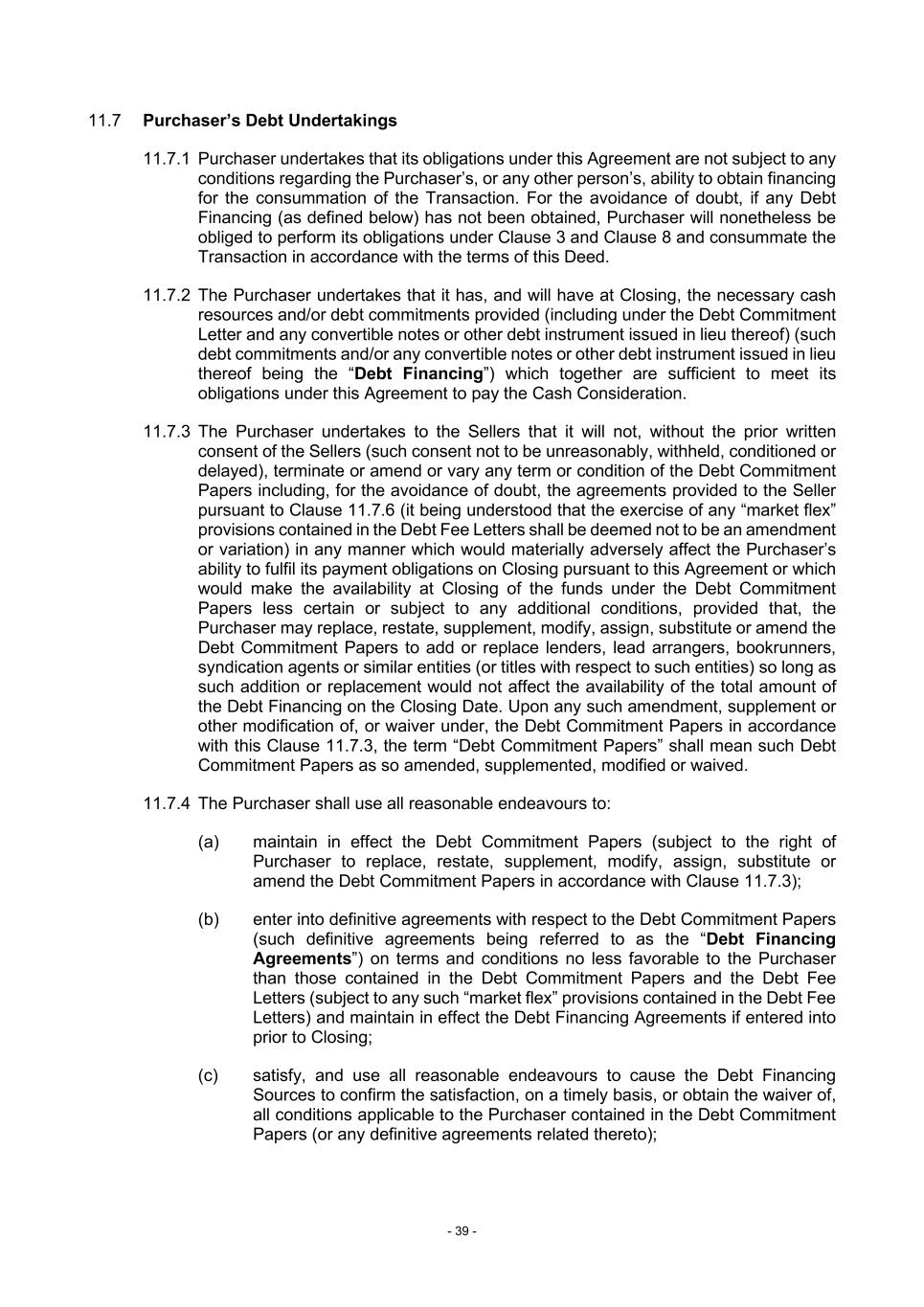 - 39 - 11.7 Purchaser’s Debt Undertakings 11.7.1 Purchaser undertakes that its obligations under this Agreement are not subject to any conditions regarding the Purchaser’s, or any other person’s, ability to obtain financing for the consummation of the Transaction. For the avoidance of doubt, if any Debt Financing (as defined below) has not been obtained, Purchaser will nonetheless be obliged to perform its obligations under Clause 3 and Clause 8 and consummate the Transaction in accordance with the terms of this Deed. 11.7.2 The Purchaser undertakes that it has, and will have at Closing, the necessary cash resources and/or debt commitments provided (including under the Debt Commitment Letter and any convertible notes or other debt instrument issued in lieu thereof) (such debt commitments and/or any convertible notes or other debt instrument issued in lieu thereof being the “Debt Financing”) which together are sufficient to meet its obligations under this Agreement to pay the Cash Consideration. 11.7.3 The Purchaser undertakes to the Sellers that it will not, without the prior written consent of the Sellers (such consent not to be unreasonably, withheld, conditioned or delayed), terminate or amend or vary any term or condition of the Debt Commitment Papers including, for the avoidance of doubt, the agreements provided to the Seller pursuant to Clause 11.7.6 (it being understood that the exercise of any “market flex” provisions contained in the Debt Fee Letters shall be deemed not to be an amendment or variation) in any manner which would materially adversely affect the Purchaser’s ability to fulfil its payment obligations on Closing pursuant to this Agreement or which would make the availability at Closing of the funds under the Debt Commitment Papers less certain or subject to any additional conditions, provided that, the Purchaser may replace, restate, supplement, modify, assign, substitute or amend the Debt Commitment Papers to add or replace lenders, lead arrangers, bookrunners, syndication agents or similar entities (or titles with respect to such entities) so long as such addition or replacement would not affect the availability of the total amount of the Debt Financing on the Closing Date. Upon any such amendment, supplement or other modification of, or waiver under, the Debt Commitment Papers in accordance with this Clause 11.7.3, the term “Debt Commitment Papers” shall mean such Debt Commitment Papers as so amended, supplemented, modified or waived. 11.7.4 The Purchaser shall use all reasonable endeavours to: (a) maintain in effect the Debt Commitment Papers (subject to the right of Purchaser to replace, restate, supplement, modify, assign, substitute or amend the Debt Commitment Papers in accordance with Clause 11.7.3); (b) enter into definitive agreements with respect to the Debt Commitment Papers (such definitive agreements being referred to as the “Debt Financing Agreements”) on terms and conditions no less favorable to the Purchaser than those contained in the Debt Commitment Papers and the Debt Fee Letters (subject to any such “market flex” provisions contained in the Debt Fee Letters) and maintain in effect the Debt Financing Agreements if entered into prior to Closing; (c) satisfy, and use all reasonable endeavours to cause the Debt Financing Sources to confirm the satisfaction, on a timely basis, or obtain the waiver of, all conditions applicable to the Purchaser contained in the Debt Commitment Papers (or any definitive agreements related thereto);