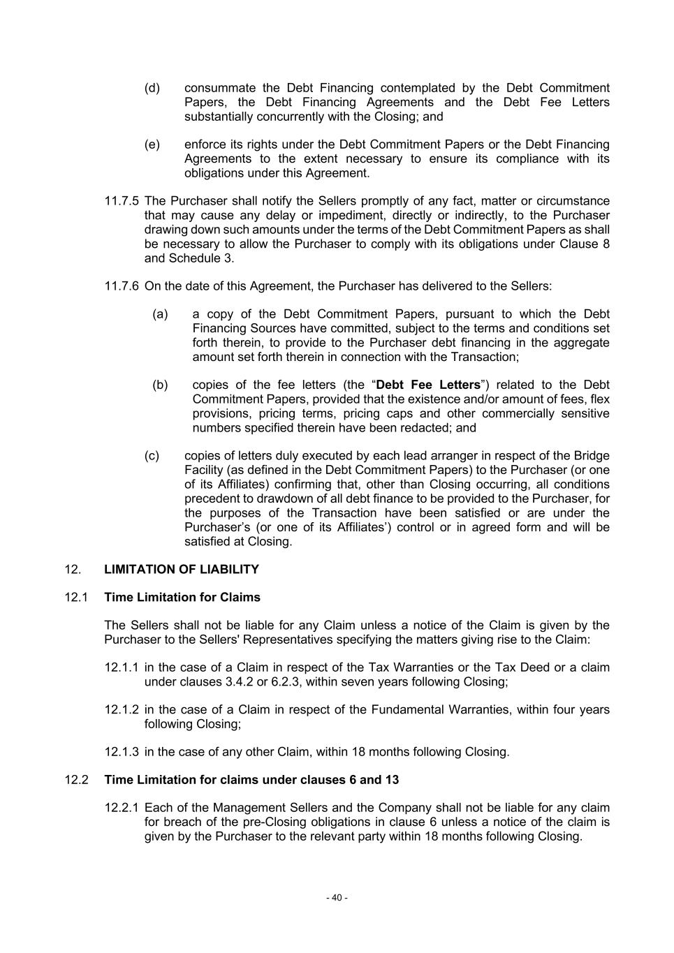 - 40 - (d) consummate the Debt Financing contemplated by the Debt Commitment Papers, the Debt Financing Agreements and the Debt Fee Letters substantially concurrently with the Closing; and (e) enforce its rights under the Debt Commitment Papers or the Debt Financing Agreements to the extent necessary to ensure its compliance with its obligations under this Agreement. 11.7.5 The Purchaser shall notify the Sellers promptly of any fact, matter or circumstance that may cause any delay or impediment, directly or indirectly, to the Purchaser drawing down such amounts under the terms of the Debt Commitment Papers as shall be necessary to allow the Purchaser to comply with its obligations under Clause 8 and Schedule 3. 11.7.6 On the date of this Agreement, the Purchaser has delivered to the Sellers: (a) a copy of the Debt Commitment Papers, pursuant to which the Debt Financing Sources have committed, subject to the terms and conditions set forth therein, to provide to the Purchaser debt financing in the aggregate amount set forth therein in connection with the Transaction; (b) copies of the fee letters (the “Debt Fee Letters”) related to the Debt Commitment Papers, provided that the existence and/or amount of fees, flex provisions, pricing terms, pricing caps and other commercially sensitive numbers specified therein have been redacted; and (c) copies of letters duly executed by each lead arranger in respect of the Bridge Facility (as defined in the Debt Commitment Papers) to the Purchaser (or one of its Affiliates) confirming that, other than Closing occurring, all conditions precedent to drawdown of all debt finance to be provided to the Purchaser, for the purposes of the Transaction have been satisfied or are under the Purchaser’s (or one of its Affiliates’) control or in agreed form and will be satisfied at Closing. 12. LIMITATION OF LIABILITY 12.1 Time Limitation for Claims The Sellers shall not be liable for any Claim unless a notice of the Claim is given by the Purchaser to the Sellers' Representatives specifying the matters giving rise to the Claim: 12.1.1 in the case of a Claim in respect of the Tax Warranties or the Tax Deed or a claim under clauses 3.4.2 or 6.2.3, within seven years following Closing; 12.1.2 in the case of a Claim in respect of the Fundamental Warranties, within four years following Closing; 12.1.3 in the case of any other Claim, within 18 months following Closing. 12.2 Time Limitation for claims under clauses 6 and 13 12.2.1 Each of the Management Sellers and the Company shall not be liable for any claim for breach of the pre-Closing obligations in clause 6 unless a notice of the claim is given by the Purchaser to the relevant party within 18 months following Closing.