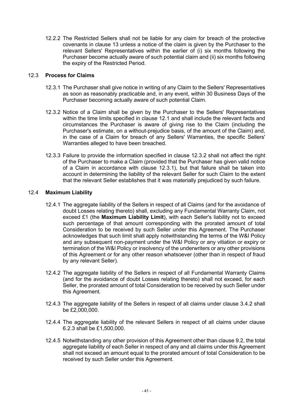 - 41 - 12.2.2 The Restricted Sellers shall not be liable for any claim for breach of the protective covenants in clause 13 unless a notice of the claim is given by the Purchaser to the relevant Sellers' Representatives within the earlier of (i) six months following the Purchaser become actually aware of such potential claim and (ii) six months following the expiry of the Restricted Period. 12.3 Process for Claims 12.3.1 The Purchaser shall give notice in writing of any Claim to the Sellers' Representatives as soon as reasonably practicable and, in any event, within 30 Business Days of the Purchaser becoming actually aware of such potential Claim. 12.3.2 Notice of a Claim shall be given by the Purchaser to the Sellers' Representatives within the time limits specified in clause 12.1 and shall include the relevant facts and circumstances the Purchaser is aware of giving rise to the Claim (including the Purchaser's estimate, on a without-prejudice basis, of the amount of the Claim) and, in the case of a Claim for breach of any Sellers' Warranties, the specific Sellers' Warranties alleged to have been breached. 12.3.3 Failure to provide the information specified in clause 12.3.2 shall not affect the right of the Purchaser to make a Claim (provided that the Purchaser has given valid notice of a Claim in accordance with clause 12.3.1), but that failure shall be taken into account in determining the liability of the relevant Seller for such Claim to the extent that the relevant Seller establishes that it was materially prejudiced by such failure. 12.4 Maximum Liability 12.4.1 The aggregate liability of the Sellers in respect of all Claims (and for the avoidance of doubt Losses relating thereto) shall, excluding any Fundamental Warranty Claim, not exceed £1 (the Maximum Liability Limit), with each Seller's liability not to exceed such percentage of that amount corresponding with the prorated amount of total Consideration to be received by such Seller under this Agreement. The Purchaser acknowledges that such limit shall apply notwithstanding the terms of the W&I Policy and any subsequent non-payment under the W&I Policy or any vitiation or expiry or termination of the W&I Policy or insolvency of the underwriters or any other provisions of this Agreement or for any other reason whatsoever (other than in respect of fraud by any relevant Seller). 12.4.2 The aggregate liability of the Sellers in respect of all Fundamental Warranty Claims (and for the avoidance of doubt Losses relating thereto) shall not exceed, for each Seller, the prorated amount of total Consideration to be received by such Seller under this Agreement. 12.4.3 The aggregate liability of the Sellers in respect of all claims under clause 3.4.2 shall be £2,000,000. 12.4.4 The aggregate liability of the relevant Sellers in respect of all claims under clause 6.2.3 shall be £1,500,000. 12.4.5 Notwithstanding any other provision of this Agreement other than clause 9.2, the total aggregate liability of each Seller in respect of any and all claims under this Agreement shall not exceed an amount equal to the prorated amount of total Consideration to be received by such Seller under this Agreement.
