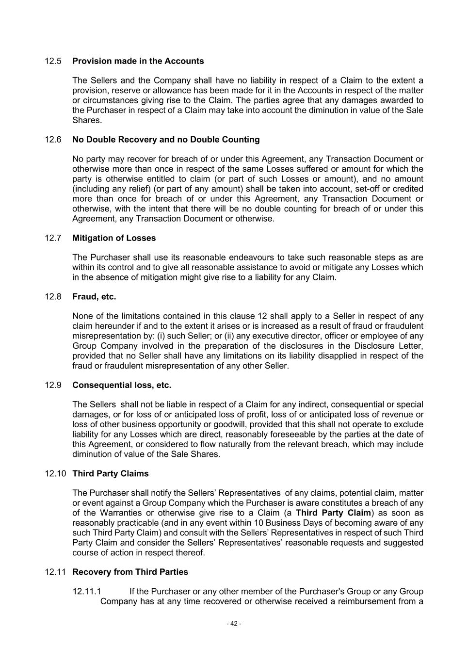 - 42 - 12.5 Provision made in the Accounts The Sellers and the Company shall have no liability in respect of a Claim to the extent a provision, reserve or allowance has been made for it in the Accounts in respect of the matter or circumstances giving rise to the Claim. The parties agree that any damages awarded to the Purchaser in respect of a Claim may take into account the diminution in value of the Sale Shares. 12.6 No Double Recovery and no Double Counting No party may recover for breach of or under this Agreement, any Transaction Document or otherwise more than once in respect of the same Losses suffered or amount for which the party is otherwise entitled to claim (or part of such Losses or amount), and no amount (including any relief) (or part of any amount) shall be taken into account, set-off or credited more than once for breach of or under this Agreement, any Transaction Document or otherwise, with the intent that there will be no double counting for breach of or under this Agreement, any Transaction Document or otherwise. 12.7 Mitigation of Losses The Purchaser shall use its reasonable endeavours to take such reasonable steps as are within its control and to give all reasonable assistance to avoid or mitigate any Losses which in the absence of mitigation might give rise to a liability for any Claim. 12.8 Fraud, etc. None of the limitations contained in this clause 12 shall apply to a Seller in respect of any claim hereunder if and to the extent it arises or is increased as a result of fraud or fraudulent misrepresentation by: (i) such Seller; or (ii) any executive director, officer or employee of any Group Company involved in the preparation of the disclosures in the Disclosure Letter, provided that no Seller shall have any limitations on its liability disapplied in respect of the fraud or fraudulent misrepresentation of any other Seller. 12.9 Consequential loss, etc. The Sellers shall not be liable in respect of a Claim for any indirect, consequential or special damages, or for loss of or anticipated loss of profit, loss of or anticipated loss of revenue or loss of other business opportunity or goodwill, provided that this shall not operate to exclude liability for any Losses which are direct, reasonably foreseeable by the parties at the date of this Agreement, or considered to flow naturally from the relevant breach, which may include diminution of value of the Sale Shares. 12.10 Third Party Claims The Purchaser shall notify the Sellers’ Representatives of any claims, potential claim, matter or event against a Group Company which the Purchaser is aware constitutes a breach of any of the Warranties or otherwise give rise to a Claim (a Third Party Claim) as soon as reasonably practicable (and in any event within 10 Business Days of becoming aware of any such Third Party Claim) and consult with the Sellers’ Representatives in respect of such Third Party Claim and consider the Sellers’ Representatives’ reasonable requests and suggested course of action in respect thereof. 12.11 Recovery from Third Parties 12.11.1 If the Purchaser or any other member of the Purchaser's Group or any Group Company has at any time recovered or otherwise received a reimbursement from a