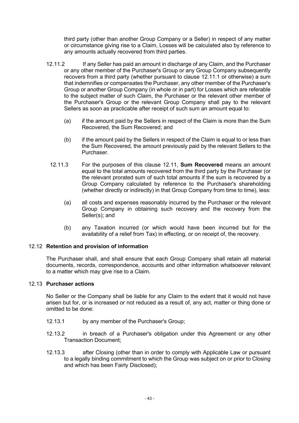 - 43 - third party (other than another Group Company or a Seller) in respect of any matter or circumstance giving rise to a Claim, Losses will be calculated also by reference to any amounts actually recovered from third parties. 12.11.2 If any Seller has paid an amount in discharge of any Claim, and the Purchaser or any other member of the Purchaser's Group or any Group Company subsequently recovers from a third party (whether pursuant to clause 12.11.1 or otherwise) a sum that indemnifies or compensates the Purchaser, any other member of the Purchaser's Group or another Group Company (in whole or in part) for Losses which are referable to the subject matter of such Claim, the Purchaser or the relevant other member of the Purchaser's Group or the relevant Group Company shall pay to the relevant Sellers as soon as practicable after receipt of such sum an amount equal to: (a) if the amount paid by the Sellers in respect of the Claim is more than the Sum Recovered, the Sum Recovered; and (b) if the amount paid by the Sellers in respect of the Claim is equal to or less than the Sum Recovered, the amount previously paid by the relevant Sellers to the Purchaser. 12.11.3 For the purposes of this clause 12.11, Sum Recovered means an amount equal to the total amounts recovered from the third party by the Purchaser (or the relevant prorated sum of such total amounts if the sum is recovered by a Group Company calculated by reference to the Purchaser's shareholding (whether directly or indirectly) in that Group Company from time to time), less: (a) all costs and expenses reasonably incurred by the Purchaser or the relevant Group Company in obtaining such recovery and the recovery from the Seller(s); and (b) any Taxation incurred (or which would have been incurred but for the availability of a relief from Tax) in effecting, or on receipt of, the recovery. 12.12 Retention and provision of information The Purchaser shall, and shall ensure that each Group Company shall retain all material documents, records, correspondence, accounts and other information whatsoever relevant to a matter which may give rise to a Claim. 12.13 Purchaser actions No Seller or the Company shall be liable for any Claim to the extent that it would not have arisen but for, or is increased or not reduced as a result of, any act, matter or thing done or omitted to be done: 12.13.1 by any member of the Purchaser's Group; 12.13.2 in breach of a Purchaser's obligation under this Agreement or any other Transaction Document; 12.13.3 after Closing (other than in order to comply with Applicable Law or pursuant to a legally binding commitment to which the Group was subject on or prior to Closing and which has been Fairly Disclosed);