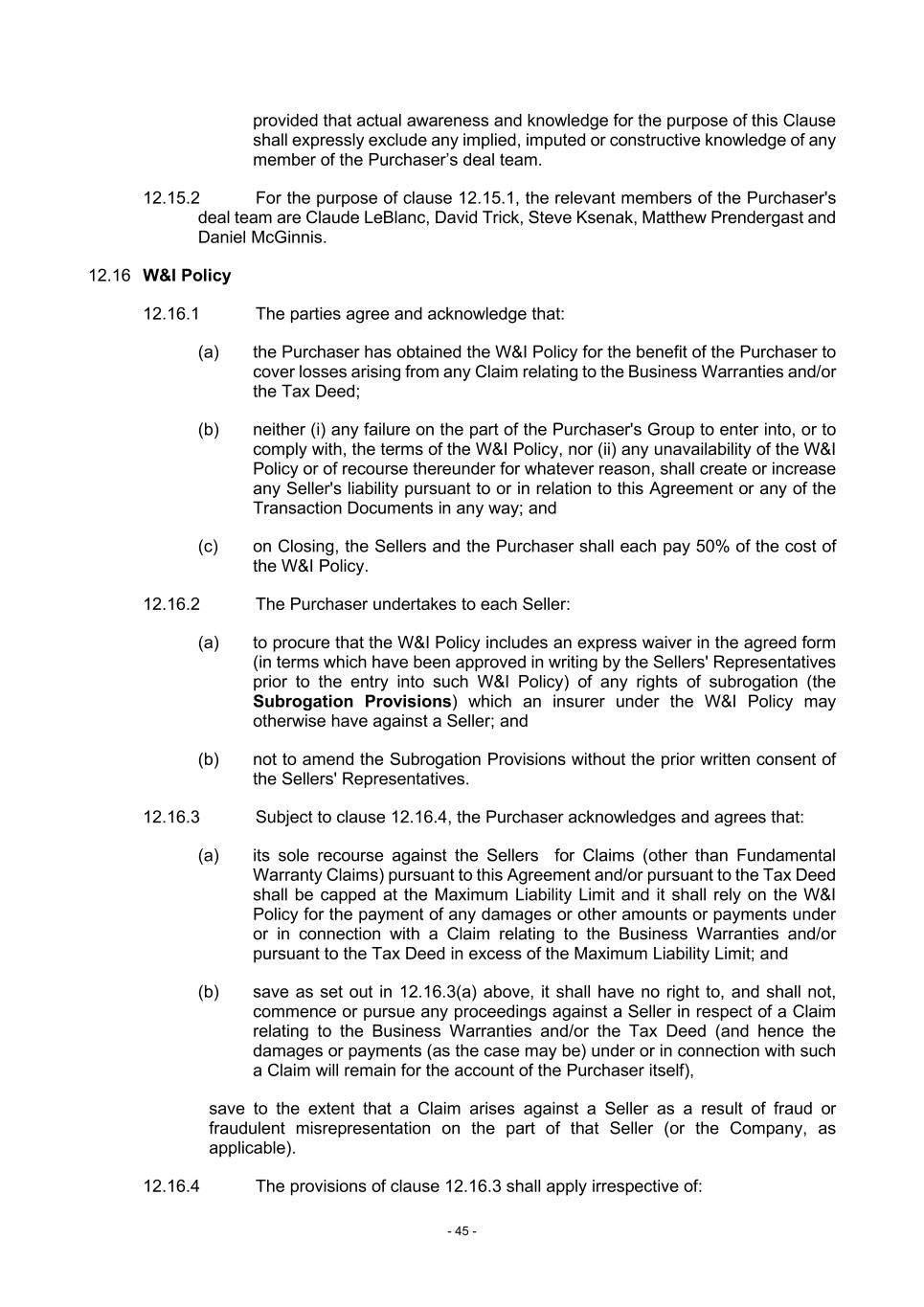 - 45 - provided that actual awareness and knowledge for the purpose of this Clause shall expressly exclude any implied, imputed or constructive knowledge of any member of the Purchaser’s deal team. 12.15.2 For the purpose of clause 12.15.1, the relevant members of the Purchaser's deal team are Claude LeBlanc, David Trick, Steve Ksenak, Matthew Prendergast and Daniel McGinnis. 12.16 W&I Policy 12.16.1 The parties agree and acknowledge that: (a) the Purchaser has obtained the W&I Policy for the benefit of the Purchaser to cover losses arising from any Claim relating to the Business Warranties and/or the Tax Deed; (b) neither (i) any failure on the part of the Purchaser's Group to enter into, or to comply with, the terms of the W&I Policy, nor (ii) any unavailability of the W&I Policy or of recourse thereunder for whatever reason, shall create or increase any Seller's liability pursuant to or in relation to this Agreement or any of the Transaction Documents in any way; and (c) on Closing, the Sellers and the Purchaser shall each pay 50% of the cost of the W&I Policy. 12.16.2 The Purchaser undertakes to each Seller: (a) to procure that the W&I Policy includes an express waiver in the agreed form (in terms which have been approved in writing by the Sellers' Representatives prior to the entry into such W&I Policy) of any rights of subrogation (the Subrogation Provisions) which an insurer under the W&I Policy may otherwise have against a Seller; and (b) not to amend the Subrogation Provisions without the prior written consent of the Sellers' Representatives. 12.16.3 Subject to clause 12.16.4, the Purchaser acknowledges and agrees that: (a) its sole recourse against the Sellers for Claims (other than Fundamental Warranty Claims) pursuant to this Agreement and/or pursuant to the Tax Deed shall be capped at the Maximum Liability Limit and it shall rely on the W&I Policy for the payment of any damages or other amounts or payments under or in connection with a Claim relating to the Business Warranties and/or pursuant to the Tax Deed in excess of the Maximum Liability Limit; and (b) save as set out in 12.16.3(a) above, it shall have no right to, and shall not, commence or pursue any proceedings against a Seller in respect of a Claim relating to the Business Warranties and/or the Tax Deed (and hence the damages or payments (as the case may be) under or in connection with such a Claim will remain for the account of the Purchaser itself), save to the extent that a Claim arises against a Seller as a result of fraud or fraudulent misrepresentation on the part of that Seller (or the Company, as applicable). 12.16.4 The provisions of clause 12.16.3 shall apply irrespective of: