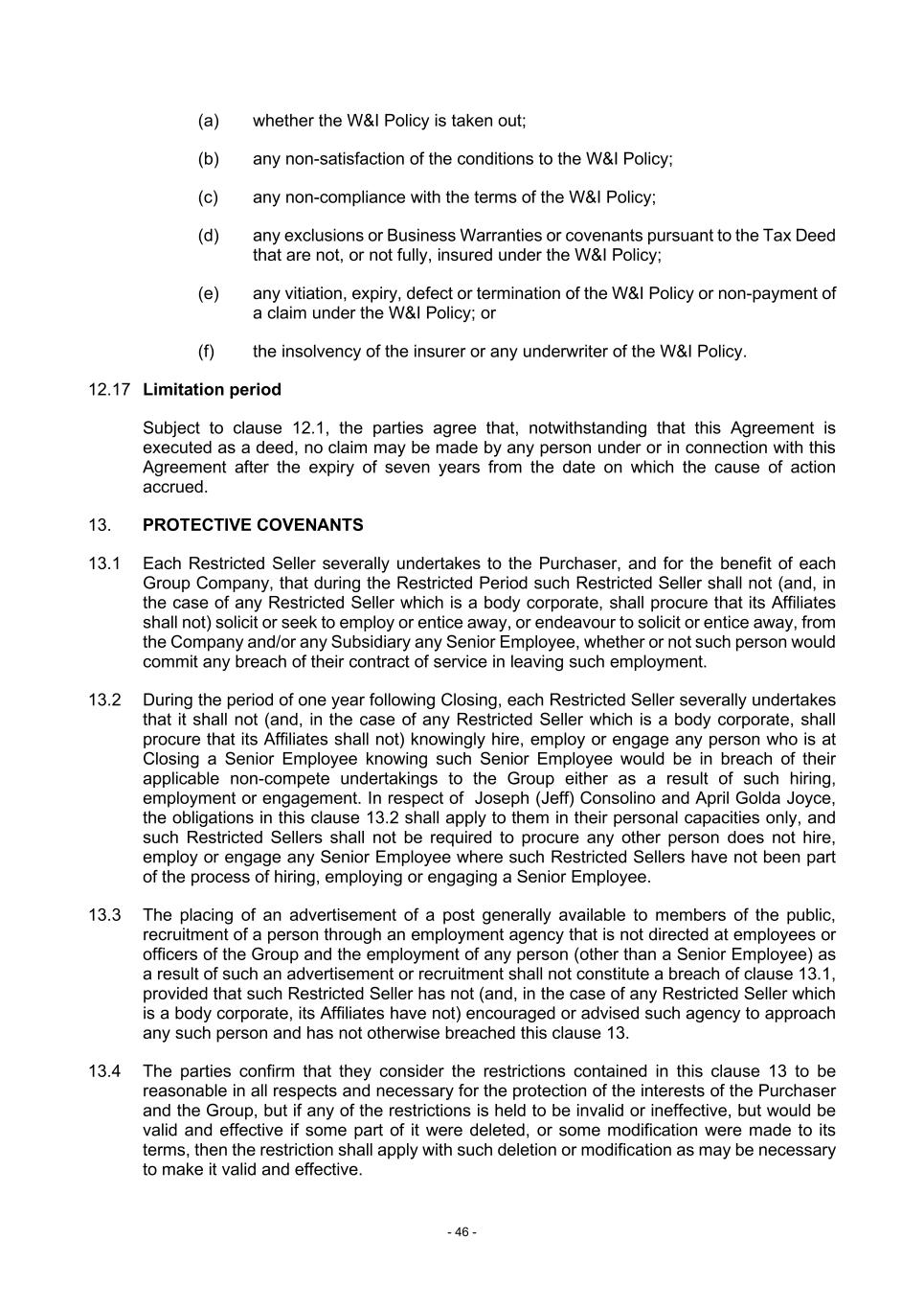 - 46 - (a) whether the W&I Policy is taken out; (b) any non-satisfaction of the conditions to the W&I Policy; (c) any non-compliance with the terms of the W&I Policy; (d) any exclusions or Business Warranties or covenants pursuant to the Tax Deed that are not, or not fully, insured under the W&I Policy; (e) any vitiation, expiry, defect or termination of the W&I Policy or non-payment of a claim under the W&I Policy; or (f) the insolvency of the insurer or any underwriter of the W&I Policy. 12.17 Limitation period Subject to clause 12.1, the parties agree that, notwithstanding that this Agreement is executed as a deed, no claim may be made by any person under or in connection with this Agreement after the expiry of seven years from the date on which the cause of action accrued. 13. PROTECTIVE COVENANTS 13.1 Each Restricted Seller severally undertakes to the Purchaser, and for the benefit of each Group Company, that during the Restricted Period such Restricted Seller shall not (and, in the case of any Restricted Seller which is a body corporate, shall procure that its Affiliates shall not) solicit or seek to employ or entice away, or endeavour to solicit or entice away, from the Company and/or any Subsidiary any Senior Employee, whether or not such person would commit any breach of their contract of service in leaving such employment. 13.2 During the period of one year following Closing, each Restricted Seller severally undertakes that it shall not (and, in the case of any Restricted Seller which is a body corporate, shall procure that its Affiliates shall not) knowingly hire, employ or engage any person who is at Closing a Senior Employee knowing such Senior Employee would be in breach of their applicable non-compete undertakings to the Group either as a result of such hiring, employment or engagement. In respect of Joseph (Jeff) Consolino and April Golda Joyce, the obligations in this clause 13.2 shall apply to them in their personal capacities only, and such Restricted Sellers shall not be required to procure any other person does not hire, employ or engage any Senior Employee where such Restricted Sellers have not been part of the process of hiring, employing or engaging a Senior Employee. 13.3 The placing of an advertisement of a post generally available to members of the public, recruitment of a person through an employment agency that is not directed at employees or officers of the Group and the employment of any person (other than a Senior Employee) as a result of such an advertisement or recruitment shall not constitute a breach of clause 13.1, provided that such Restricted Seller has not (and, in the case of any Restricted Seller which is a body corporate, its Affiliates have not) encouraged or advised such agency to approach any such person and has not otherwise breached this clause 13. 13.4 The parties confirm that they consider the restrictions contained in this clause 13 to be reasonable in all respects and necessary for the protection of the interests of the Purchaser and the Group, but if any of the restrictions is held to be invalid or ineffective, but would be valid and effective if some part of it were deleted, or some modification were made to its terms, then the restriction shall apply with such deletion or modification as may be necessary to make it valid and effective.