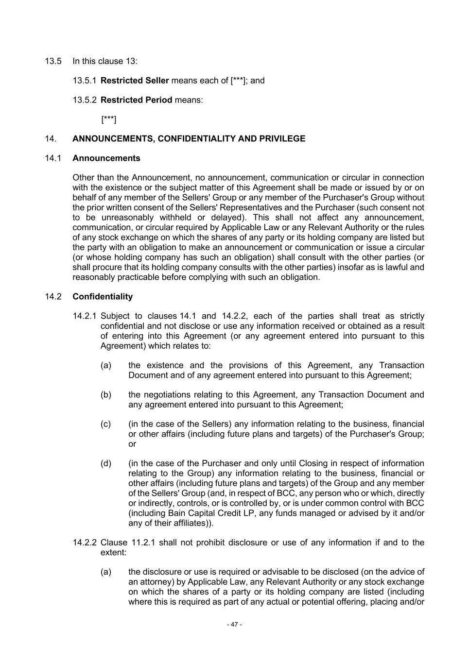 - 47 - 13.5 In this clause 13: 13.5.1 Restricted Seller means each of [***]; and 13.5.2 Restricted Period means: [***] 14. ANNOUNCEMENTS, CONFIDENTIALITY AND PRIVILEGE 14.1 Announcements Other than the Announcement, no announcement, communication or circular in connection with the existence or the subject matter of this Agreement shall be made or issued by or on behalf of any member of the Sellers' Group or any member of the Purchaser's Group without the prior written consent of the Sellers' Representatives and the Purchaser (such consent not to be unreasonably withheld or delayed). This shall not affect any announcement, communication, or circular required by Applicable Law or any Relevant Authority or the rules of any stock exchange on which the shares of any party or its holding company are listed but the party with an obligation to make an announcement or communication or issue a circular (or whose holding company has such an obligation) shall consult with the other parties (or shall procure that its holding company consults with the other parties) insofar as is lawful and reasonably practicable before complying with such an obligation. 14.2 Confidentiality 14.2.1 Subject to clauses 14.1 and 14.2.2, each of the parties shall treat as strictly confidential and not disclose or use any information received or obtained as a result of entering into this Agreement (or any agreement entered into pursuant to this Agreement) which relates to: (a) the existence and the provisions of this Agreement, any Transaction Document and of any agreement entered into pursuant to this Agreement; (b) the negotiations relating to this Agreement, any Transaction Document and any agreement entered into pursuant to this Agreement; (c) (in the case of the Sellers) any information relating to the business, financial or other affairs (including future plans and targets) of the Purchaser's Group; or (d) (in the case of the Purchaser and only until Closing in respect of information relating to the Group) any information relating to the business, financial or other affairs (including future plans and targets) of the Group and any member of the Sellers' Group (and, in respect of BCC, any person who or which, directly or indirectly, controls, or is controlled by, or is under common control with BCC (including Bain Capital Credit LP, any funds managed or advised by it and/or any of their affiliates)). 14.2.2 Clause 11.2.1 shall not prohibit disclosure or use of any information if and to the extent: (a) the disclosure or use is required or advisable to be disclosed (on the advice of an attorney) by Applicable Law, any Relevant Authority or any stock exchange on which the shares of a party or its holding company are listed (including where this is required as part of any actual or potential offering, placing and/or