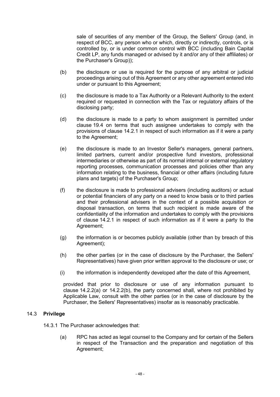 - 48 - sale of securities of any member of the Group, the Sellers' Group (and, in respect of BCC, any person who or which, directly or indirectly, controls, or is controlled by, or is under common control with BCC (including Bain Capital Credit LP, any funds managed or advised by it and/or any of their affiliates) or the Purchaser's Group)); (b) the disclosure or use is required for the purpose of any arbitral or judicial proceedings arising out of this Agreement or any other agreement entered into under or pursuant to this Agreement; (c) the disclosure is made to a Tax Authority or a Relevant Authority to the extent required or requested in connection with the Tax or regulatory affairs of the disclosing party; (d) the disclosure is made to a party to whom assignment is permitted under clause 19.4 on terms that such assignee undertakes to comply with the provisions of clause 14.2.1 in respect of such information as if it were a party to the Agreement; (e) the disclosure is made to an Investor Seller's managers, general partners, limited partners, current and/or prospective fund investors, professional intermediaries or otherwise as part of its normal internal or external regulatory reporting processes, communication processes and policies other than any information relating to the business, financial or other affairs (including future plans and targets) of the Purchaser's Group; (f) the disclosure is made to professional advisers (including auditors) or actual or potential financiers of any party on a need to know basis or to third parties and their professional advisers in the context of a possible acquisition or disposal transaction, on terms that such recipient is made aware of the confidentiality of the information and undertakes to comply with the provisions of clause 14.2.1 in respect of such information as if it were a party to the Agreement; (g) the information is or becomes publicly available (other than by breach of this Agreement); (h) the other parties (or in the case of disclosure by the Purchaser, the Sellers' Representatives) have given prior written approval to the disclosure or use; or (i) the information is independently developed after the date of this Agreement, provided that prior to disclosure or use of any information pursuant to clause 14.2.2(a) or 14.2.2(b), the party concerned shall, where not prohibited by Applicable Law, consult with the other parties (or in the case of disclosure by the Purchaser, the Sellers' Representatives) insofar as is reasonably practicable. 14.3 Privilege 14.3.1 The Purchaser acknowledges that: (a) RPC has acted as legal counsel to the Company and for certain of the Sellers in respect of the Transaction and the preparation and negotiation of this Agreement;