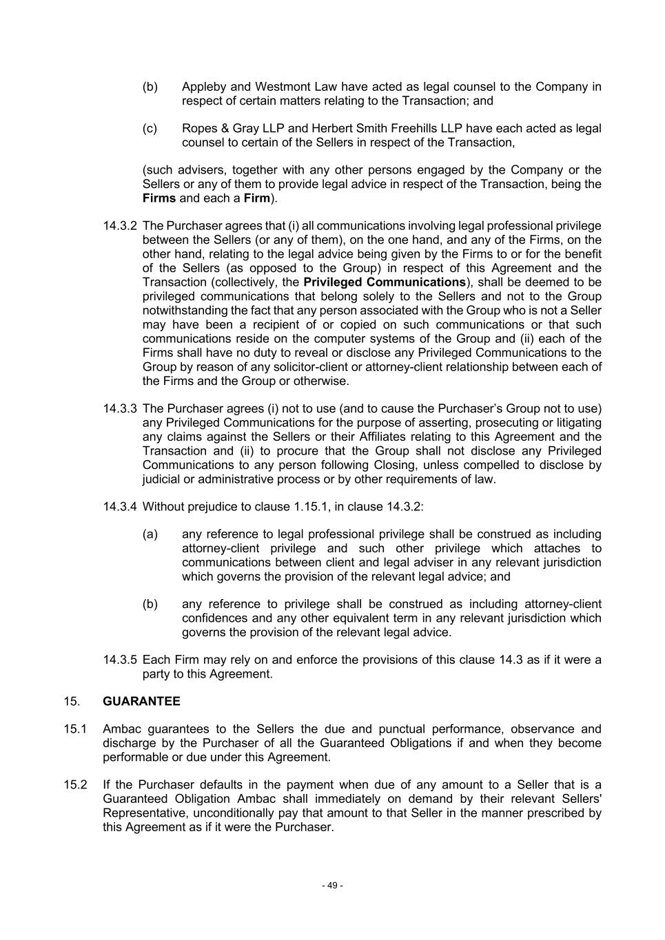 - 49 - (b) Appleby and Westmont Law have acted as legal counsel to the Company in respect of certain matters relating to the Transaction; and (c) Ropes & Gray LLP and Herbert Smith Freehills LLP have each acted as legal counsel to certain of the Sellers in respect of the Transaction, (such advisers, together with any other persons engaged by the Company or the Sellers or any of them to provide legal advice in respect of the Transaction, being the Firms and each a Firm). 14.3.2 The Purchaser agrees that (i) all communications involving legal professional privilege between the Sellers (or any of them), on the one hand, and any of the Firms, on the other hand, relating to the legal advice being given by the Firms to or for the benefit of the Sellers (as opposed to the Group) in respect of this Agreement and the Transaction (collectively, the Privileged Communications), shall be deemed to be privileged communications that belong solely to the Sellers and not to the Group notwithstanding the fact that any person associated with the Group who is not a Seller may have been a recipient of or copied on such communications or that such communications reside on the computer systems of the Group and (ii) each of the Firms shall have no duty to reveal or disclose any Privileged Communications to the Group by reason of any solicitor-client or attorney-client relationship between each of the Firms and the Group or otherwise. 14.3.3 The Purchaser agrees (i) not to use (and to cause the Purchaser’s Group not to use) any Privileged Communications for the purpose of asserting, prosecuting or litigating any claims against the Sellers or their Affiliates relating to this Agreement and the Transaction and (ii) to procure that the Group shall not disclose any Privileged Communications to any person following Closing, unless compelled to disclose by judicial or administrative process or by other requirements of law. 14.3.4 Without prejudice to clause 1.15.1, in clause 14.3.2: (a) any reference to legal professional privilege shall be construed as including attorney-client privilege and such other privilege which attaches to communications between client and legal adviser in any relevant jurisdiction which governs the provision of the relevant legal advice; and (b) any reference to privilege shall be construed as including attorney-client confidences and any other equivalent term in any relevant jurisdiction which governs the provision of the relevant legal advice. 14.3.5 Each Firm may rely on and enforce the provisions of this clause 14.3 as if it were a party to this Agreement. 15. GUARANTEE 15.1 Ambac guarantees to the Sellers the due and punctual performance, observance and discharge by the Purchaser of all the Guaranteed Obligations if and when they become performable or due under this Agreement. 15.2 If the Purchaser defaults in the payment when due of any amount to a Seller that is a Guaranteed Obligation Ambac shall immediately on demand by their relevant Sellers' Representative, unconditionally pay that amount to that Seller in the manner prescribed by this Agreement as if it were the Purchaser.