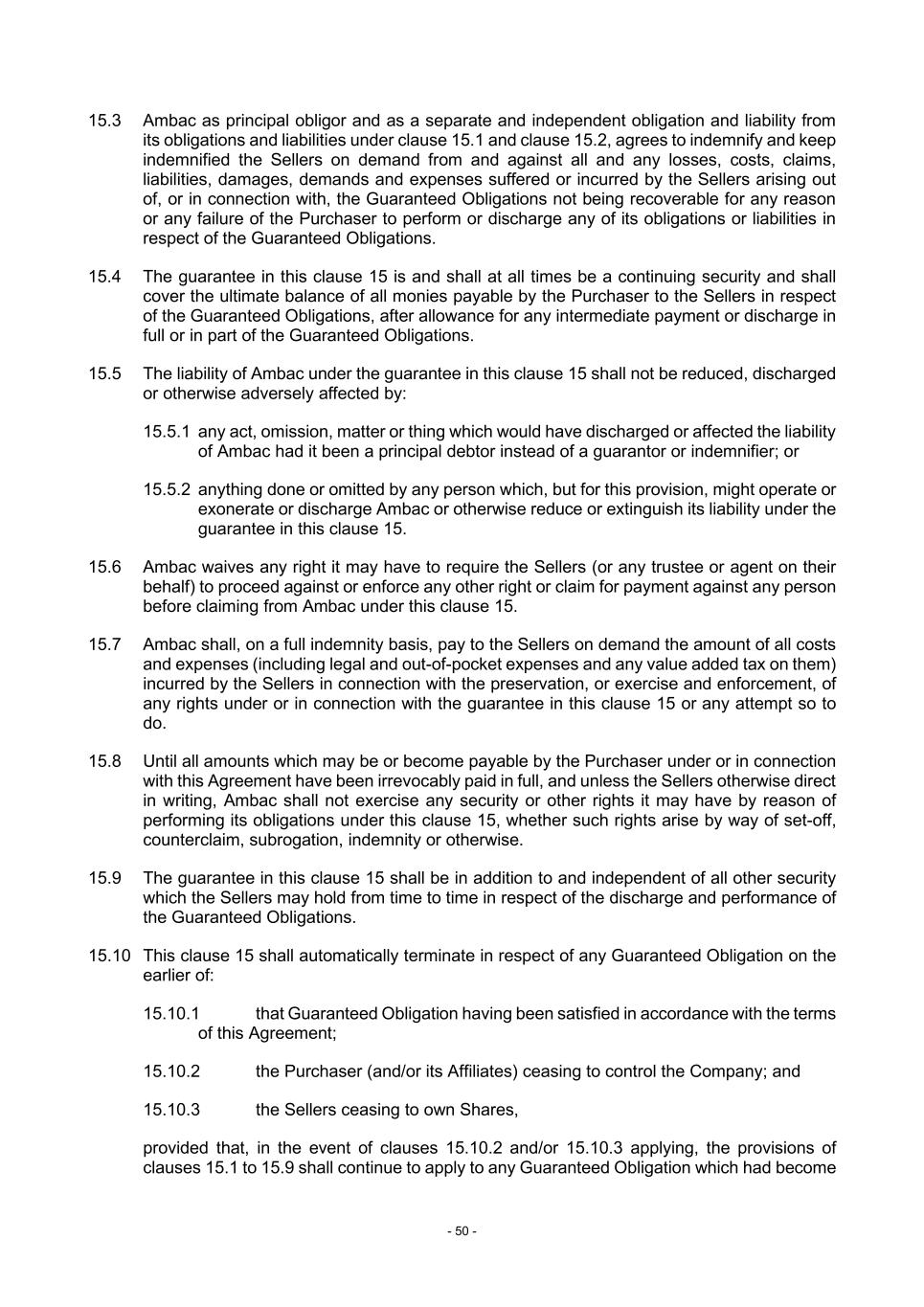 - 50 - 15.3 Ambac as principal obligor and as a separate and independent obligation and liability from its obligations and liabilities under clause 15.1 and clause 15.2, agrees to indemnify and keep indemnified the Sellers on demand from and against all and any losses, costs, claims, liabilities, damages, demands and expenses suffered or incurred by the Sellers arising out of, or in connection with, the Guaranteed Obligations not being recoverable for any reason or any failure of the Purchaser to perform or discharge any of its obligations or liabilities in respect of the Guaranteed Obligations. 15.4 The guarantee in this clause 15 is and shall at all times be a continuing security and shall cover the ultimate balance of all monies payable by the Purchaser to the Sellers in respect of the Guaranteed Obligations, after allowance for any intermediate payment or discharge in full or in part of the Guaranteed Obligations. 15.5 The liability of Ambac under the guarantee in this clause 15 shall not be reduced, discharged or otherwise adversely affected by: 15.5.1 any act, omission, matter or thing which would have discharged or affected the liability of Ambac had it been a principal debtor instead of a guarantor or indemnifier; or 15.5.2 anything done or omitted by any person which, but for this provision, might operate or exonerate or discharge Ambac or otherwise reduce or extinguish its liability under the guarantee in this clause 15. 15.6 Ambac waives any right it may have to require the Sellers (or any trustee or agent on their behalf) to proceed against or enforce any other right or claim for payment against any person before claiming from Ambac under this clause 15. 15.7 Ambac shall, on a full indemnity basis, pay to the Sellers on demand the amount of all costs and expenses (including legal and out-of-pocket expenses and any value added tax on them) incurred by the Sellers in connection with the preservation, or exercise and enforcement, of any rights under or in connection with the guarantee in this clause 15 or any attempt so to do. 15.8 Until all amounts which may be or become payable by the Purchaser under or in connection with this Agreement have been irrevocably paid in full, and unless the Sellers otherwise direct in writing, Ambac shall not exercise any security or other rights it may have by reason of performing its obligations under this clause 15, whether such rights arise by way of set-off, counterclaim, subrogation, indemnity or otherwise. 15.9 The guarantee in this clause 15 shall be in addition to and independent of all other security which the Sellers may hold from time to time in respect of the discharge and performance of the Guaranteed Obligations. 15.10 This clause 15 shall automatically terminate in respect of any Guaranteed Obligation on the earlier of: 15.10.1 that Guaranteed Obligation having been satisfied in accordance with the terms of this Agreement; 15.10.2 the Purchaser (and/or its Affiliates) ceasing to control the Company; and 15.10.3 the Sellers ceasing to own Shares, provided that, in the event of clauses 15.10.2 and/or 15.10.3 applying, the provisions of clauses 15.1 to 15.9 shall continue to apply to any Guaranteed Obligation which had become