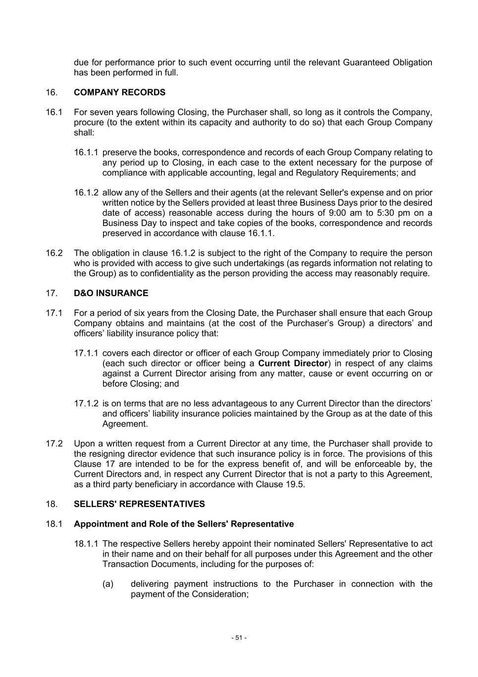 - 51 - due for performance prior to such event occurring until the relevant Guaranteed Obligation has been performed in full. 16. COMPANY RECORDS 16.1 For seven years following Closing, the Purchaser shall, so long as it controls the Company, procure (to the extent within its capacity and authority to do so) that each Group Company shall: 16.1.1 preserve the books, correspondence and records of each Group Company relating to any period up to Closing, in each case to the extent necessary for the purpose of compliance with applicable accounting, legal and Regulatory Requirements; and 16.1.2 allow any of the Sellers and their agents (at the relevant Seller's expense and on prior written notice by the Sellers provided at least three Business Days prior to the desired date of access) reasonable access during the hours of 9:00 am to 5:30 pm on a Business Day to inspect and take copies of the books, correspondence and records preserved in accordance with clause 16.1.1. 16.2 The obligation in clause 16.1.2 is subject to the right of the Company to require the person who is provided with access to give such undertakings (as regards information not relating to the Group) as to confidentiality as the person providing the access may reasonably require. 17. D&O INSURANCE 17.1 For a period of six years from the Closing Date, the Purchaser shall ensure that each Group Company obtains and maintains (at the cost of the Purchaser’s Group) a directors’ and officers’ liability insurance policy that: 17.1.1 covers each director or officer of each Group Company immediately prior to Closing (each such director or officer being a Current Director) in respect of any claims against a Current Director arising from any matter, cause or event occurring on or before Closing; and 17.1.2 is on terms that are no less advantageous to any Current Director than the directors’ and officers’ liability insurance policies maintained by the Group as at the date of this Agreement. 17.2 Upon a written request from a Current Director at any time, the Purchaser shall provide to the resigning director evidence that such insurance policy is in force. The provisions of this Clause 17 are intended to be for the express benefit of, and will be enforceable by, the Current Directors and, in respect any Current Director that is not a party to this Agreement, as a third party beneficiary in accordance with Clause 19.5. 18. SELLERS' REPRESENTATIVES 18.1 Appointment and Role of the Sellers' Representative 18.1.1 The respective Sellers hereby appoint their nominated Sellers' Representative to act in their name and on their behalf for all purposes under this Agreement and the other Transaction Documents, including for the purposes of: (a) delivering payment instructions to the Purchaser in connection with the payment of the Consideration;