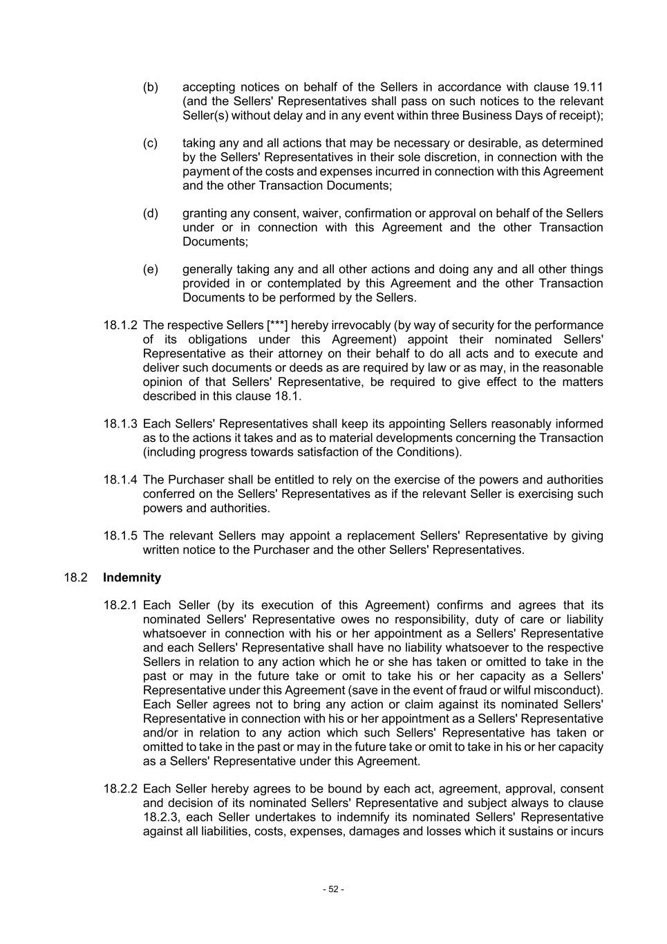 - 52 - (b) accepting notices on behalf of the Sellers in accordance with clause 19.11 (and the Sellers' Representatives shall pass on such notices to the relevant Seller(s) without delay and in any event within three Business Days of receipt); (c) taking any and all actions that may be necessary or desirable, as determined by the Sellers' Representatives in their sole discretion, in connection with the payment of the costs and expenses incurred in connection with this Agreement and the other Transaction Documents; (d) granting any consent, waiver, confirmation or approval on behalf of the Sellers under or in connection with this Agreement and the other Transaction Documents; (e) generally taking any and all other actions and doing any and all other things provided in or contemplated by this Agreement and the other Transaction Documents to be performed by the Sellers. 18.1.2 The respective Sellers [***] hereby irrevocably (by way of security for the performance of its obligations under this Agreement) appoint their nominated Sellers' Representative as their attorney on their behalf to do all acts and to execute and deliver such documents or deeds as are required by law or as may, in the reasonable opinion of that Sellers' Representative, be required to give effect to the matters described in this clause 18.1. 18.1.3 Each Sellers' Representatives shall keep its appointing Sellers reasonably informed as to the actions it takes and as to material developments concerning the Transaction (including progress towards satisfaction of the Conditions). 18.1.4 The Purchaser shall be entitled to rely on the exercise of the powers and authorities conferred on the Sellers' Representatives as if the relevant Seller is exercising such powers and authorities. 18.1.5 The relevant Sellers may appoint a replacement Sellers' Representative by giving written notice to the Purchaser and the other Sellers' Representatives. 18.2 Indemnity 18.2.1 Each Seller (by its execution of this Agreement) confirms and agrees that its nominated Sellers' Representative owes no responsibility, duty of care or liability whatsoever in connection with his or her appointment as a Sellers' Representative and each Sellers' Representative shall have no liability whatsoever to the respective Sellers in relation to any action which he or she has taken or omitted to take in the past or may in the future take or omit to take his or her capacity as a Sellers' Representative under this Agreement (save in the event of fraud or wilful misconduct). Each Seller agrees not to bring any action or claim against its nominated Sellers' Representative in connection with his or her appointment as a Sellers' Representative and/or in relation to any action which such Sellers' Representative has taken or omitted to take in the past or may in the future take or omit to take in his or her capacity as a Sellers' Representative under this Agreement. 18.2.2 Each Seller hereby agrees to be bound by each act, agreement, approval, consent and decision of its nominated Sellers' Representative and subject always to clause 18.2.3, each Seller undertakes to indemnify its nominated Sellers' Representative against all liabilities, costs, expenses, damages and losses which it sustains or incurs