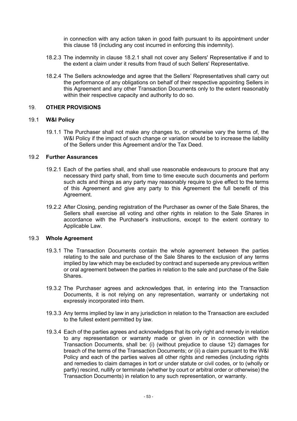 - 53 - in connection with any action taken in good faith pursuant to its appointment under this clause 18 (including any cost incurred in enforcing this indemnity). 18.2.3 The indemnity in clause 18.2.1 shall not cover any Sellers' Representative if and to the extent a claim under it results from fraud of such Sellers' Representative. 18.2.4 The Sellers acknowledge and agree that the Sellers’ Representatives shall carry out the performance of any obligations on behalf of their respective appointing Sellers in this Agreement and any other Transaction Documents only to the extent reasonably within their respective capacity and authority to do so. 19. OTHER PROVISIONS 19.1 W&I Policy 19.1.1 The Purchaser shall not make any changes to, or otherwise vary the terms of, the W&I Policy if the impact of such change or variation would be to increase the liability of the Sellers under this Agreement and/or the Tax Deed. 19.2 Further Assurances 19.2.1 Each of the parties shall, and shall use reasonable endeavours to procure that any necessary third party shall, from time to time execute such documents and perform such acts and things as any party may reasonably require to give effect to the terms of this Agreement and give any party to this Agreement the full benefit of this Agreement. 19.2.2 After Closing, pending registration of the Purchaser as owner of the Sale Shares, the Sellers shall exercise all voting and other rights in relation to the Sale Shares in accordance with the Purchaser's instructions, except to the extent contrary to Applicable Law. 19.3 Whole Agreement 19.3.1 The Transaction Documents contain the whole agreement between the parties relating to the sale and purchase of the Sale Shares to the exclusion of any terms implied by law which may be excluded by contract and supersede any previous written or oral agreement between the parties in relation to the sale and purchase of the Sale Shares. 19.3.2 The Purchaser agrees and acknowledges that, in entering into the Transaction Documents, it is not relying on any representation, warranty or undertaking not expressly incorporated into them. 19.3.3 Any terms implied by law in any jurisdiction in relation to the Transaction are excluded to the fullest extent permitted by law. 19.3.4 Each of the parties agrees and acknowledges that its only right and remedy in relation to any representation or warranty made or given in or in connection with the Transaction Documents, shall be: (i) (without prejudice to clause 12) damages for breach of the terms of the Transaction Documents; or (ii) a claim pursuant to the W&I Policy and each of the parties waives all other rights and remedies (including rights and remedies to claim damages in tort or under statute or civil codes, or to (wholly or partly) rescind, nullify or terminate (whether by court or arbitral order or otherwise) the Transaction Documents) in relation to any such representation, or warranty.