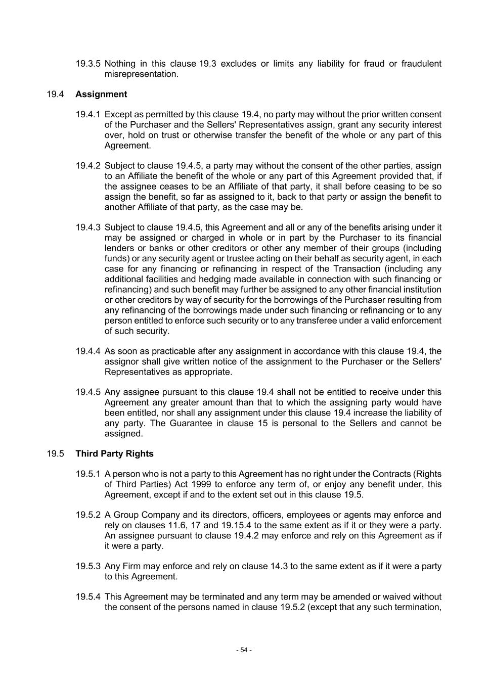 - 54 - 19.3.5 Nothing in this clause 19.3 excludes or limits any liability for fraud or fraudulent misrepresentation. 19.4 Assignment 19.4.1 Except as permitted by this clause 19.4, no party may without the prior written consent of the Purchaser and the Sellers' Representatives assign, grant any security interest over, hold on trust or otherwise transfer the benefit of the whole or any part of this Agreement. 19.4.2 Subject to clause 19.4.5, a party may without the consent of the other parties, assign to an Affiliate the benefit of the whole or any part of this Agreement provided that, if the assignee ceases to be an Affiliate of that party, it shall before ceasing to be so assign the benefit, so far as assigned to it, back to that party or assign the benefit to another Affiliate of that party, as the case may be. 19.4.3 Subject to clause 19.4.5, this Agreement and all or any of the benefits arising under it may be assigned or charged in whole or in part by the Purchaser to its financial lenders or banks or other creditors or other any member of their groups (including funds) or any security agent or trustee acting on their behalf as security agent, in each case for any financing or refinancing in respect of the Transaction (including any additional facilities and hedging made available in connection with such financing or refinancing) and such benefit may further be assigned to any other financial institution or other creditors by way of security for the borrowings of the Purchaser resulting from any refinancing of the borrowings made under such financing or refinancing or to any person entitled to enforce such security or to any transferee under a valid enforcement of such security. 19.4.4 As soon as practicable after any assignment in accordance with this clause 19.4, the assignor shall give written notice of the assignment to the Purchaser or the Sellers' Representatives as appropriate. 19.4.5 Any assignee pursuant to this clause 19.4 shall not be entitled to receive under this Agreement any greater amount than that to which the assigning party would have been entitled, nor shall any assignment under this clause 19.4 increase the liability of any party. The Guarantee in clause 15 is personal to the Sellers and cannot be assigned. 19.5 Third Party Rights 19.5.1 A person who is not a party to this Agreement has no right under the Contracts (Rights of Third Parties) Act 1999 to enforce any term of, or enjoy any benefit under, this Agreement, except if and to the extent set out in this clause 19.5. 19.5.2 A Group Company and its directors, officers, employees or agents may enforce and rely on clauses 11.6, 17 and 19.15.4 to the same extent as if it or they were a party. An assignee pursuant to clause 19.4.2 may enforce and rely on this Agreement as if it were a party. 19.5.3 Any Firm may enforce and rely on clause 14.3 to the same extent as if it were a party to this Agreement. 19.5.4 This Agreement may be terminated and any term may be amended or waived without the consent of the persons named in clause 19.5.2 (except that any such termination,