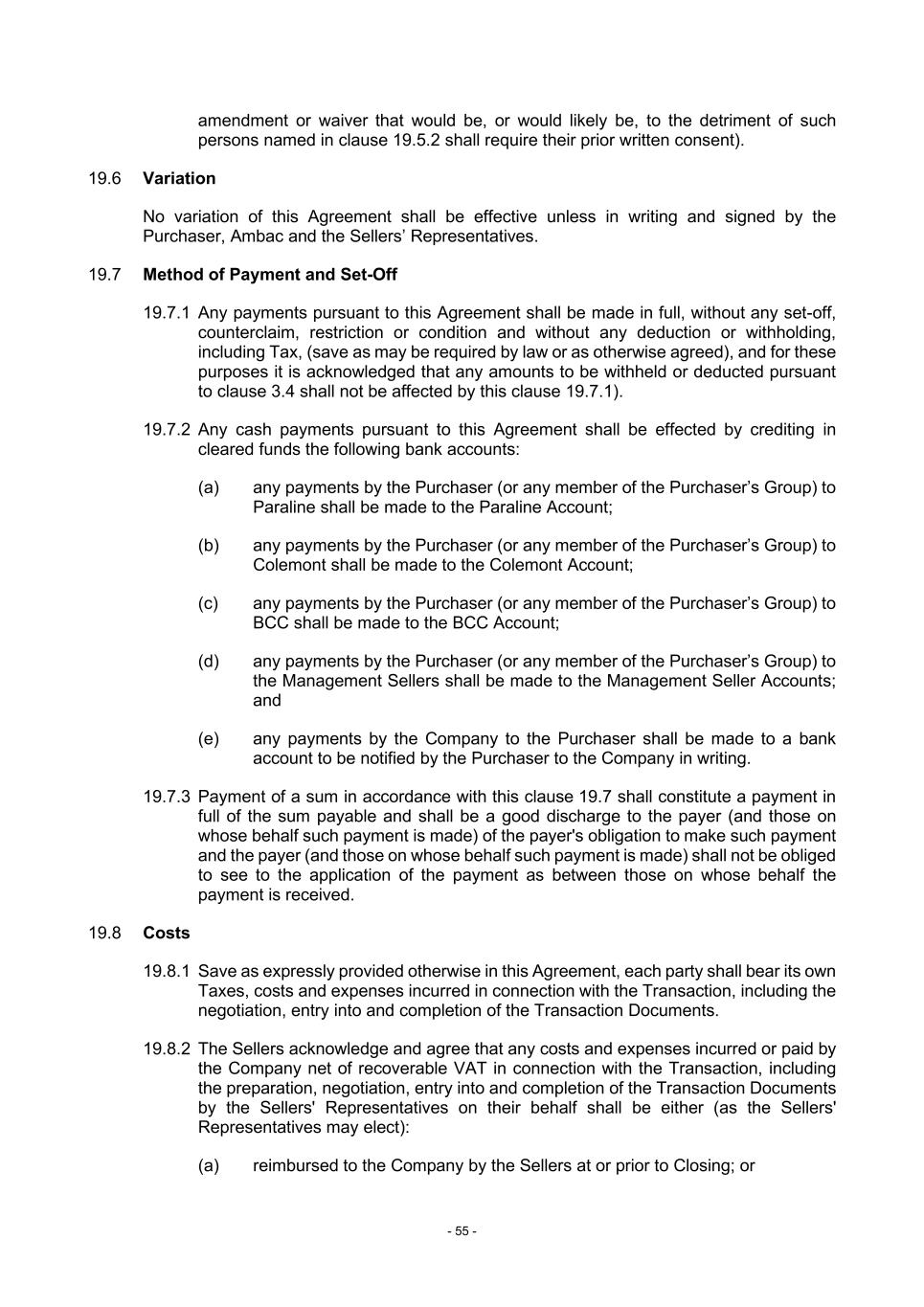 - 55 - amendment or waiver that would be, or would likely be, to the detriment of such persons named in clause 19.5.2 shall require their prior written consent). 19.6 Variation No variation of this Agreement shall be effective unless in writing and signed by the Purchaser, Ambac and the Sellers’ Representatives. 19.7 Method of Payment and Set-Off 19.7.1 Any payments pursuant to this Agreement shall be made in full, without any set-off, counterclaim, restriction or condition and without any deduction or withholding, including Tax, (save as may be required by law or as otherwise agreed), and for these purposes it is acknowledged that any amounts to be withheld or deducted pursuant to clause 3.4 shall not be affected by this clause 19.7.1). 19.7.2 Any cash payments pursuant to this Agreement shall be effected by crediting in cleared funds the following bank accounts: (a) any payments by the Purchaser (or any member of the Purchaser’s Group) to Paraline shall be made to the Paraline Account; (b) any payments by the Purchaser (or any member of the Purchaser’s Group) to Colemont shall be made to the Colemont Account; (c) any payments by the Purchaser (or any member of the Purchaser’s Group) to BCC shall be made to the BCC Account; (d) any payments by the Purchaser (or any member of the Purchaser’s Group) to the Management Sellers shall be made to the Management Seller Accounts; and (e) any payments by the Company to the Purchaser shall be made to a bank account to be notified by the Purchaser to the Company in writing. 19.7.3 Payment of a sum in accordance with this clause 19.7 shall constitute a payment in full of the sum payable and shall be a good discharge to the payer (and those on whose behalf such payment is made) of the payer's obligation to make such payment and the payer (and those on whose behalf such payment is made) shall not be obliged to see to the application of the payment as between those on whose behalf the payment is received. 19.8 Costs 19.8.1 Save as expressly provided otherwise in this Agreement, each party shall bear its own Taxes, costs and expenses incurred in connection with the Transaction, including the negotiation, entry into and completion of the Transaction Documents. 19.8.2 The Sellers acknowledge and agree that any costs and expenses incurred or paid by the Company net of recoverable VAT in connection with the Transaction, including the preparation, negotiation, entry into and completion of the Transaction Documents by the Sellers' Representatives on their behalf shall be either (as the Sellers' Representatives may elect): (a) reimbursed to the Company by the Sellers at or prior to Closing; or