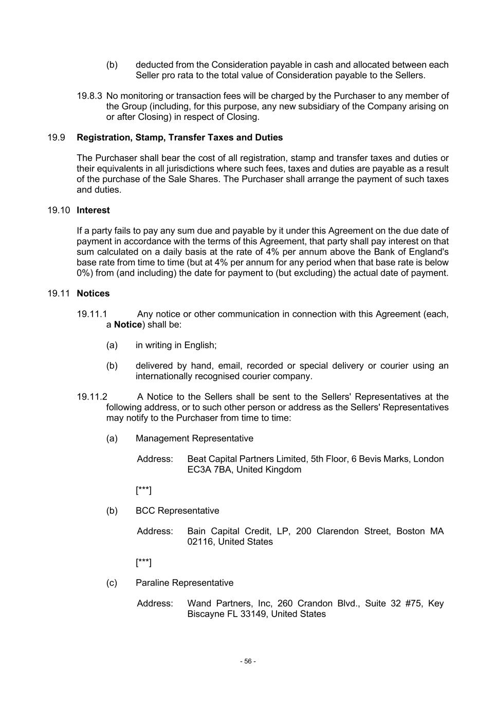 - 56 - (b) deducted from the Consideration payable in cash and allocated between each Seller pro rata to the total value of Consideration payable to the Sellers. 19.8.3 No monitoring or transaction fees will be charged by the Purchaser to any member of the Group (including, for this purpose, any new subsidiary of the Company arising on or after Closing) in respect of Closing. 19.9 Registration, Stamp, Transfer Taxes and Duties The Purchaser shall bear the cost of all registration, stamp and transfer taxes and duties or their equivalents in all jurisdictions where such fees, taxes and duties are payable as a result of the purchase of the Sale Shares. The Purchaser shall arrange the payment of such taxes and duties. 19.10 Interest If a party fails to pay any sum due and payable by it under this Agreement on the due date of payment in accordance with the terms of this Agreement, that party shall pay interest on that sum calculated on a daily basis at the rate of 4% per annum above the Bank of England's base rate from time to time (but at 4% per annum for any period when that base rate is below 0%) from (and including) the date for payment to (but excluding) the actual date of payment. 19.11 Notices 19.11.1 Any notice or other communication in connection with this Agreement (each, a Notice) shall be: (a) in writing in English; (b) delivered by hand, email, recorded or special delivery or courier using an internationally recognised courier company. 19.11.2 A Notice to the Sellers shall be sent to the Sellers' Representatives at the following address, or to such other person or address as the Sellers' Representatives may notify to the Purchaser from time to time: (a) Management Representative Address: Beat Capital Partners Limited, 5th Floor, 6 Bevis Marks, London EC3A 7BA, United Kingdom [***] (b) BCC Representative Address: Bain Capital Credit, LP, 200 Clarendon Street, Boston MA 02116, United States [***] (c) Paraline Representative Address: Wand Partners, Inc, 260 Crandon Blvd., Suite 32 #75, Key Biscayne FL 33149, United States