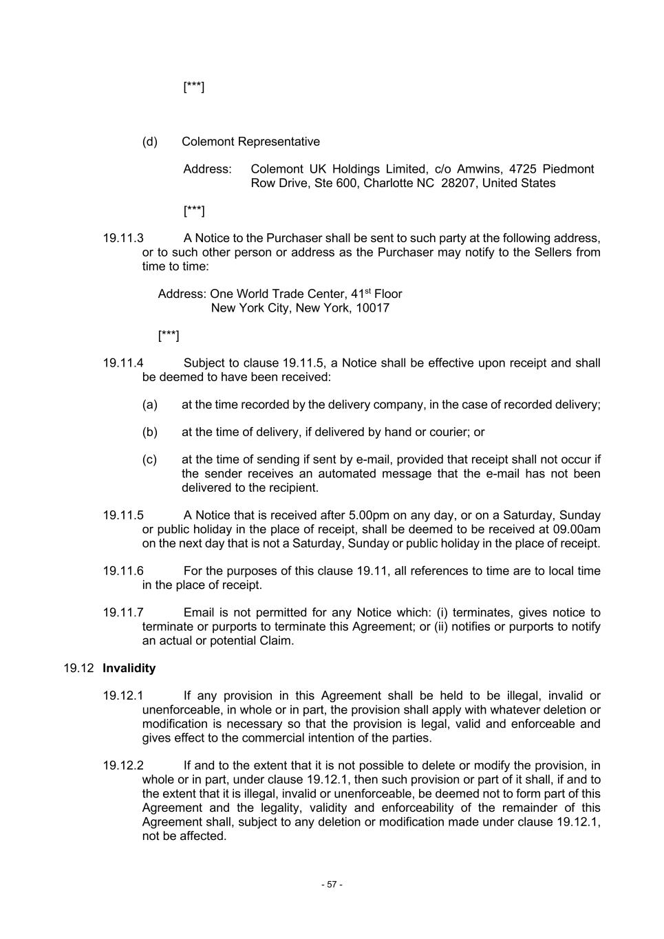 - 57 - [***] (d) Colemont Representative Address: Colemont UK Holdings Limited, c/o Amwins, 4725 Piedmont Row Drive, Ste 600, Charlotte NC 28207, United States [***] 19.11.3 A Notice to the Purchaser shall be sent to such party at the following address, or to such other person or address as the Purchaser may notify to the Sellers from time to time: Address: One World Trade Center, 41st Floor New York City, New York, 10017 [***] 19.11.4 Subject to clause 19.11.5, a Notice shall be effective upon receipt and shall be deemed to have been received: (a) at the time recorded by the delivery company, in the case of recorded delivery; (b) at the time of delivery, if delivered by hand or courier; or (c) at the time of sending if sent by e-mail, provided that receipt shall not occur if the sender receives an automated message that the e-mail has not been delivered to the recipient. 19.11.5 A Notice that is received after 5.00pm on any day, or on a Saturday, Sunday or public holiday in the place of receipt, shall be deemed to be received at 09.00am on the next day that is not a Saturday, Sunday or public holiday in the place of receipt. 19.11.6 For the purposes of this clause 19.11, all references to time are to local time in the place of receipt. 19.11.7 Email is not permitted for any Notice which: (i) terminates, gives notice to terminate or purports to terminate this Agreement; or (ii) notifies or purports to notify an actual or potential Claim. 19.12 Invalidity 19.12.1 If any provision in this Agreement shall be held to be illegal, invalid or unenforceable, in whole or in part, the provision shall apply with whatever deletion or modification is necessary so that the provision is legal, valid and enforceable and gives effect to the commercial intention of the parties. 19.12.2 If and to the extent that it is not possible to delete or modify the provision, in whole or in part, under clause 19.12.1, then such provision or part of it shall, if and to the extent that it is illegal, invalid or unenforceable, be deemed not to form part of this Agreement and the legality, validity and enforceability of the remainder of this Agreement shall, subject to any deletion or modification made under clause 19.12.1, not be affected.