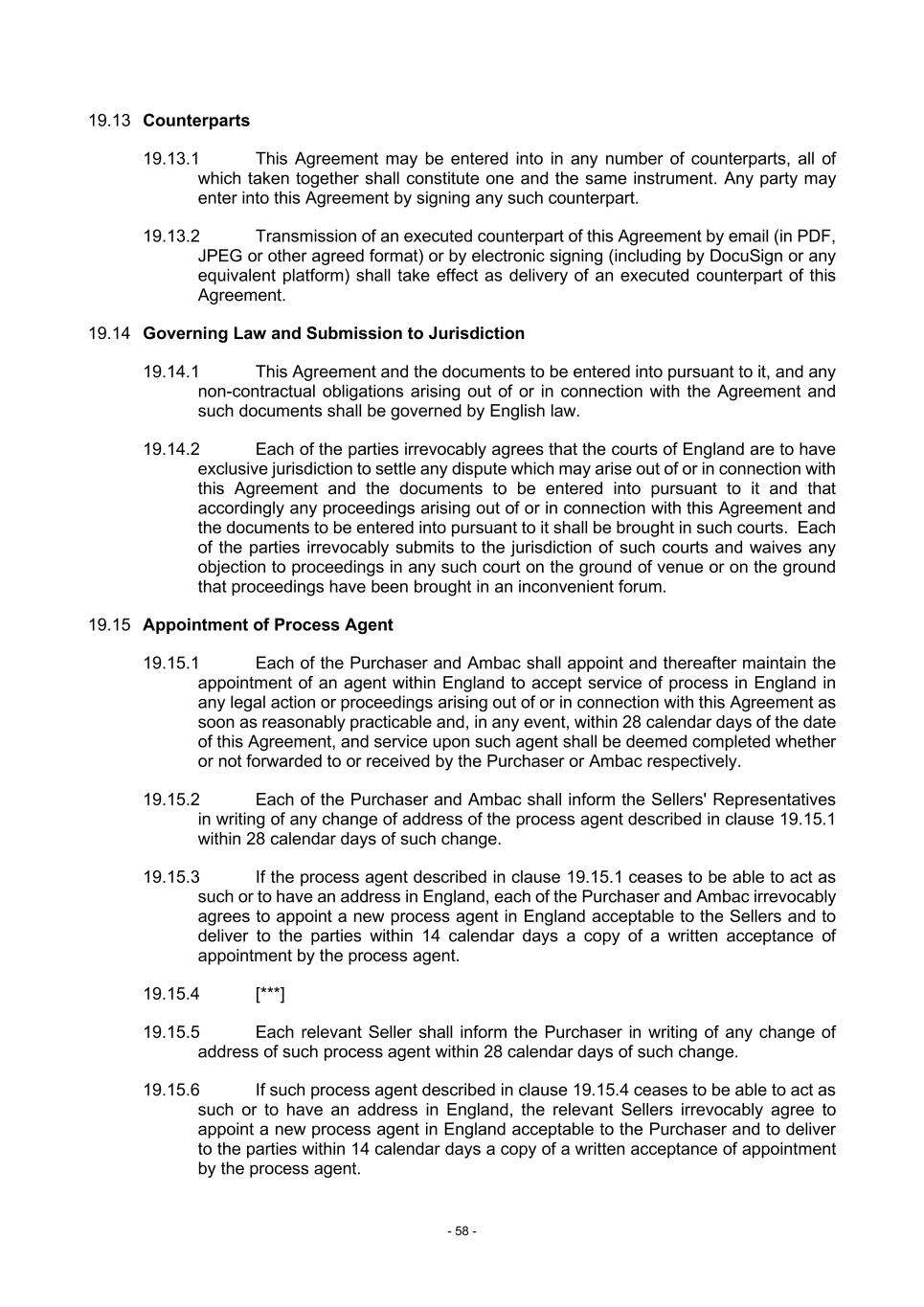 - 58 - 19.13 Counterparts 19.13.1 This Agreement may be entered into in any number of counterparts, all of which taken together shall constitute one and the same instrument. Any party may enter into this Agreement by signing any such counterpart. 19.13.2 Transmission of an executed counterpart of this Agreement by email (in PDF, JPEG or other agreed format) or by electronic signing (including by DocuSign or any equivalent platform) shall take effect as delivery of an executed counterpart of this Agreement. 19.14 Governing Law and Submission to Jurisdiction 19.14.1 This Agreement and the documents to be entered into pursuant to it, and any non-contractual obligations arising out of or in connection with the Agreement and such documents shall be governed by English law. 19.14.2 Each of the parties irrevocably agrees that the courts of England are to have exclusive jurisdiction to settle any dispute which may arise out of or in connection with this Agreement and the documents to be entered into pursuant to it and that accordingly any proceedings arising out of or in connection with this Agreement and the documents to be entered into pursuant to it shall be brought in such courts. Each of the parties irrevocably submits to the jurisdiction of such courts and waives any objection to proceedings in any such court on the ground of venue or on the ground that proceedings have been brought in an inconvenient forum. 19.15 Appointment of Process Agent 19.15.1 Each of the Purchaser and Ambac shall appoint and thereafter maintain the appointment of an agent within England to accept service of process in England in any legal action or proceedings arising out of or in connection with this Agreement as soon as reasonably practicable and, in any event, within 28 calendar days of the date of this Agreement, and service upon such agent shall be deemed completed whether or not forwarded to or received by the Purchaser or Ambac respectively. 19.15.2 Each of the Purchaser and Ambac shall inform the Sellers' Representatives in writing of any change of address of the process agent described in clause 19.15.1 within 28 calendar days of such change. 19.15.3 If the process agent described in clause 19.15.1 ceases to be able to act as such or to have an address in England, each of the Purchaser and Ambac irrevocably agrees to appoint a new process agent in England acceptable to the Sellers and to deliver to the parties within 14 calendar days a copy of a written acceptance of appointment by the process agent. 19.15.4 [***] 19.15.5 Each relevant Seller shall inform the Purchaser in writing of any change of address of such process agent within 28 calendar days of such change. 19.15.6 If such process agent described in clause 19.15.4 ceases to be able to act as such or to have an address in England, the relevant Sellers irrevocably agree to appoint a new process agent in England acceptable to the Purchaser and to deliver to the parties within 14 calendar days a copy of a written acceptance of appointment by the process agent.