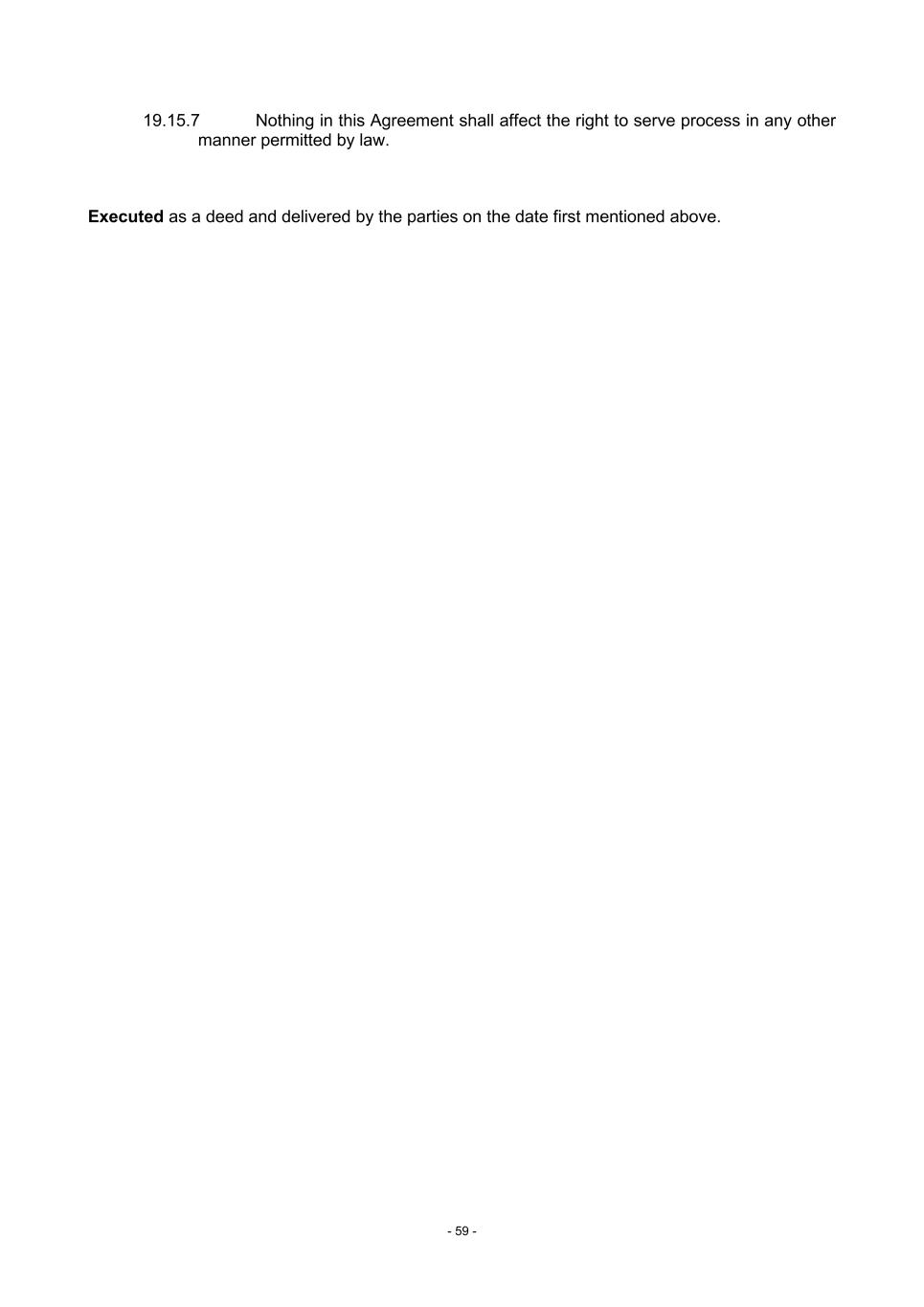 - 59 - 19.15.7 Nothing in this Agreement shall affect the right to serve process in any other manner permitted by law. Executed as a deed and delivered by the parties on the date first mentioned above.