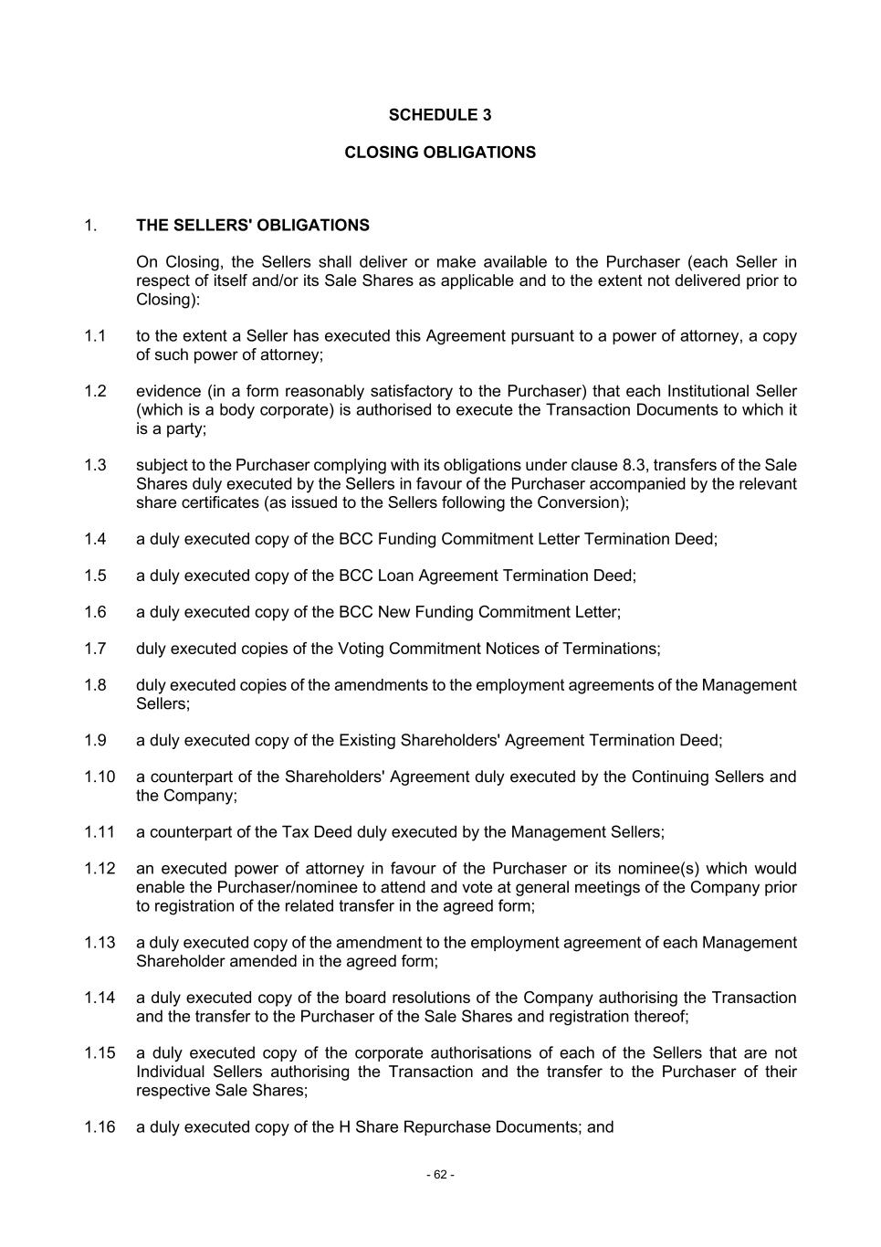- 62 - SCHEDULE 3 CLOSING OBLIGATIONS 1. THE SELLERS' OBLIGATIONS On Closing, the Sellers shall deliver or make available to the Purchaser (each Seller in respect of itself and/or its Sale Shares as applicable and to the extent not delivered prior to Closing): 1.1 to the extent a Seller has executed this Agreement pursuant to a power of attorney, a copy of such power of attorney; 1.2 evidence (in a form reasonably satisfactory to the Purchaser) that each Institutional Seller (which is a body corporate) is authorised to execute the Transaction Documents to which it is a party; 1.3 subject to the Purchaser complying with its obligations under clause 8.3, transfers of the Sale Shares duly executed by the Sellers in favour of the Purchaser accompanied by the relevant share certificates (as issued to the Sellers following the Conversion); 1.4 a duly executed copy of the BCC Funding Commitment Letter Termination Deed; 1.5 a duly executed copy of the BCC Loan Agreement Termination Deed; 1.6 a duly executed copy of the BCC New Funding Commitment Letter; 1.7 duly executed copies of the Voting Commitment Notices of Terminations; 1.8 duly executed copies of the amendments to the employment agreements of the Management Sellers; 1.9 a duly executed copy of the Existing Shareholders' Agreement Termination Deed; 1.10 a counterpart of the Shareholders' Agreement duly executed by the Continuing Sellers and the Company; 1.11 a counterpart of the Tax Deed duly executed by the Management Sellers; 1.12 an executed power of attorney in favour of the Purchaser or its nominee(s) which would enable the Purchaser/nominee to attend and vote at general meetings of the Company prior to registration of the related transfer in the agreed form; 1.13 a duly executed copy of the amendment to the employment agreement of each Management Shareholder amended in the agreed form; 1.14 a duly executed copy of the board resolutions of the Company authorising the Transaction and the transfer to the Purchaser of the Sale Shares and registration thereof; 1.15 a duly executed copy of the corporate authorisations of each of the Sellers that are not Individual Sellers authorising the Transaction and the transfer to the Purchaser of their respective Sale Shares; 1.16 a duly executed copy of the H Share Repurchase Documents; and