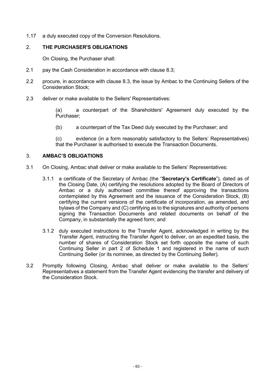 - 63 - 1.17 a duly executed copy of the Conversion Resolutions. 2. THE PURCHASER'S OBLIGATIONS On Closing, the Purchaser shall: 2.1 pay the Cash Consideration in accordance with clause 8.3; 2.2 procure, in accordance with clause 8.3, the issue by Ambac to the Continuing Sellers of the Consideration Stock; 2.3 deliver or make available to the Sellers' Representatives: (a) a counterpart of the Shareholders' Agreement duly executed by the Purchaser; (b) a counterpart of the Tax Deed duly executed by the Purchaser; and (c) evidence (in a form reasonably satisfactory to the Sellers’ Representatives) that the Purchaser is authorised to execute the Transaction Documents. 3. AMBAC’S OBLIGATIONS 3.1 On Closing, Ambac shall deliver or make available to the Sellers’ Representatives: 3.1.1 a certificate of the Secretary of Ambac (the “Secretary’s Certificate”), dated as of the Closing Date, (A) certifying the resolutions adopted by the Board of Directors of Ambac or a duly authorised committee thereof approving the transactions contemplated by this Agreement and the issuance of the Consideration Stock, (B) certifying the current versions of the certificate of incorporation, as amended, and bylaws of the Company and (C) certifying as to the signatures and authority of persons signing the Transaction Documents and related documents on behalf of the Company, in substantially the agreed form; and 3.1.2 duly executed instructions to the Transfer Agent, acknowledged in writing by the Transfer Agent, instructing the Transfer Agent to deliver, on an expedited basis, the number of shares of Consideration Stock set forth opposite the name of such Continuing Seller in part 2 of Schedule 1 and registered in the name of such Continuing Seller (or its nominee, as directed by the Continuing Seller). 3.2 Promptly following Closing, Ambac shall deliver or make available to the Sellers’ Representatives a statement from the Transfer Agent evidencing the transfer and delivery of the Consideration Stock.