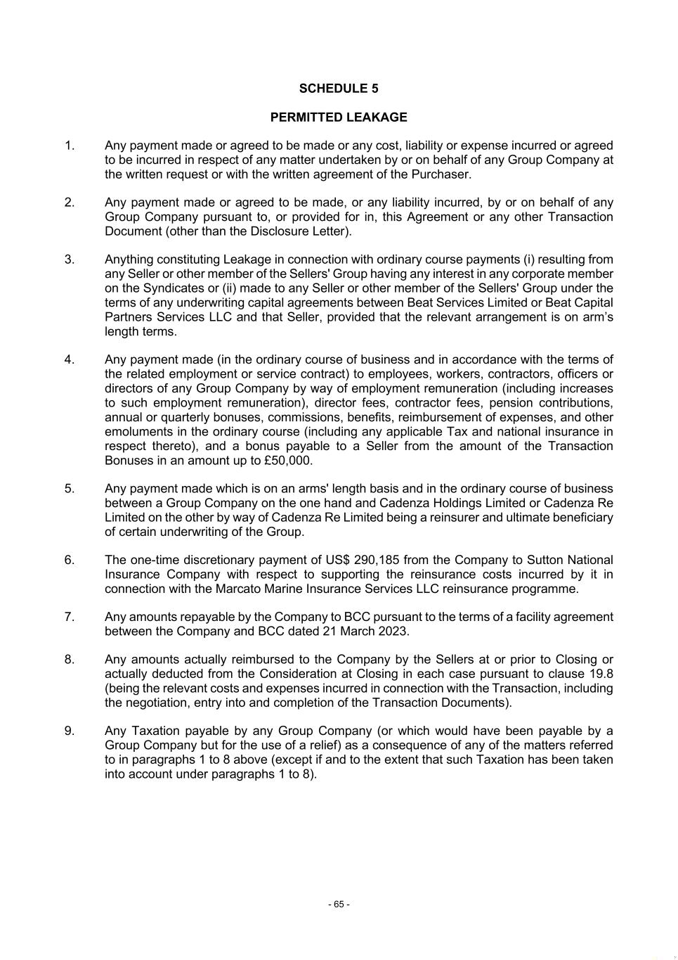 - 65 - SCHEDULE 5 PERMITTED LEAKAGE 1. Any payment made or agreed to be made or any cost, liability or expense incurred or agreed to be incurred in respect of any matter undertaken by or on behalf of any Group Company at the written request or with the written agreement of the Purchaser. 2. Any payment made or agreed to be made, or any liability incurred, by or on behalf of any Group Company pursuant to, or provided for in, this Agreement or any other Transaction Document (other than the Disclosure Letter). 3. Anything constituting Leakage in connection with ordinary course payments (i) resulting from any Seller or other member of the Sellers' Group having any interest in any corporate member on the Syndicates or (ii) made to any Seller or other member of the Sellers' Group under the terms of any underwriting capital agreements between Beat Services Limited or Beat Capital Partners Services LLC and that Seller, provided that the relevant arrangement is on arm’s length terms. 4. Any payment made (in the ordinary course of business and in accordance with the terms of the related employment or service contract) to employees, workers, contractors, officers or directors of any Group Company by way of employment remuneration (including increases to such employment remuneration), director fees, contractor fees, pension contributions, annual or quarterly bonuses, commissions, benefits, reimbursement of expenses, and other emoluments in the ordinary course (including any applicable Tax and national insurance in respect thereto), and a bonus payable to a Seller from the amount of the Transaction Bonuses in an amount up to £50,000. 5. Any payment made which is on an arms' length basis and in the ordinary course of business between a Group Company on the one hand and Cadenza Holdings Limited or Cadenza Re Limited on the other by way of Cadenza Re Limited being a reinsurer and ultimate beneficiary of certain underwriting of the Group. 6. The one-time discretionary payment of US$ 290,185 from the Company to Sutton National Insurance Company with respect to supporting the reinsurance costs incurred by it in connection with the Marcato Marine Insurance Services LLC reinsurance programme. 7. Any amounts repayable by the Company to BCC pursuant to the terms of a facility agreement between the Company and BCC dated 21 March 2023. 8. Any amounts actually reimbursed to the Company by the Sellers at or prior to Closing or actually deducted from the Consideration at Closing in each case pursuant to clause 19.8 (being the relevant costs and expenses incurred in connection with the Transaction, including the negotiation, entry into and completion of the Transaction Documents). 9. Any Taxation payable by any Group Company (or which would have been payable by a Group Company but for the use of a relief) as a consequence of any of the matters referred to in paragraphs 1 to 8 above (except if and to the extent that such Taxation has been taken into account under paragraphs 1 to 8).