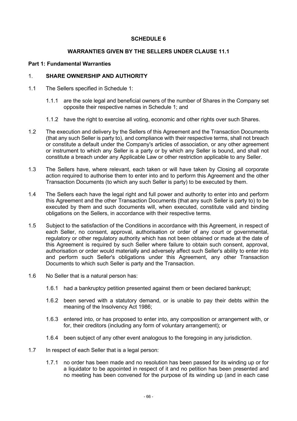 - 66 - SCHEDULE 6 WARRANTIES GIVEN BY THE SELLERS UNDER CLAUSE 11.1 Part 1: Fundamental Warranties 1. SHARE OWNERSHIP AND AUTHORITY 1.1 The Sellers specified in Schedule 1: 1.1.1 are the sole legal and beneficial owners of the number of Shares in the Company set opposite their respective names in Schedule 1; and 1.1.2 have the right to exercise all voting, economic and other rights over such Shares. 1.2 The execution and delivery by the Sellers of this Agreement and the Transaction Documents (that any such Seller is party to), and compliance with their respective terms, shall not breach or constitute a default under the Company's articles of association, or any other agreement or instrument to which any Seller is a party or by which any Seller is bound, and shall not constitute a breach under any Applicable Law or other restriction applicable to any Seller. 1.3 The Sellers have, where relevant, each taken or will have taken by Closing all corporate action required to authorise them to enter into and to perform this Agreement and the other Transaction Documents (to which any such Seller is party) to be executed by them. 1.4 The Sellers each have the legal right and full power and authority to enter into and perform this Agreement and the other Transaction Documents (that any such Seller is party to) to be executed by them and such documents will, when executed, constitute valid and binding obligations on the Sellers, in accordance with their respective terms. 1.5 Subject to the satisfaction of the Conditions in accordance with this Agreement, in respect of each Seller, no consent, approval, authorisation or order of any court or governmental, regulatory or other regulatory authority which has not been obtained or made at the date of this Agreement is required by such Seller where failure to obtain such consent, approval, authorisation or order would materially and adversely affect such Seller's ability to enter into and perform such Seller's obligations under this Agreement, any other Transaction Documents to which such Seller is party and the Transaction. 1.6 No Seller that is a natural person has: 1.6.1 had a bankruptcy petition presented against them or been declared bankrupt; 1.6.2 been served with a statutory demand, or is unable to pay their debts within the meaning of the Insolvency Act 1986; 1.6.3 entered into, or has proposed to enter into, any composition or arrangement with, or for, their creditors (including any form of voluntary arrangement); or 1.6.4 been subject of any other event analogous to the foregoing in any jurisdiction. 1.7 In respect of each Seller that is a legal person: 1.7.1 no order has been made and no resolution has been passed for its winding up or for a liquidator to be appointed in respect of it and no petition has been presented and no meeting has been convened for the purpose of its winding up (and in each case