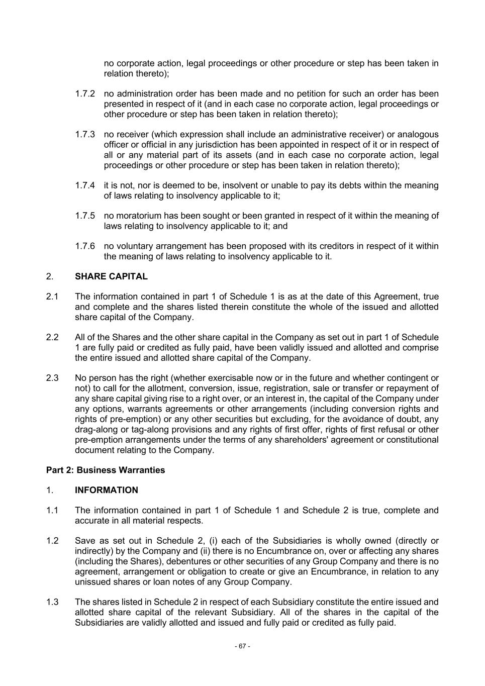 - 67 - no corporate action, legal proceedings or other procedure or step has been taken in relation thereto); 1.7.2 no administration order has been made and no petition for such an order has been presented in respect of it (and in each case no corporate action, legal proceedings or other procedure or step has been taken in relation thereto); 1.7.3 no receiver (which expression shall include an administrative receiver) or analogous officer or official in any jurisdiction has been appointed in respect of it or in respect of all or any material part of its assets (and in each case no corporate action, legal proceedings or other procedure or step has been taken in relation thereto); 1.7.4 it is not, nor is deemed to be, insolvent or unable to pay its debts within the meaning of laws relating to insolvency applicable to it; 1.7.5 no moratorium has been sought or been granted in respect of it within the meaning of laws relating to insolvency applicable to it; and 1.7.6 no voluntary arrangement has been proposed with its creditors in respect of it within the meaning of laws relating to insolvency applicable to it. 2. SHARE CAPITAL 2.1 The information contained in part 1 of Schedule 1 is as at the date of this Agreement, true and complete and the shares listed therein constitute the whole of the issued and allotted share capital of the Company. 2.2 All of the Shares and the other share capital in the Company as set out in part 1 of Schedule 1 are fully paid or credited as fully paid, have been validly issued and allotted and comprise the entire issued and allotted share capital of the Company. 2.3 No person has the right (whether exercisable now or in the future and whether contingent or not) to call for the allotment, conversion, issue, registration, sale or transfer or repayment of any share capital giving rise to a right over, or an interest in, the capital of the Company under any options, warrants agreements or other arrangements (including conversion rights and rights of pre-emption) or any other securities but excluding, for the avoidance of doubt, any drag-along or tag-along provisions and any rights of first offer, rights of first refusal or other pre-emption arrangements under the terms of any shareholders' agreement or constitutional document relating to the Company. Part 2: Business Warranties 1. INFORMATION 1.1 The information contained in part 1 of Schedule 1 and Schedule 2 is true, complete and accurate in all material respects. 1.2 Save as set out in Schedule 2, (i) each of the Subsidiaries is wholly owned (directly or indirectly) by the Company and (ii) there is no Encumbrance on, over or affecting any shares (including the Shares), debentures or other securities of any Group Company and there is no agreement, arrangement or obligation to create or give an Encumbrance, in relation to any unissued shares or loan notes of any Group Company. 1.3 The shares listed in Schedule 2 in respect of each Subsidiary constitute the entire issued and allotted share capital of the relevant Subsidiary. All of the shares in the capital of the Subsidiaries are validly allotted and issued and fully paid or credited as fully paid.