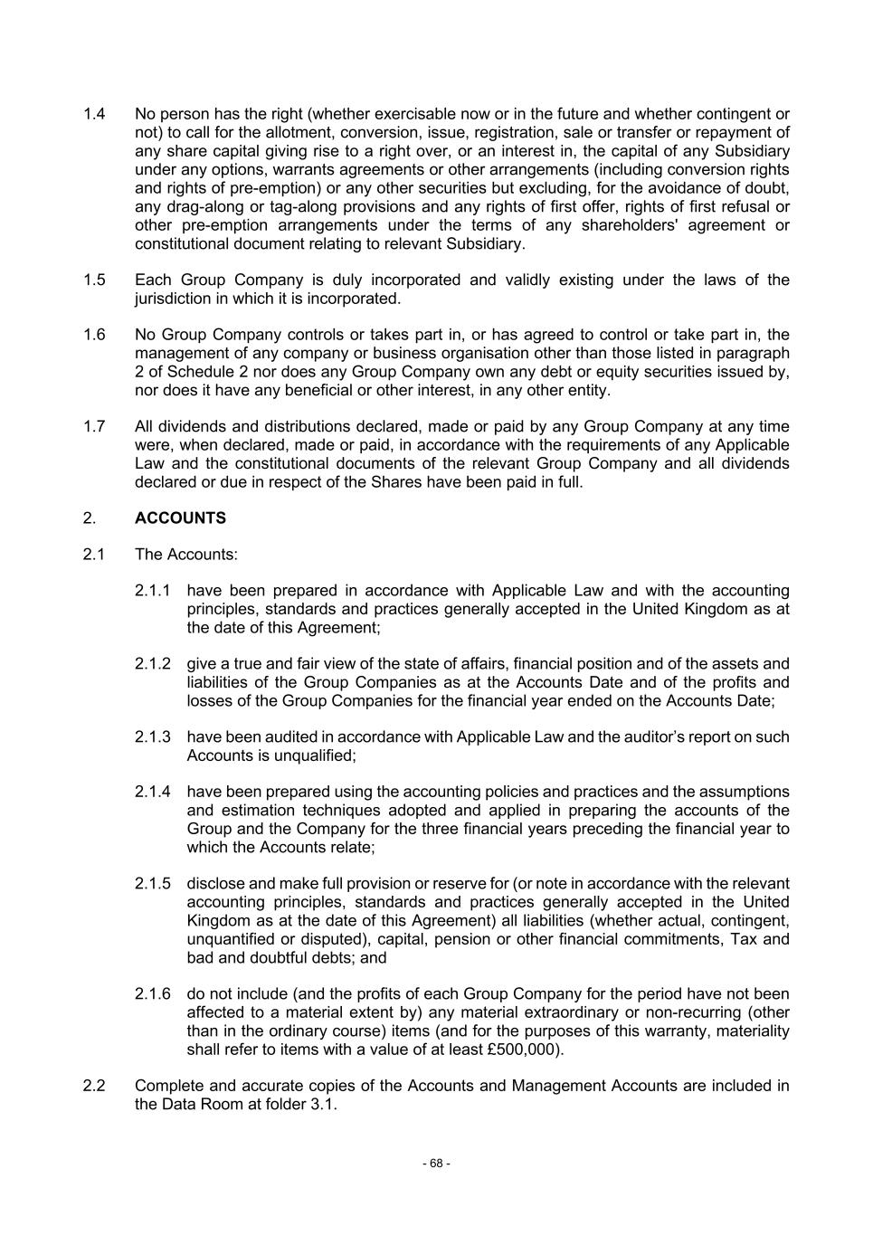 - 68 - 1.4 No person has the right (whether exercisable now or in the future and whether contingent or not) to call for the allotment, conversion, issue, registration, sale or transfer or repayment of any share capital giving rise to a right over, or an interest in, the capital of any Subsidiary under any options, warrants agreements or other arrangements (including conversion rights and rights of pre-emption) or any other securities but excluding, for the avoidance of doubt, any drag-along or tag-along provisions and any rights of first offer, rights of first refusal or other pre-emption arrangements under the terms of any shareholders' agreement or constitutional document relating to relevant Subsidiary. 1.5 Each Group Company is duly incorporated and validly existing under the laws of the jurisdiction in which it is incorporated. 1.6 No Group Company controls or takes part in, or has agreed to control or take part in, the management of any company or business organisation other than those listed in paragraph 2 of Schedule 2 nor does any Group Company own any debt or equity securities issued by, nor does it have any beneficial or other interest, in any other entity. 1.7 All dividends and distributions declared, made or paid by any Group Company at any time were, when declared, made or paid, in accordance with the requirements of any Applicable Law and the constitutional documents of the relevant Group Company and all dividends declared or due in respect of the Shares have been paid in full. 2. ACCOUNTS 2.1 The Accounts: 2.1.1 have been prepared in accordance with Applicable Law and with the accounting principles, standards and practices generally accepted in the United Kingdom as at the date of this Agreement; 2.1.2 give a true and fair view of the state of affairs, financial position and of the assets and liabilities of the Group Companies as at the Accounts Date and of the profits and losses of the Group Companies for the financial year ended on the Accounts Date; 2.1.3 have been audited in accordance with Applicable Law and the auditor’s report on such Accounts is unqualified; 2.1.4 have been prepared using the accounting policies and practices and the assumptions and estimation techniques adopted and applied in preparing the accounts of the Group and the Company for the three financial years preceding the financial year to which the Accounts relate; 2.1.5 disclose and make full provision or reserve for (or note in accordance with the relevant accounting principles, standards and practices generally accepted in the United Kingdom as at the date of this Agreement) all liabilities (whether actual, contingent, unquantified or disputed), capital, pension or other financial commitments, Tax and bad and doubtful debts; and 2.1.6 do not include (and the profits of each Group Company for the period have not been affected to a material extent by) any material extraordinary or non-recurring (other than in the ordinary course) items (and for the purposes of this warranty, materiality shall refer to items with a value of at least £500,000). 2.2 Complete and accurate copies of the Accounts and Management Accounts are included in the Data Room at folder 3.1.