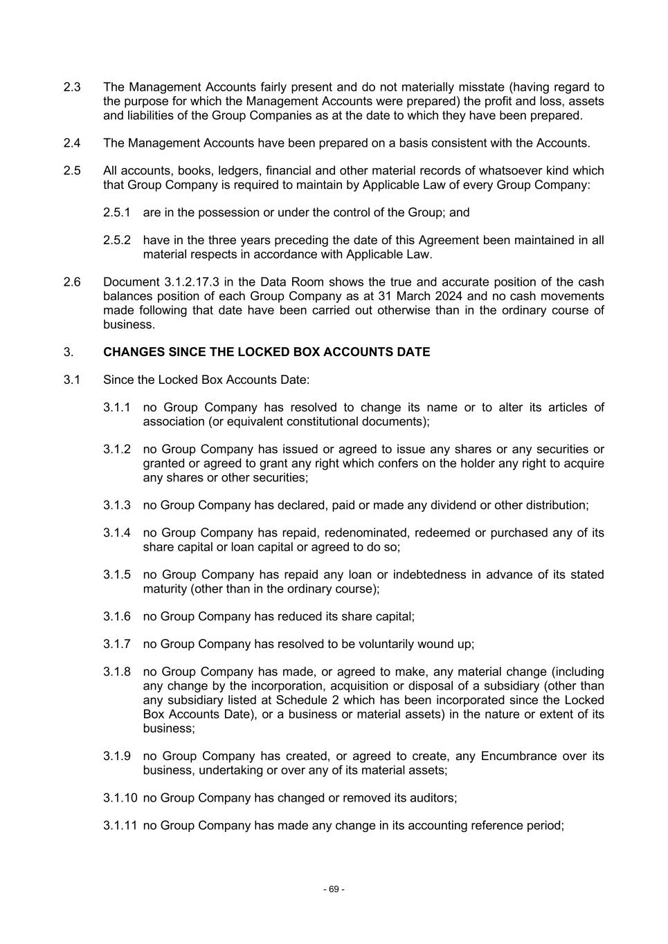 - 69 - 2.3 The Management Accounts fairly present and do not materially misstate (having regard to the purpose for which the Management Accounts were prepared) the profit and loss, assets and liabilities of the Group Companies as at the date to which they have been prepared. 2.4 The Management Accounts have been prepared on a basis consistent with the Accounts. 2.5 All accounts, books, ledgers, financial and other material records of whatsoever kind which that Group Company is required to maintain by Applicable Law of every Group Company: 2.5.1 are in the possession or under the control of the Group; and 2.5.2 have in the three years preceding the date of this Agreement been maintained in all material respects in accordance with Applicable Law. 2.6 Document 3.1.2.17.3 in the Data Room shows the true and accurate position of the cash balances position of each Group Company as at 31 March 2024 and no cash movements made following that date have been carried out otherwise than in the ordinary course of business. 3. CHANGES SINCE THE LOCKED BOX ACCOUNTS DATE 3.1 Since the Locked Box Accounts Date: 3.1.1 no Group Company has resolved to change its name or to alter its articles of association (or equivalent constitutional documents); 3.1.2 no Group Company has issued or agreed to issue any shares or any securities or granted or agreed to grant any right which confers on the holder any right to acquire any shares or other securities; 3.1.3 no Group Company has declared, paid or made any dividend or other distribution; 3.1.4 no Group Company has repaid, redenominated, redeemed or purchased any of its share capital or loan capital or agreed to do so; 3.1.5 no Group Company has repaid any loan or indebtedness in advance of its stated maturity (other than in the ordinary course); 3.1.6 no Group Company has reduced its share capital; 3.1.7 no Group Company has resolved to be voluntarily wound up; 3.1.8 no Group Company has made, or agreed to make, any material change (including any change by the incorporation, acquisition or disposal of a subsidiary (other than any subsidiary listed at Schedule 2 which has been incorporated since the Locked Box Accounts Date), or a business or material assets) in the nature or extent of its business; 3.1.9 no Group Company has created, or agreed to create, any Encumbrance over its business, undertaking or over any of its material assets; 3.1.10 no Group Company has changed or removed its auditors; 3.1.11 no Group Company has made any change in its accounting reference period;