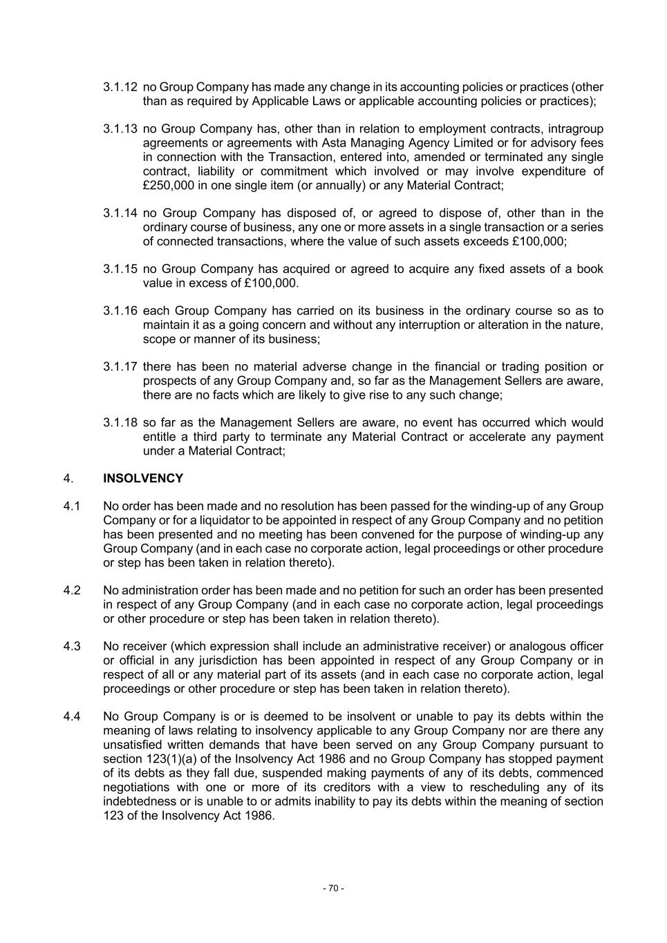 - 70 - 3.1.12 no Group Company has made any change in its accounting policies or practices (other than as required by Applicable Laws or applicable accounting policies or practices); 3.1.13 no Group Company has, other than in relation to employment contracts, intragroup agreements or agreements with Asta Managing Agency Limited or for advisory fees in connection with the Transaction, entered into, amended or terminated any single contract, liability or commitment which involved or may involve expenditure of £250,000 in one single item (or annually) or any Material Contract; 3.1.14 no Group Company has disposed of, or agreed to dispose of, other than in the ordinary course of business, any one or more assets in a single transaction or a series of connected transactions, where the value of such assets exceeds £100,000; 3.1.15 no Group Company has acquired or agreed to acquire any fixed assets of a book value in excess of £100,000. 3.1.16 each Group Company has carried on its business in the ordinary course so as to maintain it as a going concern and without any interruption or alteration in the nature, scope or manner of its business; 3.1.17 there has been no material adverse change in the financial or trading position or prospects of any Group Company and, so far as the Management Sellers are aware, there are no facts which are likely to give rise to any such change; 3.1.18 so far as the Management Sellers are aware, no event has occurred which would entitle a third party to terminate any Material Contract or accelerate any payment under a Material Contract; 4. INSOLVENCY 4.1 No order has been made and no resolution has been passed for the winding-up of any Group Company or for a liquidator to be appointed in respect of any Group Company and no petition has been presented and no meeting has been convened for the purpose of winding-up any Group Company (and in each case no corporate action, legal proceedings or other procedure or step has been taken in relation thereto). 4.2 No administration order has been made and no petition for such an order has been presented in respect of any Group Company (and in each case no corporate action, legal proceedings or other procedure or step has been taken in relation thereto). 4.3 No receiver (which expression shall include an administrative receiver) or analogous officer or official in any jurisdiction has been appointed in respect of any Group Company or in respect of all or any material part of its assets (and in each case no corporate action, legal proceedings or other procedure or step has been taken in relation thereto). 4.4 No Group Company is or is deemed to be insolvent or unable to pay its debts within the meaning of laws relating to insolvency applicable to any Group Company nor are there any unsatisfied written demands that have been served on any Group Company pursuant to section 123(1)(a) of the Insolvency Act 1986 and no Group Company has stopped payment of its debts as they fall due, suspended making payments of any of its debts, commenced negotiations with one or more of its creditors with a view to rescheduling any of its indebtedness or is unable to or admits inability to pay its debts within the meaning of section 123 of the Insolvency Act 1986.