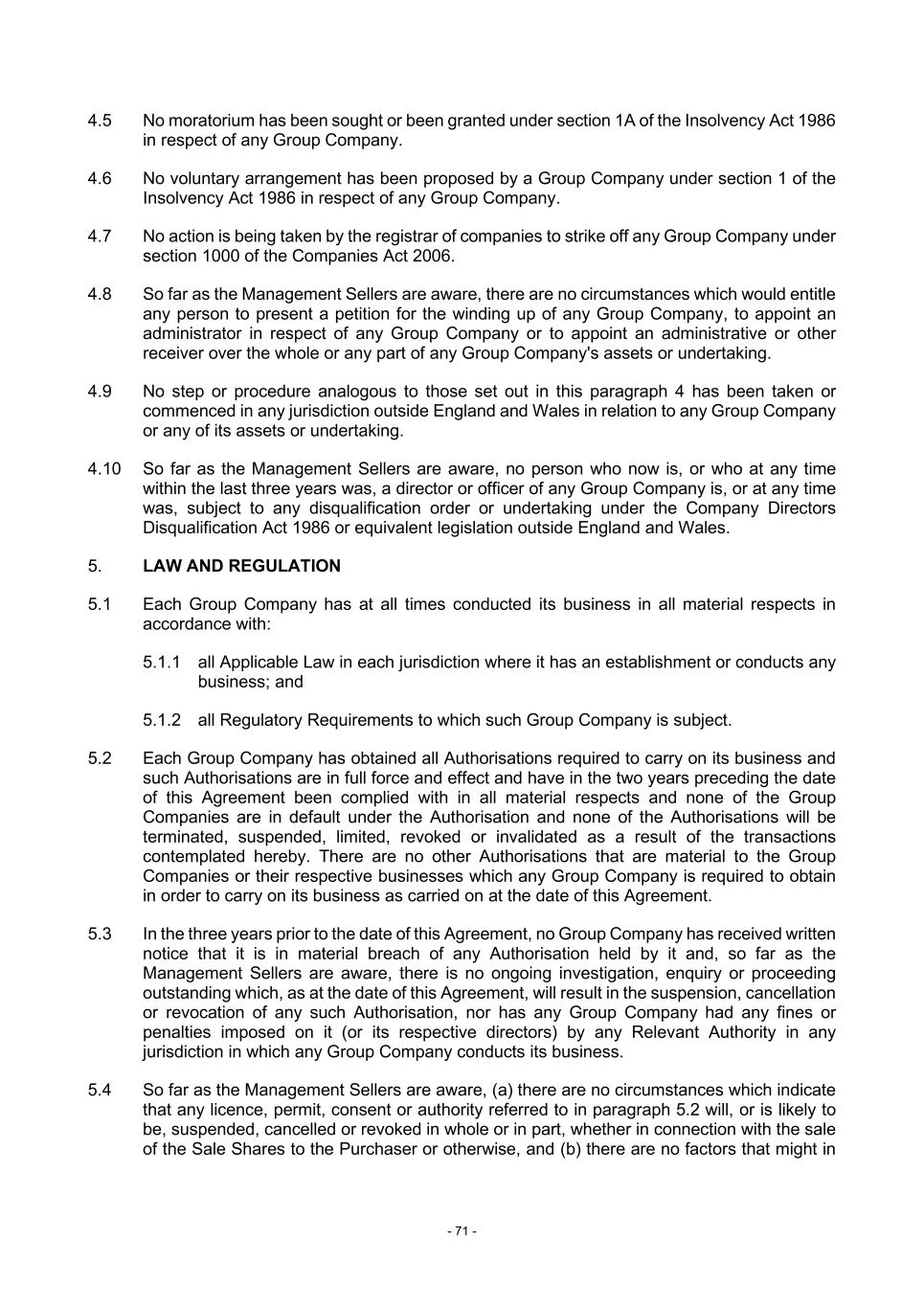 - 71 - 4.5 No moratorium has been sought or been granted under section 1A of the Insolvency Act 1986 in respect of any Group Company. 4.6 No voluntary arrangement has been proposed by a Group Company under section 1 of the Insolvency Act 1986 in respect of any Group Company. 4.7 No action is being taken by the registrar of companies to strike off any Group Company under section 1000 of the Companies Act 2006. 4.8 So far as the Management Sellers are aware, there are no circumstances which would entitle any person to present a petition for the winding up of any Group Company, to appoint an administrator in respect of any Group Company or to appoint an administrative or other receiver over the whole or any part of any Group Company's assets or undertaking. 4.9 No step or procedure analogous to those set out in this paragraph 4 has been taken or commenced in any jurisdiction outside England and Wales in relation to any Group Company or any of its assets or undertaking. 4.10 So far as the Management Sellers are aware, no person who now is, or who at any time within the last three years was, a director or officer of any Group Company is, or at any time was, subject to any disqualification order or undertaking under the Company Directors Disqualification Act 1986 or equivalent legislation outside England and Wales. 5. LAW AND REGULATION 5.1 Each Group Company has at all times conducted its business in all material respects in accordance with: 5.1.1 all Applicable Law in each jurisdiction where it has an establishment or conducts any business; and 5.1.2 all Regulatory Requirements to which such Group Company is subject. 5.2 Each Group Company has obtained all Authorisations required to carry on its business and such Authorisations are in full force and effect and have in the two years preceding the date of this Agreement been complied with in all material respects and none of the Group Companies are in default under the Authorisation and none of the Authorisations will be terminated, suspended, limited, revoked or invalidated as a result of the transactions contemplated hereby. There are no other Authorisations that are material to the Group Companies or their respective businesses which any Group Company is required to obtain in order to carry on its business as carried on at the date of this Agreement. 5.3 In the three years prior to the date of this Agreement, no Group Company has received written notice that it is in material breach of any Authorisation held by it and, so far as the Management Sellers are aware, there is no ongoing investigation, enquiry or proceeding outstanding which, as at the date of this Agreement, will result in the suspension, cancellation or revocation of any such Authorisation, nor has any Group Company had any fines or penalties imposed on it (or its respective directors) by any Relevant Authority in any jurisdiction in which any Group Company conducts its business. 5.4 So far as the Management Sellers are aware, (a) there are no circumstances which indicate that any licence, permit, consent or authority referred to in paragraph 5.2 will, or is likely to be, suspended, cancelled or revoked in whole or in part, whether in connection with the sale of the Sale Shares to the Purchaser or otherwise, and (b) there are no factors that might in