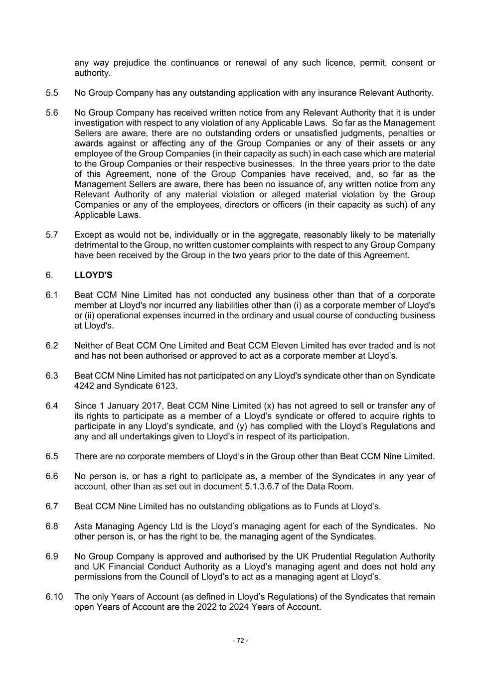 - 72 - any way prejudice the continuance or renewal of any such licence, permit, consent or authority. 5.5 No Group Company has any outstanding application with any insurance Relevant Authority. 5.6 No Group Company has received written notice from any Relevant Authority that it is under investigation with respect to any violation of any Applicable Laws. So far as the Management Sellers are aware, there are no outstanding orders or unsatisfied judgments, penalties or awards against or affecting any of the Group Companies or any of their assets or any employee of the Group Companies (in their capacity as such) in each case which are material to the Group Companies or their respective businesses. In the three years prior to the date of this Agreement, none of the Group Companies have received, and, so far as the Management Sellers are aware, there has been no issuance of, any written notice from any Relevant Authority of any material violation or alleged material violation by the Group Companies or any of the employees, directors or officers (in their capacity as such) of any Applicable Laws. 5.7 Except as would not be, individually or in the aggregate, reasonably likely to be materially detrimental to the Group, no written customer complaints with respect to any Group Company have been received by the Group in the two years prior to the date of this Agreement. 6. LLOYD'S 6.1 Beat CCM Nine Limited has not conducted any business other than that of a corporate member at Lloyd's nor incurred any liabilities other than (i) as a corporate member of Lloyd's or (ii) operational expenses incurred in the ordinary and usual course of conducting business at Lloyd's. 6.2 Neither of Beat CCM One Limited and Beat CCM Eleven Limited has ever traded and is not and has not been authorised or approved to act as a corporate member at Lloyd’s. 6.3 Beat CCM Nine Limited has not participated on any Lloyd's syndicate other than on Syndicate 4242 and Syndicate 6123. 6.4 Since 1 January 2017, Beat CCM Nine Limited (x) has not agreed to sell or transfer any of its rights to participate as a member of a Lloyd’s syndicate or offered to acquire rights to participate in any Lloyd’s syndicate, and (y) has complied with the Lloyd’s Regulations and any and all undertakings given to Lloyd’s in respect of its participation. 6.5 There are no corporate members of Lloyd’s in the Group other than Beat CCM Nine Limited. 6.6 No person is, or has a right to participate as, a member of the Syndicates in any year of account, other than as set out in document 5.1.3.6.7 of the Data Room. 6.7 Beat CCM Nine Limited has no outstanding obligations as to Funds at Lloyd’s. 6.8 Asta Managing Agency Ltd is the Lloyd’s managing agent for each of the Syndicates. No other person is, or has the right to be, the managing agent of the Syndicates. 6.9 No Group Company is approved and authorised by the UK Prudential Regulation Authority and UK Financial Conduct Authority as a Lloyd’s managing agent and does not hold any permissions from the Council of Lloyd’s to act as a managing agent at Lloyd’s. 6.10 The only Years of Account (as defined in Lloyd’s Regulations) of the Syndicates that remain open Years of Account are the 2022 to 2024 Years of Account.