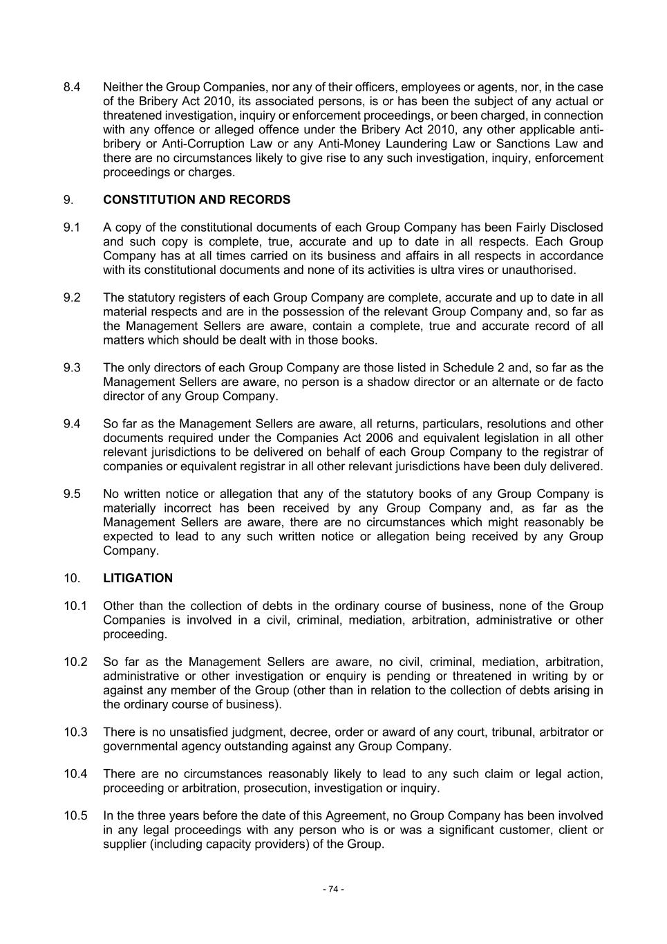 - 74 - 8.4 Neither the Group Companies, nor any of their officers, employees or agents, nor, in the case of the Bribery Act 2010, its associated persons, is or has been the subject of any actual or threatened investigation, inquiry or enforcement proceedings, or been charged, in connection with any offence or alleged offence under the Bribery Act 2010, any other applicable anti- bribery or Anti-Corruption Law or any Anti-Money Laundering Law or Sanctions Law and there are no circumstances likely to give rise to any such investigation, inquiry, enforcement proceedings or charges. 9. CONSTITUTION AND RECORDS 9.1 A copy of the constitutional documents of each Group Company has been Fairly Disclosed and such copy is complete, true, accurate and up to date in all respects. Each Group Company has at all times carried on its business and affairs in all respects in accordance with its constitutional documents and none of its activities is ultra vires or unauthorised. 9.2 The statutory registers of each Group Company are complete, accurate and up to date in all material respects and are in the possession of the relevant Group Company and, so far as the Management Sellers are aware, contain a complete, true and accurate record of all matters which should be dealt with in those books. 9.3 The only directors of each Group Company are those listed in Schedule 2 and, so far as the Management Sellers are aware, no person is a shadow director or an alternate or de facto director of any Group Company. 9.4 So far as the Management Sellers are aware, all returns, particulars, resolutions and other documents required under the Companies Act 2006 and equivalent legislation in all other relevant jurisdictions to be delivered on behalf of each Group Company to the registrar of companies or equivalent registrar in all other relevant jurisdictions have been duly delivered. 9.5 No written notice or allegation that any of the statutory books of any Group Company is materially incorrect has been received by any Group Company and, as far as the Management Sellers are aware, there are no circumstances which might reasonably be expected to lead to any such written notice or allegation being received by any Group Company. 10. LITIGATION 10.1 Other than the collection of debts in the ordinary course of business, none of the Group Companies is involved in a civil, criminal, mediation, arbitration, administrative or other proceeding. 10.2 So far as the Management Sellers are aware, no civil, criminal, mediation, arbitration, administrative or other investigation or enquiry is pending or threatened in writing by or against any member of the Group (other than in relation to the collection of debts arising in the ordinary course of business). 10.3 There is no unsatisfied judgment, decree, order or award of any court, tribunal, arbitrator or governmental agency outstanding against any Group Company. 10.4 There are no circumstances reasonably likely to lead to any such claim or legal action, proceeding or arbitration, prosecution, investigation or inquiry. 10.5 In the three years before the date of this Agreement, no Group Company has been involved in any legal proceedings with any person who is or was a significant customer, client or supplier (including capacity providers) of the Group.