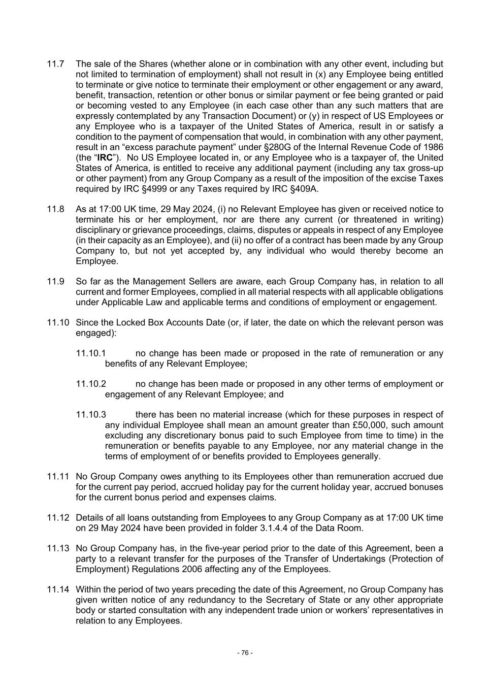 - 76 - 11.7 The sale of the Shares (whether alone or in combination with any other event, including but not limited to termination of employment) shall not result in (x) any Employee being entitled to terminate or give notice to terminate their employment or other engagement or any award, benefit, transaction, retention or other bonus or similar payment or fee being granted or paid or becoming vested to any Employee (in each case other than any such matters that are expressly contemplated by any Transaction Document) or (y) in respect of US Employees or any Employee who is a taxpayer of the United States of America, result in or satisfy a condition to the payment of compensation that would, in combination with any other payment, result in an “excess parachute payment” under §280G of the Internal Revenue Code of 1986 (the “IRC”). No US Employee located in, or any Employee who is a taxpayer of, the United States of America, is entitled to receive any additional payment (including any tax gross-up or other payment) from any Group Company as a result of the imposition of the excise Taxes required by IRC §4999 or any Taxes required by IRC §409A. 11.8 As at 17:00 UK time, 29 May 2024, (i) no Relevant Employee has given or received notice to terminate his or her employment, nor are there any current (or threatened in writing) disciplinary or grievance proceedings, claims, disputes or appeals in respect of any Employee (in their capacity as an Employee), and (ii) no offer of a contract has been made by any Group Company to, but not yet accepted by, any individual who would thereby become an Employee. 11.9 So far as the Management Sellers are aware, each Group Company has, in relation to all current and former Employees, complied in all material respects with all applicable obligations under Applicable Law and applicable terms and conditions of employment or engagement. 11.10 Since the Locked Box Accounts Date (or, if later, the date on which the relevant person was engaged): 11.10.1 no change has been made or proposed in the rate of remuneration or any benefits of any Relevant Employee; 11.10.2 no change has been made or proposed in any other terms of employment or engagement of any Relevant Employee; and 11.10.3 there has been no material increase (which for these purposes in respect of any individual Employee shall mean an amount greater than £50,000, such amount excluding any discretionary bonus paid to such Employee from time to time) in the remuneration or benefits payable to any Employee, nor any material change in the terms of employment of or benefits provided to Employees generally. 11.11 No Group Company owes anything to its Employees other than remuneration accrued due for the current pay period, accrued holiday pay for the current holiday year, accrued bonuses for the current bonus period and expenses claims. 11.12 Details of all loans outstanding from Employees to any Group Company as at 17:00 UK time on 29 May 2024 have been provided in folder 3.1.4.4 of the Data Room. 11.13 No Group Company has, in the five-year period prior to the date of this Agreement, been a party to a relevant transfer for the purposes of the Transfer of Undertakings (Protection of Employment) Regulations 2006 affecting any of the Employees. 11.14 Within the period of two years preceding the date of this Agreement, no Group Company has given written notice of any redundancy to the Secretary of State or any other appropriate body or started consultation with any independent trade union or workers’ representatives in relation to any Employees.