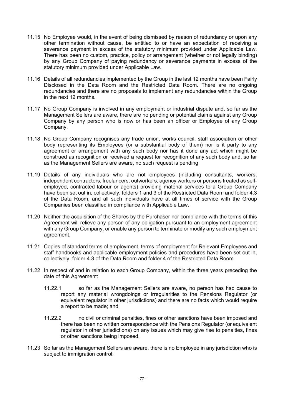 - 77 - 11.15 No Employee would, in the event of being dismissed by reason of redundancy or upon any other termination without cause, be entitled to or have an expectation of receiving a severance payment in excess of the statutory minimum provided under Applicable Law. There has been no custom, practice, policy or arrangement (whether or not legally binding) by any Group Company of paying redundancy or severance payments in excess of the statutory minimum provided under Applicable Law. 11.16 Details of all redundancies implemented by the Group in the last 12 months have been Fairly Disclosed in the Data Room and the Restricted Data Room. There are no ongoing redundancies and there are no proposals to implement any redundancies within the Group in the next 12 months. 11.17 No Group Company is involved in any employment or industrial dispute and, so far as the Management Sellers are aware, there are no pending or potential claims against any Group Company by any person who is now or has been an officer or Employee of any Group Company. 11.18 No Group Company recognises any trade union, works council, staff association or other body representing its Employees (or a substantial body of them) nor is it party to any agreement or arrangement with any such body nor has it done any act which might be construed as recognition or received a request for recognition of any such body and, so far as the Management Sellers are aware, no such request is pending. 11.19 Details of any individuals who are not employees (including consultants, workers, independent contractors, freelancers, outworkers, agency workers or persons treated as self- employed, contracted labour or agents) providing material services to a Group Company have been set out in, collectively, folders 1 and 3 of the Restricted Data Room and folder 4.3 of the Data Room, and all such individuals have at all times of service with the Group Companies been classified in compliance with Applicable Law. 11.20 Neither the acquisition of the Shares by the Purchaser nor compliance with the terms of this Agreement will relieve any person of any obligation pursuant to an employment agreement with any Group Company, or enable any person to terminate or modify any such employment agreement. 11.21 Copies of standard terms of employment, terms of employment for Relevant Employees and staff handbooks and applicable employment policies and procedures have been set out in, collectively, folder 4.3 of the Data Room and folder 4 of the Restricted Data Room. 11.22 In respect of and in relation to each Group Company, within the three years preceding the date of this Agreement: 11.22.1 so far as the Management Sellers are aware, no person has had cause to report any material wrongdoings or irregularities to the Pensions Regulator (or equivalent regulator in other jurisdictions) and there are no facts which would require a report to be made; and 11.22.2 no civil or criminal penalties, fines or other sanctions have been imposed and there has been no written correspondence with the Pensions Regulator (or equivalent regulator in other jurisdictions) on any issues which may give rise to penalties, fines or other sanctions being imposed. 11.23 So far as the Management Sellers are aware, there is no Employee in any jurisdiction who is subject to immigration control:
