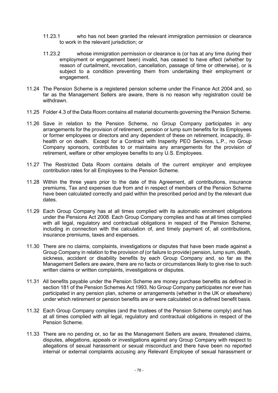 - 78 - 11.23.1 who has not been granted the relevant immigration permission or clearance to work in the relevant jurisdiction; or 11.23.2 whose immigration permission or clearance is (or has at any time during their employment or engagement been) invalid, has ceased to have effect (whether by reason of curtailment, revocation, cancellation, passage of time or otherwise), or is subject to a condition preventing them from undertaking their employment or engagement. 11.24 The Pension Scheme is a registered pension scheme under the Finance Act 2004 and, so far as the Management Sellers are aware, there is no reason why registration could be withdrawn. 11.25 Folder 4.3 of the Data Room contains all material documents governing the Pension Scheme. 11.26 Save in relation to the Pension Scheme, no Group Company participates in any arrangements for the provision of retirement, pension or lump sum benefits for its Employees or former employees or directors and any dependent of these on retirement, incapacity, ill- health or on death. Except for a Contract with Insperity PEO Services, L.P., no Group Company sponsors, contributes to or maintains any arrangements for the provision of retirement, welfare or other employee benefits to any U.S. Employees. 11.27 The Restricted Data Room contains details of the current employer and employee contribution rates for all Employees to the Pension Scheme. 11.28 Within the three years prior to the date of this Agreement, all contributions, insurance premiums, Tax and expenses due from and in respect of members of the Pension Scheme have been calculated correctly and paid within the prescribed period and by the relevant due dates. 11.29 Each Group Company has at all times complied with its automatic enrolment obligations under the Pensions Act 2008. Each Group Company complies and has at all times complied with all legal, regulatory and contractual obligations in respect of the Pension Scheme, including in connection with the calculation of, and timely payment of, all contributions, insurance premiums, taxes and expenses. 11.30 There are no claims, complaints, investigations or disputes that have been made against a Group Company in relation to the provision of (or failure to provide) pension, lump sum, death, sickness, accident or disability benefits by each Group Company and, so far as the Management Sellers are aware, there are no facts or circumstances likely to give rise to such written claims or written complaints, investigations or disputes. 11.31 All benefits payable under the Pension Scheme are money purchase benefits as defined in section 181 of the Pension Schemes Act 1993. No Group Company participates nor ever has participated in any pension plan, scheme or arrangements (whether in the UK or elsewhere) under which retirement or pension benefits are or were calculated on a defined benefit basis. 11.32 Each Group Company complies (and the trustees of the Pension Scheme comply) and has at all times complied with all legal, regulatory and contractual obligations in respect of the Pension Scheme. 11.33 There are no pending or, so far as the Management Sellers are aware, threatened claims, disputes, allegations, appeals or investigations against any Group Company with respect to allegations of sexual harassment or sexual misconduct and there have been no reported internal or external complaints accusing any Relevant Employee of sexual harassment or