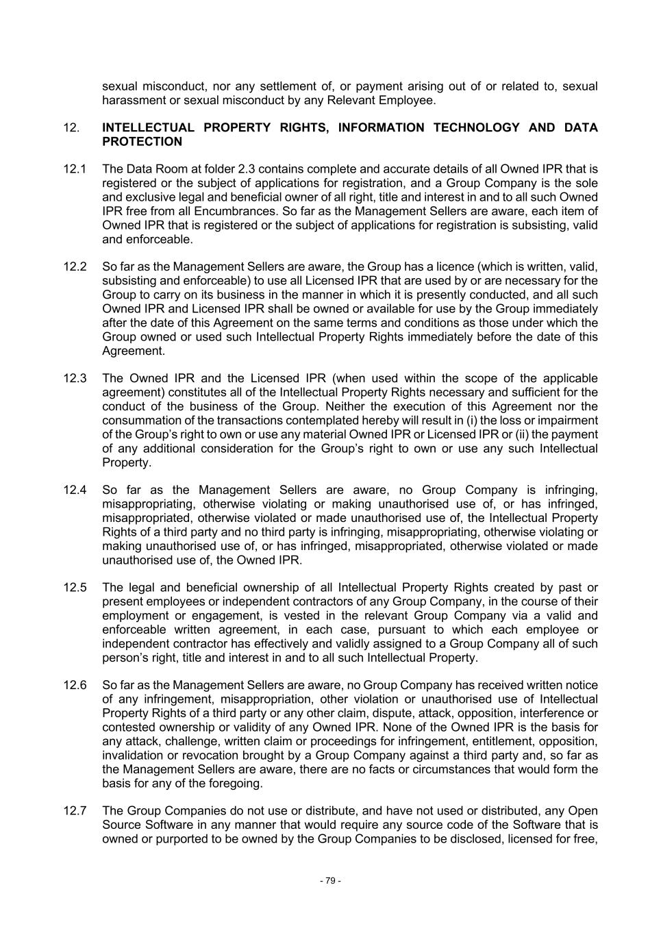 - 79 - sexual misconduct, nor any settlement of, or payment arising out of or related to, sexual harassment or sexual misconduct by any Relevant Employee. 12. INTELLECTUAL PROPERTY RIGHTS, INFORMATION TECHNOLOGY AND DATA PROTECTION 12.1 The Data Room at folder 2.3 contains complete and accurate details of all Owned IPR that is registered or the subject of applications for registration, and a Group Company is the sole and exclusive legal and beneficial owner of all right, title and interest in and to all such Owned IPR free from all Encumbrances. So far as the Management Sellers are aware, each item of Owned IPR that is registered or the subject of applications for registration is subsisting, valid and enforceable. 12.2 So far as the Management Sellers are aware, the Group has a licence (which is written, valid, subsisting and enforceable) to use all Licensed IPR that are used by or are necessary for the Group to carry on its business in the manner in which it is presently conducted, and all such Owned IPR and Licensed IPR shall be owned or available for use by the Group immediately after the date of this Agreement on the same terms and conditions as those under which the Group owned or used such Intellectual Property Rights immediately before the date of this Agreement. 12.3 The Owned IPR and the Licensed IPR (when used within the scope of the applicable agreement) constitutes all of the Intellectual Property Rights necessary and sufficient for the conduct of the business of the Group. Neither the execution of this Agreement nor the consummation of the transactions contemplated hereby will result in (i) the loss or impairment of the Group’s right to own or use any material Owned IPR or Licensed IPR or (ii) the payment of any additional consideration for the Group’s right to own or use any such Intellectual Property. 12.4 So far as the Management Sellers are aware, no Group Company is infringing, misappropriating, otherwise violating or making unauthorised use of, or has infringed, misappropriated, otherwise violated or made unauthorised use of, the Intellectual Property Rights of a third party and no third party is infringing, misappropriating, otherwise violating or making unauthorised use of, or has infringed, misappropriated, otherwise violated or made unauthorised use of, the Owned IPR. 12.5 The legal and beneficial ownership of all Intellectual Property Rights created by past or present employees or independent contractors of any Group Company, in the course of their employment or engagement, is vested in the relevant Group Company via a valid and enforceable written agreement, in each case, pursuant to which each employee or independent contractor has effectively and validly assigned to a Group Company all of such person’s right, title and interest in and to all such Intellectual Property. 12.6 So far as the Management Sellers are aware, no Group Company has received written notice of any infringement, misappropriation, other violation or unauthorised use of Intellectual Property Rights of a third party or any other claim, dispute, attack, opposition, interference or contested ownership or validity of any Owned IPR. None of the Owned IPR is the basis for any attack, challenge, written claim or proceedings for infringement, entitlement, opposition, invalidation or revocation brought by a Group Company against a third party and, so far as the Management Sellers are aware, there are no facts or circumstances that would form the basis for any of the foregoing. 12.7 The Group Companies do not use or distribute, and have not used or distributed, any Open Source Software in any manner that would require any source code of the Software that is owned or purported to be owned by the Group Companies to be disclosed, licensed for free,