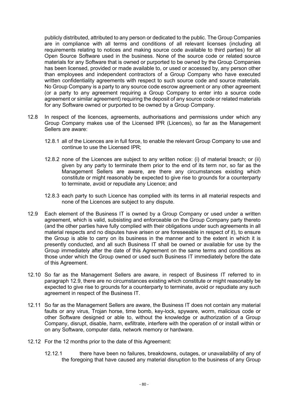 - 80 - publicly distributed, attributed to any person or dedicated to the public. The Group Companies are in compliance with all terms and conditions of all relevant licenses (including all requirements relating to notices and making source code available to third parties) for all Open Source Software used in the business. None of the source code or related source materials for any Software that is owned or purported to be owned by the Group Companies has been licensed, provided or made available to, or used or accessed by, any person other than employees and independent contractors of a Group Company who have executed written confidentiality agreements with respect to such source code and source materials. No Group Company is a party to any source code escrow agreement or any other agreement (or a party to any agreement requiring a Group Company to enter into a source code agreement or similar agreement) requiring the deposit of any source code or related materials for any Software owned or purported to be owned by a Group Company. 12.8 In respect of the licences, agreements, authorisations and permissions under which any Group Company makes use of the Licensed IPR (Licences), so far as the Management Sellers are aware: 12.8.1 all of the Licences are in full force, to enable the relevant Group Company to use and continue to use the Licensed IPR; 12.8.2 none of the Licences are subject to any written notice: (i) of material breach; or (ii) given by any party to terminate them prior to the end of its term nor, so far as the Management Sellers are aware, are there any circumstances existing which constitute or might reasonably be expected to give rise to grounds for a counterparty to terminate, avoid or repudiate any Licence; and 12.8.3 each party to such Licence has complied with its terms in all material respects and none of the Licences are subject to any dispute. 12.9 Each element of the Business IT is owned by a Group Company or used under a written agreement, which is valid, subsisting and enforceable on the Group Company party thereto (and the other parties have fully complied with their obligations under such agreements in all material respects and no disputes have arisen or are foreseeable in respect of it), to ensure the Group is able to carry on its business in the manner and to the extent in which it is presently conducted, and all such Business IT shall be owned or available for use by the Group immediately after the date of this Agreement on the same terms and conditions as those under which the Group owned or used such Business IT immediately before the date of this Agreement. 12.10 So far as the Management Sellers are aware, in respect of Business IT referred to in paragraph 12.9, there are no circumstances existing which constitute or might reasonably be expected to give rise to grounds for a counterparty to terminate, avoid or repudiate any such agreement in respect of the Business IT. 12.11 So far as the Management Sellers are aware, the Business IT does not contain any material faults or any virus, Trojan horse, time bomb, key-lock, spyware, worm, malicious code or other Software designed or able to, without the knowledge or authorization of a Group Company, disrupt, disable, harm, exfiltrate, interfere with the operation of or install within or on any Software, computer data, network memory or hardware. 12.12 For the 12 months prior to the date of this Agreement: 12.12.1 there have been no failures, breakdowns, outages, or unavailability of any of the foregoing that have caused any material disruption to the business of any Group
