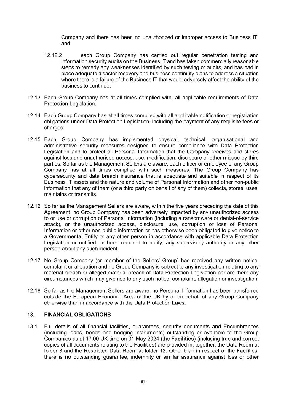 - 81 - Company and there has been no unauthorized or improper access to Business IT; and 12.12.2 each Group Company has carried out regular penetration testing and information security audits on the Business IT and has taken commercially reasonable steps to remedy any weaknesses identified by such testing or audits, and has had in place adequate disaster recovery and business continuity plans to address a situation where there is a failure of the Business IT that would adversely affect the ability of the business to continue. 12.13 Each Group Company has at all times complied with, all applicable requirements of Data Protection Legislation. 12.14 Each Group Company has at all times complied with all applicable notification or registration obligations under Data Protection Legislation, including the payment of any requisite fees or charges. 12.15 Each Group Company has implemented physical, technical, organisational and administrative security measures designed to ensure compliance with Data Protection Legislation and to protect all Personal Information that the Company receives and stores against loss and unauthorised access, use, modification, disclosure or other misuse by third parties. So far as the Management Sellers are aware, each officer or employee of any Group Company has at all times complied with such measures. The Group Company has cybersecurity and data breach insurance that is adequate and suitable in respect of its Business IT assets and the nature and volume of Personal Information and other non-public information that any of them (or a third party on behalf of any of them) collects, stores, uses, maintains or transmits. 12.16 So far as the Management Sellers are aware, within the five years preceding the date of this Agreement, no Group Company has been adversely impacted by any unauthorized access to or use or corruption of Personal Information (including a ransomware or denial-of-service attack), or the unauthorized access, disclosure, use, corruption or loss of Personal Information or other non-public information or has otherwise been obligated to give notice to a Governmental Entity or any other person in accordance with applicable Data Protection Legislation or notified, or been required to notify, any supervisory authority or any other person about any such incident. 12.17 No Group Company (or member of the Sellers' Group) has received any written notice, complaint or allegation and no Group Company is subject to any investigation relating to any material breach or alleged material breach of Data Protection Legislation nor are there any circumstances which may give rise to any such notice, complaint, allegation or investigation. 12.18 So far as the Management Sellers are aware, no Personal Information has been transferred outside the European Economic Area or the UK by or on behalf of any Group Company otherwise than in accordance with the Data Protection Laws. 13. FINANCIAL OBLIGATIONS 13.1 Full details of all financial facilities, guarantees, security documents and Encumbrances (including loans, bonds and hedging instruments) outstanding or available to the Group Companies as at 17:00 UK time on 31 May 2024 (the Facilities) (including true and correct copies of all documents relating to the Facilities) are provided in, together, the Data Room at folder 3 and the Restricted Data Room at folder 12. Other than in respect of the Facilities, there is no outstanding guarantee, indemnity or similar assurance against loss or other