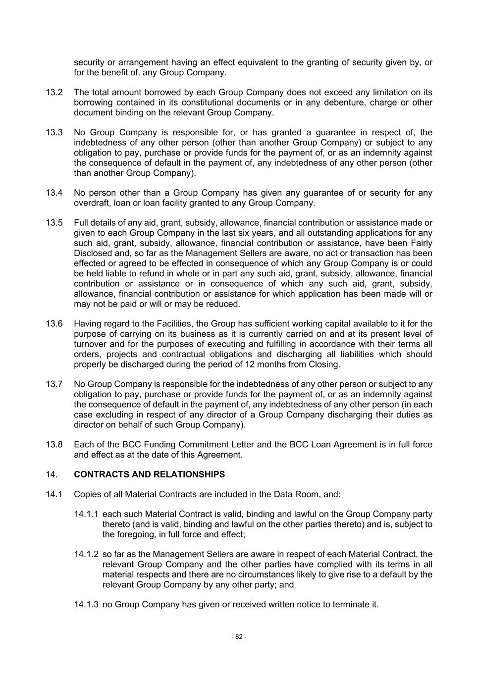 - 82 - security or arrangement having an effect equivalent to the granting of security given by, or for the benefit of, any Group Company. 13.2 The total amount borrowed by each Group Company does not exceed any limitation on its borrowing contained in its constitutional documents or in any debenture, charge or other document binding on the relevant Group Company. 13.3 No Group Company is responsible for, or has granted a guarantee in respect of, the indebtedness of any other person (other than another Group Company) or subject to any obligation to pay, purchase or provide funds for the payment of, or as an indemnity against the consequence of default in the payment of, any indebtedness of any other person (other than another Group Company). 13.4 No person other than a Group Company has given any guarantee of or security for any overdraft, loan or loan facility granted to any Group Company. 13.5 Full details of any aid, grant, subsidy, allowance, financial contribution or assistance made or given to each Group Company in the last six years, and all outstanding applications for any such aid, grant, subsidy, allowance, financial contribution or assistance, have been Fairly Disclosed and, so far as the Management Sellers are aware, no act or transaction has been effected or agreed to be effected in consequence of which any Group Company is or could be held liable to refund in whole or in part any such aid, grant, subsidy, allowance, financial contribution or assistance or in consequence of which any such aid, grant, subsidy, allowance, financial contribution or assistance for which application has been made will or may not be paid or will or may be reduced. 13.6 Having regard to the Facilities, the Group has sufficient working capital available to it for the purpose of carrying on its business as it is currently carried on and at its present level of turnover and for the purposes of executing and fulfilling in accordance with their terms all orders, projects and contractual obligations and discharging all liabilities which should properly be discharged during the period of 12 months from Closing. 13.7 No Group Company is responsible for the indebtedness of any other person or subject to any obligation to pay, purchase or provide funds for the payment of, or as an indemnity against the consequence of default in the payment of, any indebtedness of any other person (in each case excluding in respect of any director of a Group Company discharging their duties as director on behalf of such Group Company). 13.8 Each of the BCC Funding Commitment Letter and the BCC Loan Agreement is in full force and effect as at the date of this Agreement. 14. CONTRACTS AND RELATIONSHIPS 14.1 Copies of all Material Contracts are included in the Data Room, and: 14.1.1 each such Material Contract is valid, binding and lawful on the Group Company party thereto (and is valid, binding and lawful on the other parties thereto) and is, subject to the foregoing, in full force and effect; 14.1.2 so far as the Management Sellers are aware in respect of each Material Contract, the relevant Group Company and the other parties have complied with its terms in all material respects and there are no circumstances likely to give rise to a default by the relevant Group Company by any other party; and 14.1.3 no Group Company has given or received written notice to terminate it.