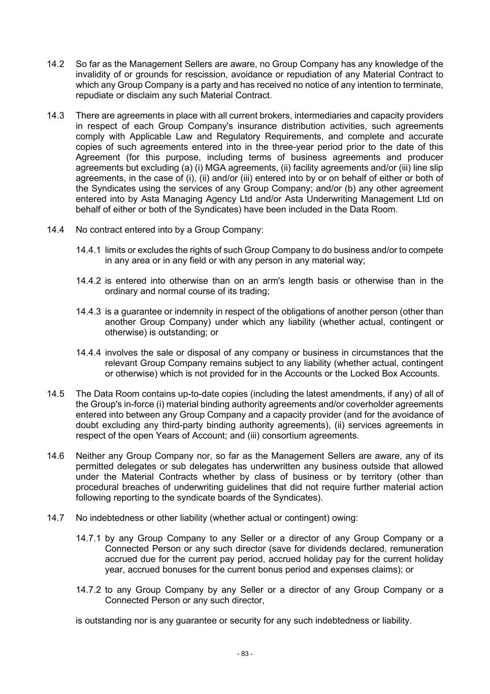 - 83 - 14.2 So far as the Management Sellers are aware, no Group Company has any knowledge of the invalidity of or grounds for rescission, avoidance or repudiation of any Material Contract to which any Group Company is a party and has received no notice of any intention to terminate, repudiate or disclaim any such Material Contract. 14.3 There are agreements in place with all current brokers, intermediaries and capacity providers in respect of each Group Company's insurance distribution activities, such agreements comply with Applicable Law and Regulatory Requirements, and complete and accurate copies of such agreements entered into in the three-year period prior to the date of this Agreement (for this purpose, including terms of business agreements and producer agreements but excluding (a) (i) MGA agreements, (ii) facility agreements and/or (iii) line slip agreements, in the case of (i), (ii) and/or (iii) entered into by or on behalf of either or both of the Syndicates using the services of any Group Company; and/or (b) any other agreement entered into by Asta Managing Agency Ltd and/or Asta Underwriting Management Ltd on behalf of either or both of the Syndicates) have been included in the Data Room. 14.4 No contract entered into by a Group Company: 14.4.1 limits or excludes the rights of such Group Company to do business and/or to compete in any area or in any field or with any person in any material way; 14.4.2 is entered into otherwise than on an arm's length basis or otherwise than in the ordinary and normal course of its trading; 14.4.3 is a guarantee or indemnity in respect of the obligations of another person (other than another Group Company) under which any liability (whether actual, contingent or otherwise) is outstanding; or 14.4.4 involves the sale or disposal of any company or business in circumstances that the relevant Group Company remains subject to any liability (whether actual, contingent or otherwise) which is not provided for in the Accounts or the Locked Box Accounts. 14.5 The Data Room contains up-to-date copies (including the latest amendments, if any) of all of the Group's in-force (i) material binding authority agreements and/or coverholder agreements entered into between any Group Company and a capacity provider (and for the avoidance of doubt excluding any third-party binding authority agreements), (ii) services agreements in respect of the open Years of Account; and (iii) consortium agreements. 14.6 Neither any Group Company nor, so far as the Management Sellers are aware, any of its permitted delegates or sub delegates has underwritten any business outside that allowed under the Material Contracts whether by class of business or by territory (other than procedural breaches of underwriting guidelines that did not require further material action following reporting to the syndicate boards of the Syndicates). 14.7 No indebtedness or other liability (whether actual or contingent) owing: 14.7.1 by any Group Company to any Seller or a director of any Group Company or a Connected Person or any such director (save for dividends declared, remuneration accrued due for the current pay period, accrued holiday pay for the current holiday year, accrued bonuses for the current bonus period and expenses claims); or 14.7.2 to any Group Company by any Seller or a director of any Group Company or a Connected Person or any such director, is outstanding nor is any guarantee or security for any such indebtedness or liability.